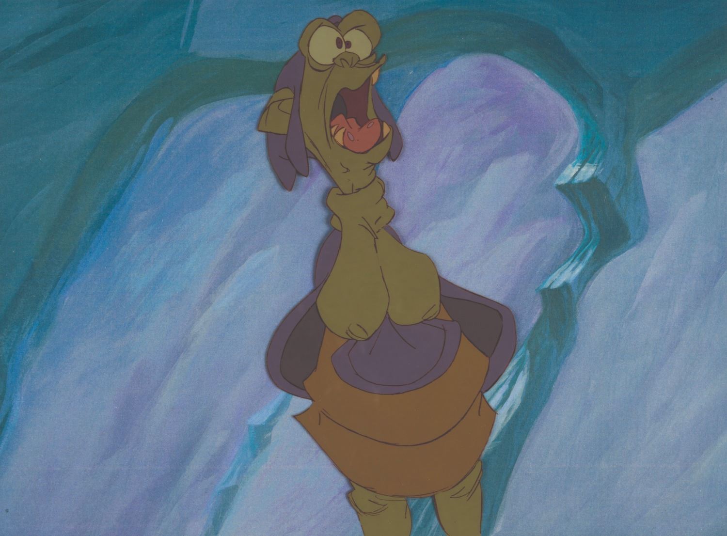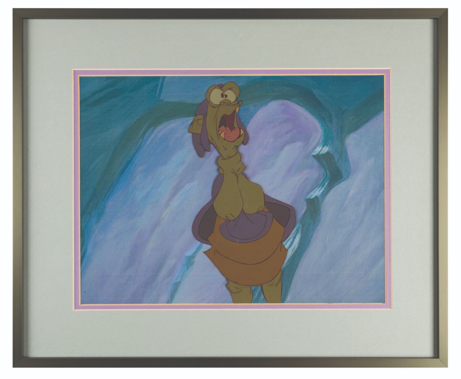 (Disney, 1985) An original hand-painted production cel of Creeper from “The Black Cauldron.” With a character image size of 10” x 4.75” in a 10.25” x 13.75” opening of a 15.” x 19” matte, the cel is in fine condition and is presented with a color copy reproduction background.
