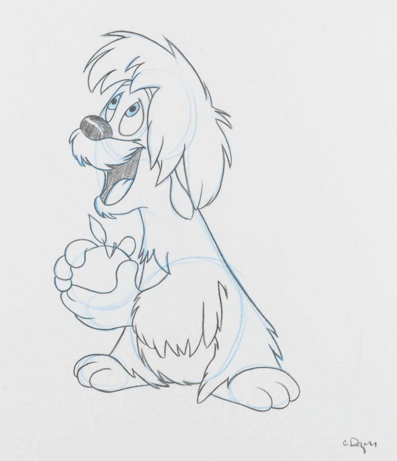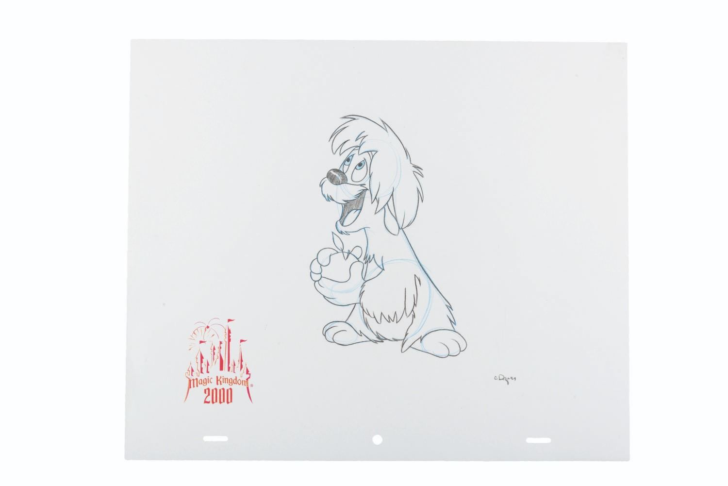 (Walt Disney World, 2000) A drawing of Gurgi from "The Black Cauldron " produced at Walt Disney World during the year 2000 celebrations. With an image size of 3.75 " x 6 " on 10.5 " x 12.5 " animation paper, the graphite and color pencil drawing is in fine condition, with a "Magic Kingdom 2000 " stamp.