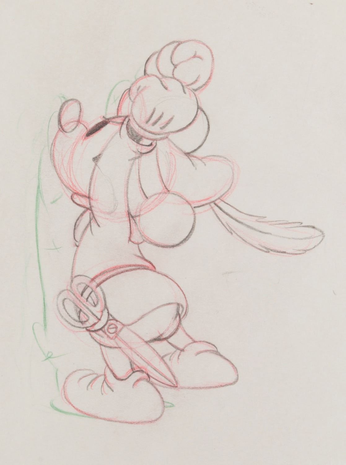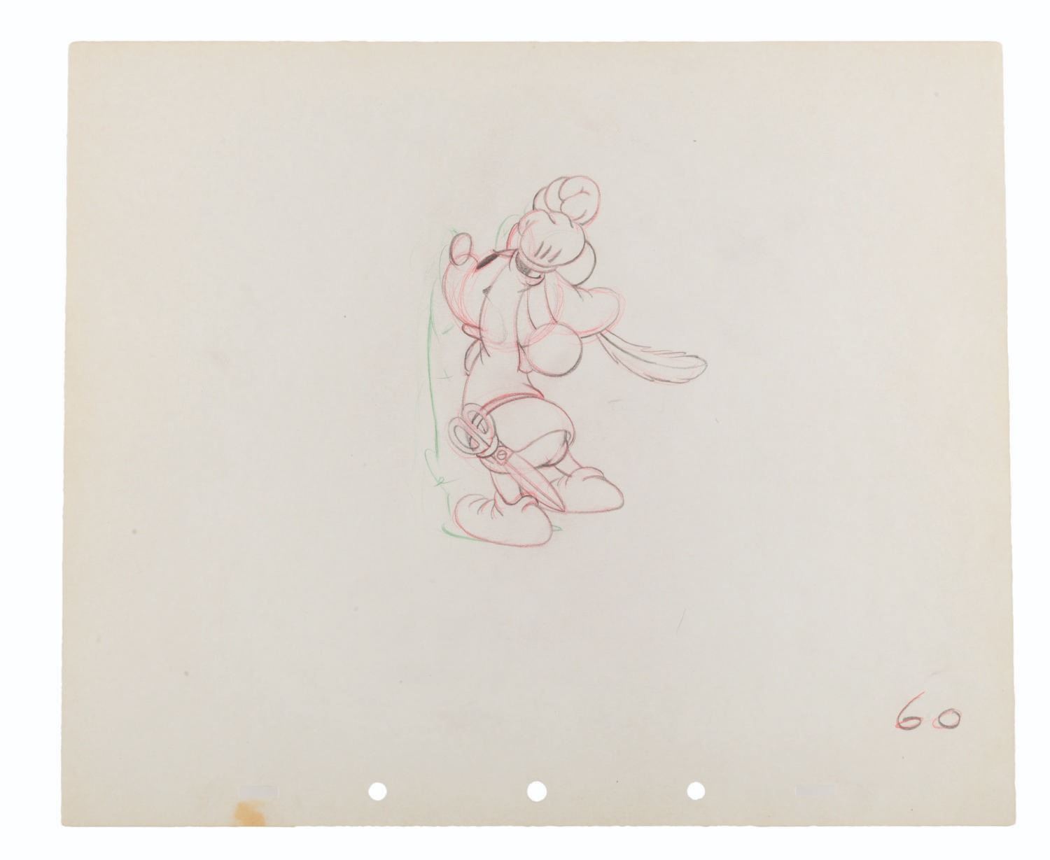 (Disney, 1938) An original production drawing of Mickey Mouse from the short "The Brave Little Tailor. " With a character size of 3.5 " x 4.75 " on 10 " x 12 " animation paper, the graphite and color pencil drawing is in very good condition with wear and slight smudges typical of original production use and age.
