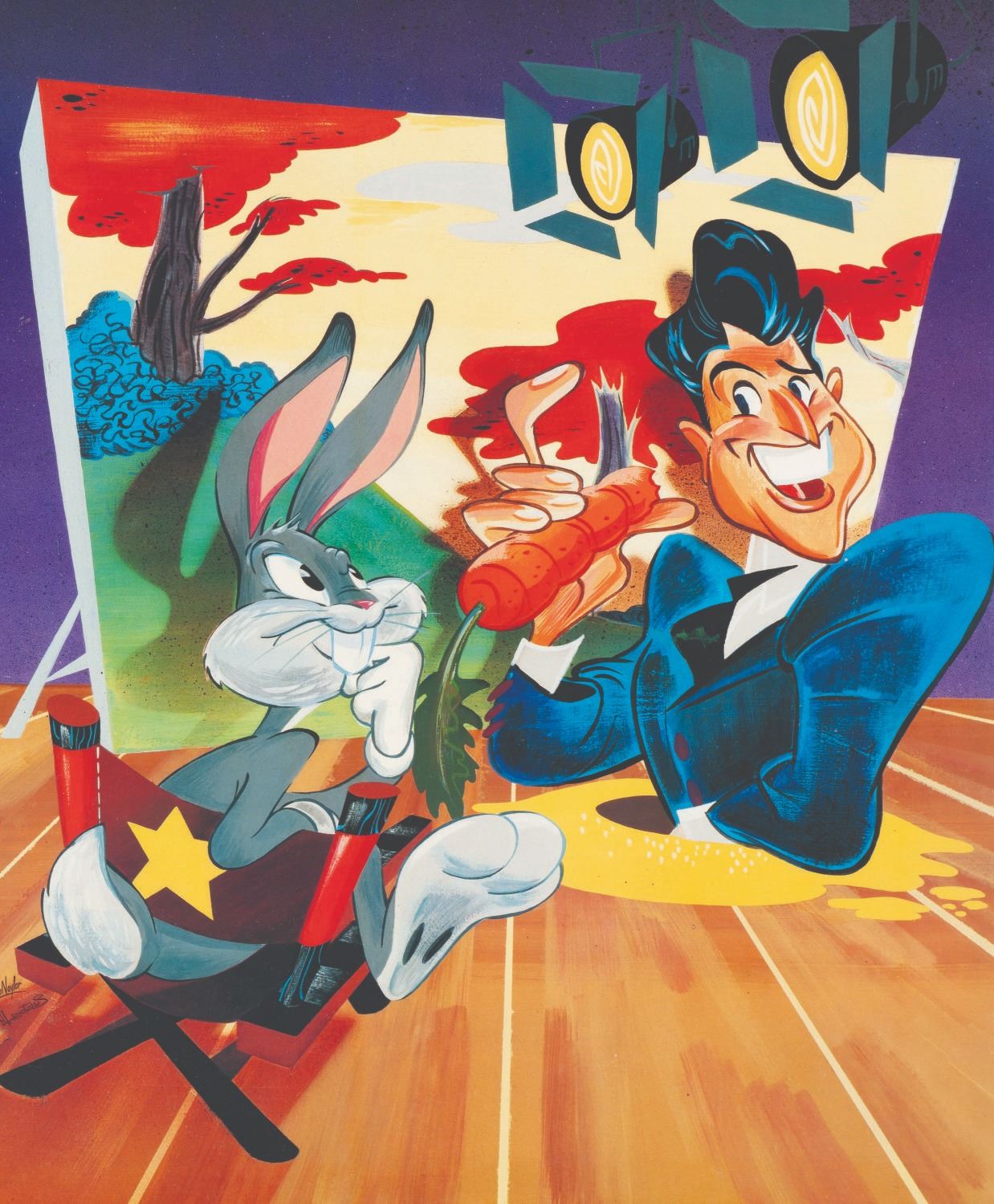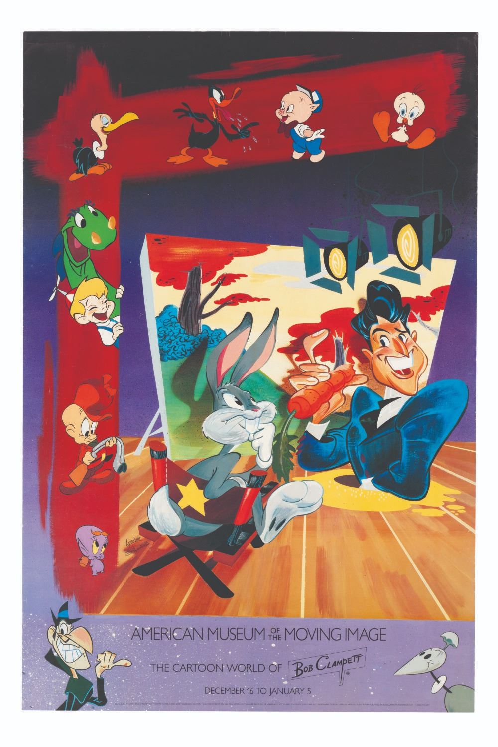 (American Museum of the Moving Image, 1989) A poster for “The Cartoon World of Bob Clampett” retrospective from December 16, 1989 through January 6th, 1990. Designed by John K. and Lynne Naylor, the poster features Clampett with his trademark carrot microphone speaking with Bugs Bunny. Measuring 24” x 36”, the poster displays in very good condition, with some small creases and light edge wear.