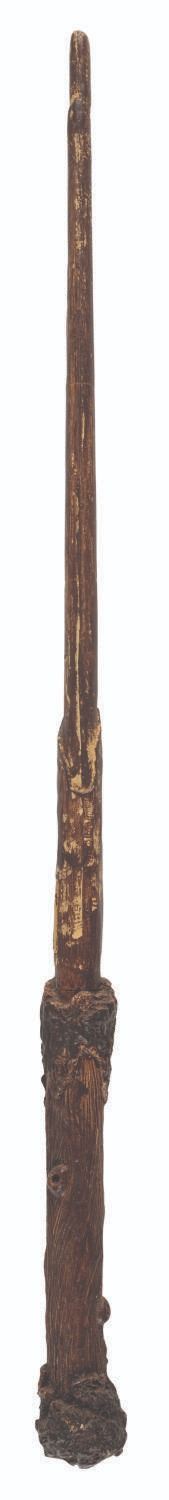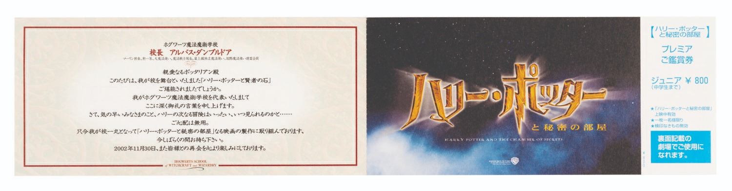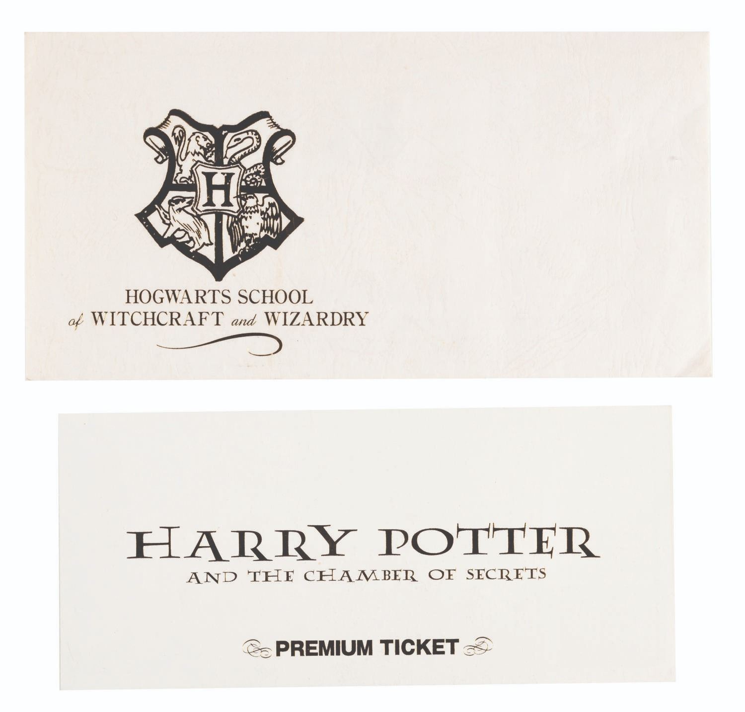 (Warner Bros., 2002) A "Premium” advance sales child ticket to "Harry Potter and the Chamber of Secrets” in Japan. The unused ticket comes in a decorative Hogwarts envelope, and includes a stub presented as a letter from Dumbledore thanking viewers for watching the first film while announcing the school’s preparation for the second. Included is a replica of Harry Potter’s wand from the film. The ticket and envelope measure up to 4.75” x 9.25” and are in very good condition with light handling wear to the envelope. The resin wand measures 13.5” long and is in good condition with small cracks just above the "handle” including a small chip missing. The wand box measuring 15.5” x 2” x 1.25” is in fair condition with several creases.