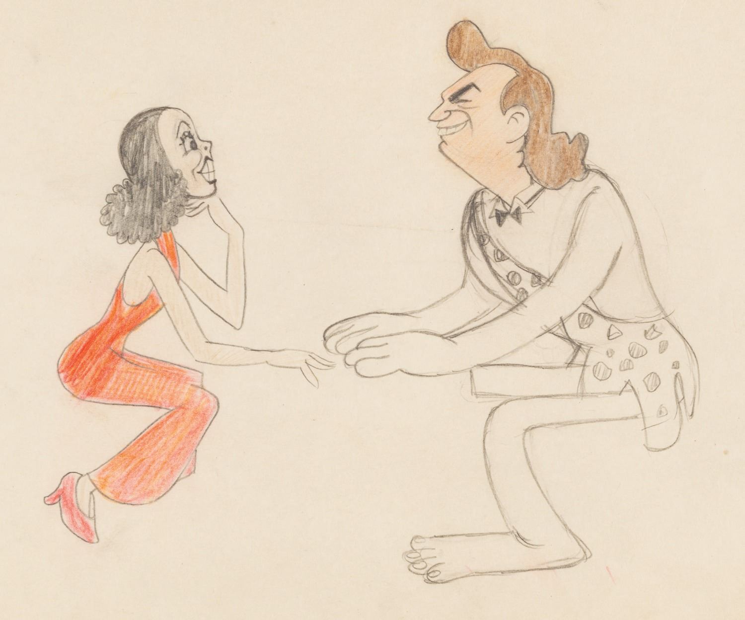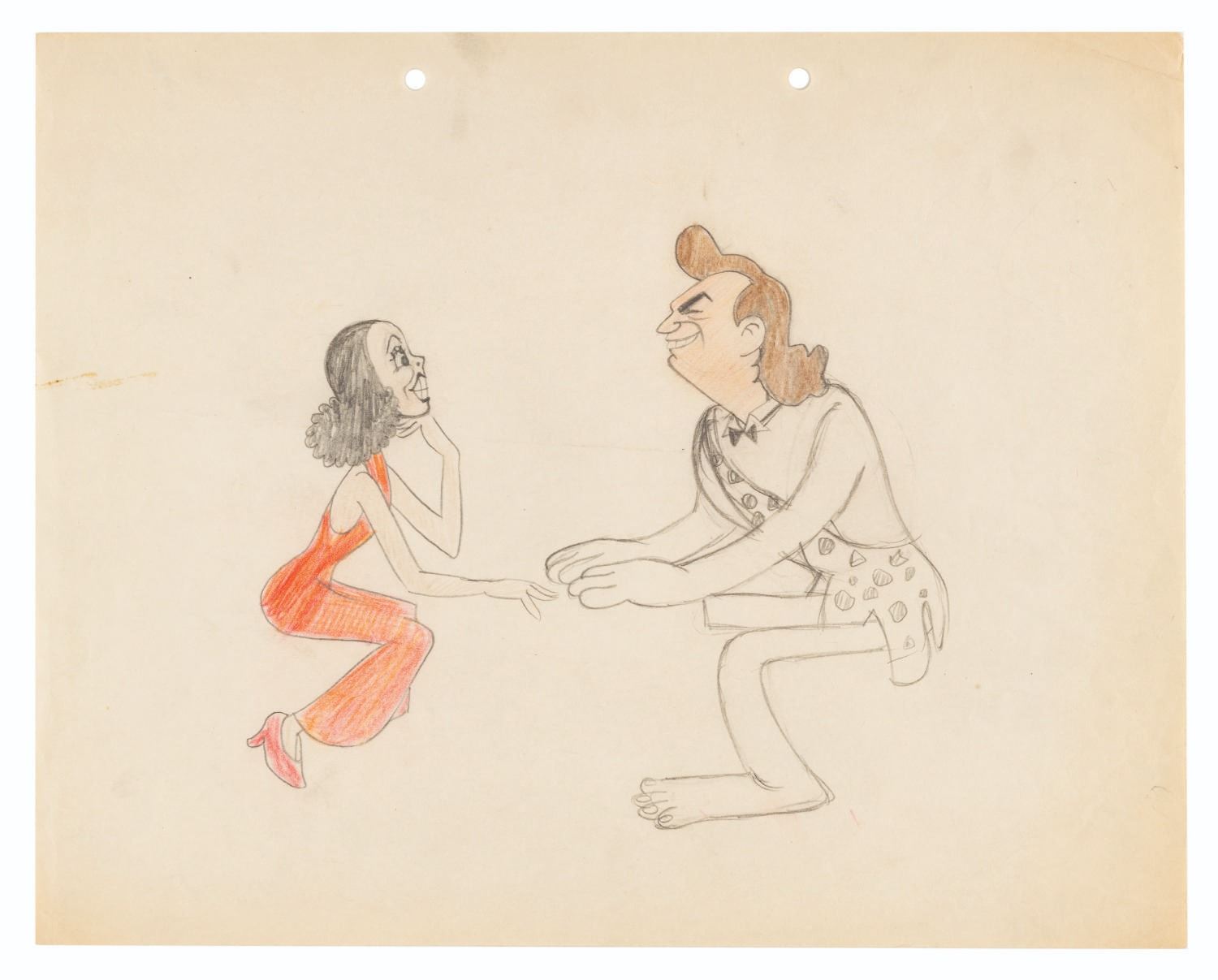 (Schlesinger, 1936) An original color model drawing of Johnny Weissmuller and Lupe Vélez from the Merrie Melodies short “The CooCoo Nut Grove.” Accomplished in graphite and colored pencil, with a character image size of 6.25” x 7.5” on 9.5” x 12” animation paper, the drawing is in good production-used condition with light creasing, including a horizontal crease along the middle, edge wear, tape residue to the left edge, and light discoloration from age.