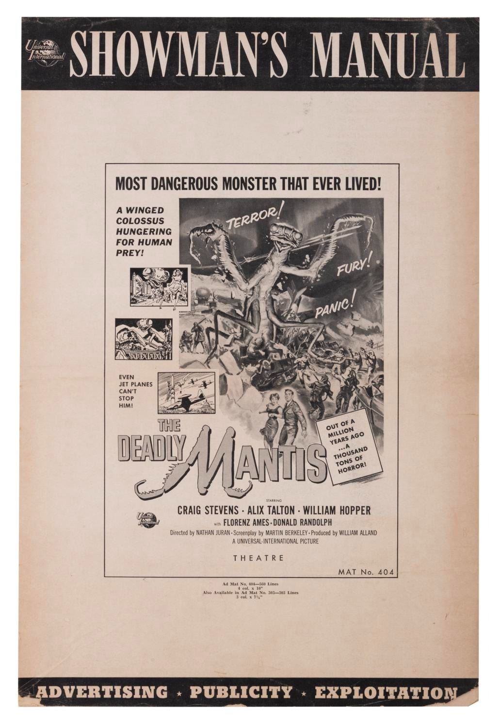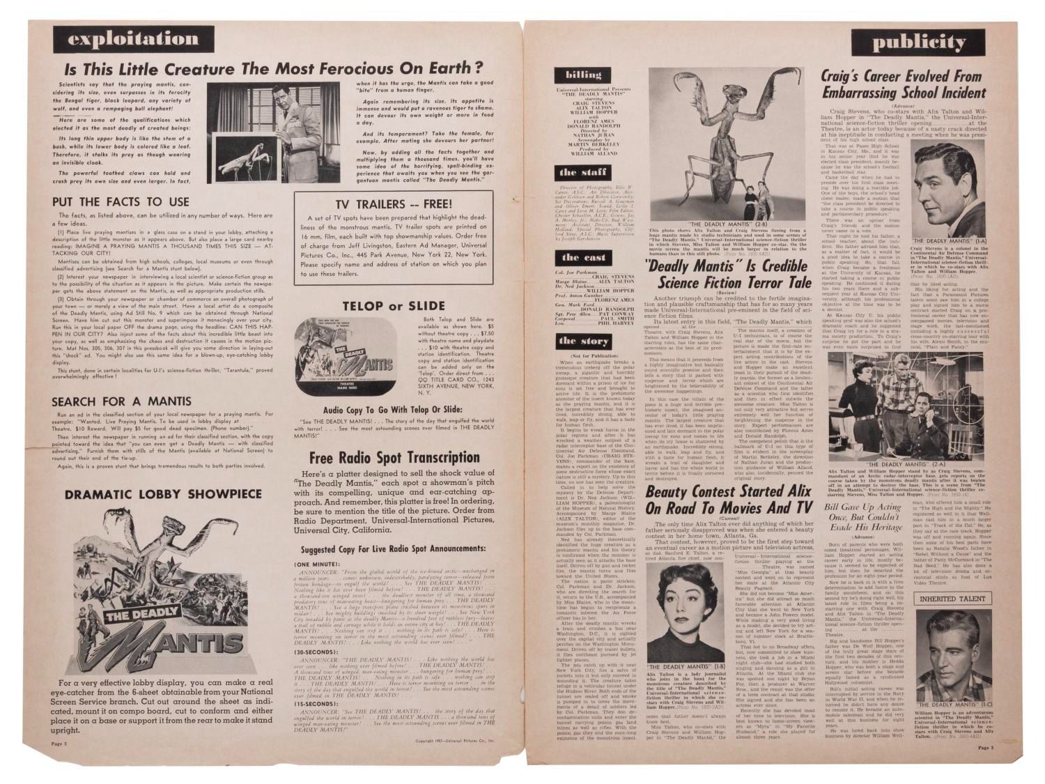 (Universal, 1957) A pressbook for the classic 50s giant bug monster movie "The Deadly Mantis." The twelve-page book includes publicity stories and layouts of all sizes for theaters to publish local ads. Measuring 12" x 17.5", the pressbook is in good condition with slight discoloration from age, and wear mainly to the edges, including chipping, small creases, tiny tears, and scuffs.