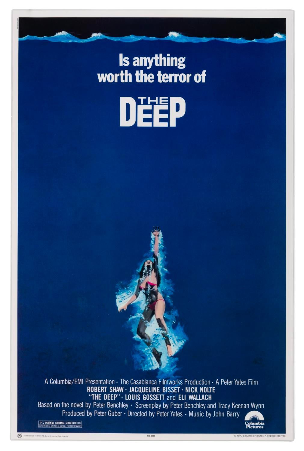 (Thought Factory, 1977) A merchandise poster of "The Deep." This poster was laminated to keep as a sample. Measuring 23.25" x 35.25", the laminated poster displays in very good condition with light handling wear.