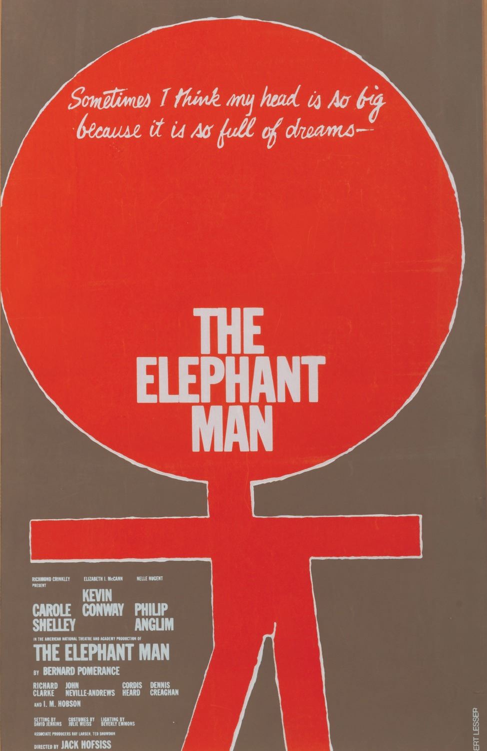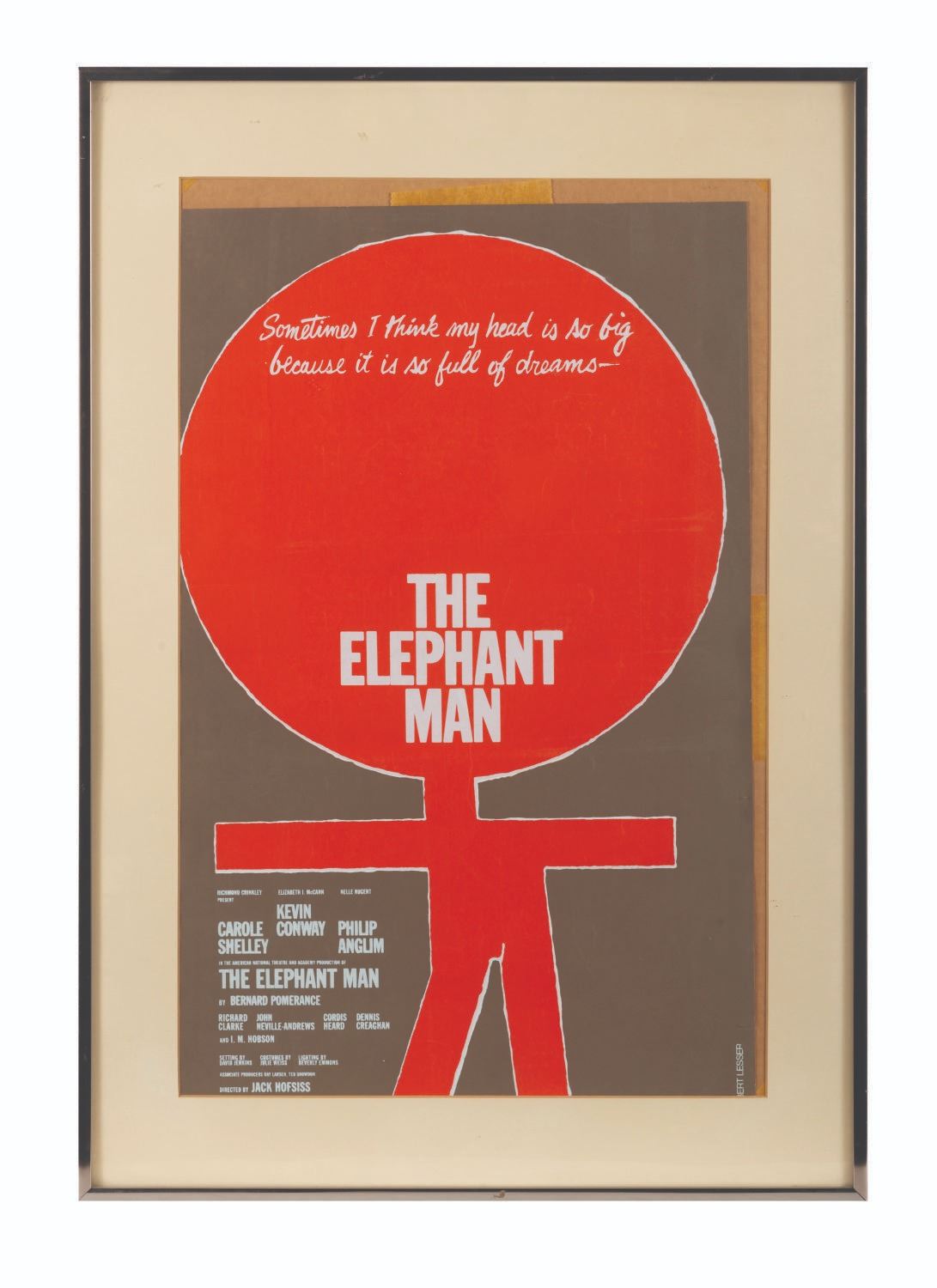 (Booth Theatre, 1979) An original window card from the Broadway debut of “The Elephant Man.” The silkscreened poster was designed by renowned graphic designer Gilbert Lesser who created posters for over 50 stage productions, one of which is on display at the Museum of Modern Art in New York, and the famous Studio 54 logo. Measuring 14" x 22", the card displays in very good condition, with light edge wear and 0.25” tear on the bottom from display.
