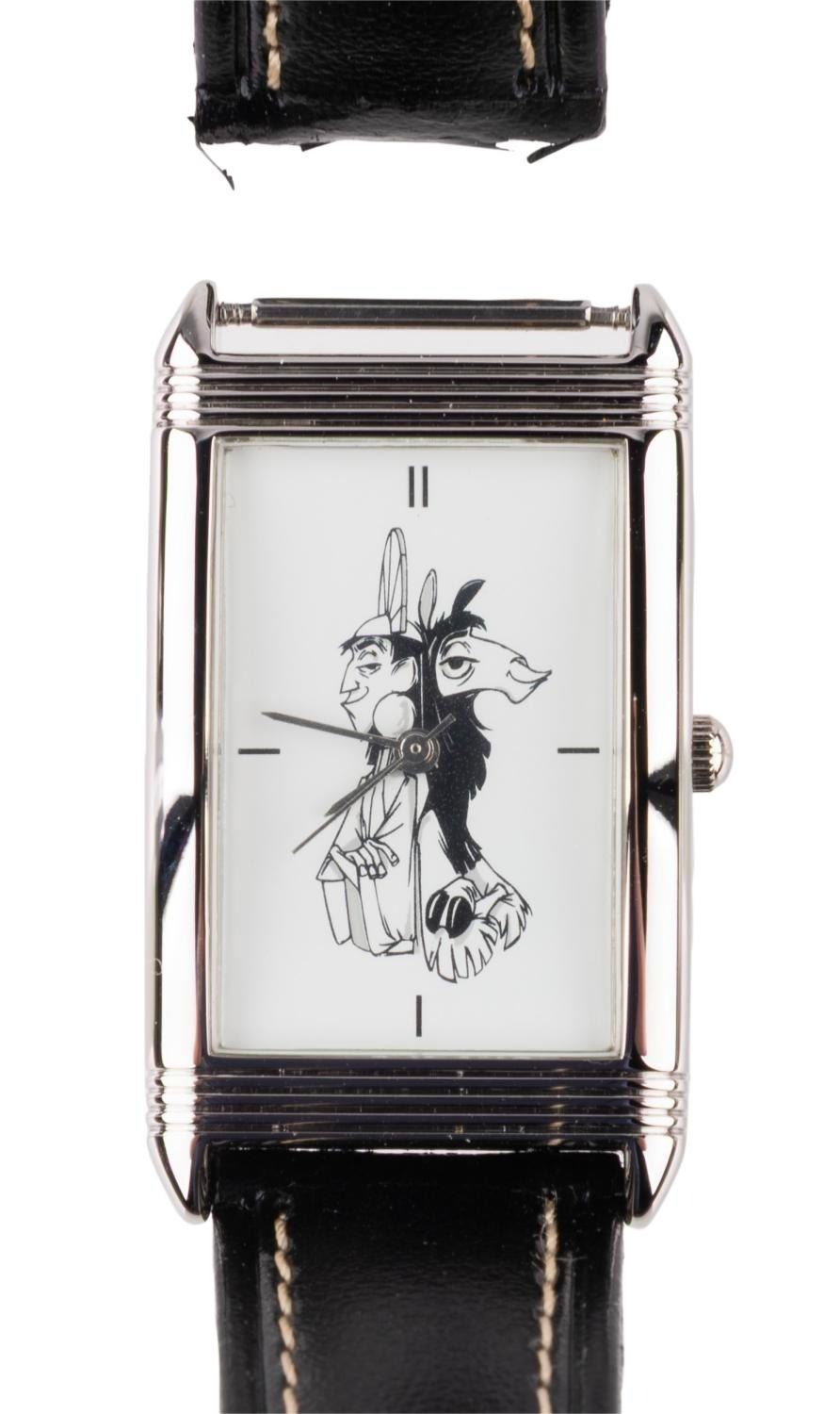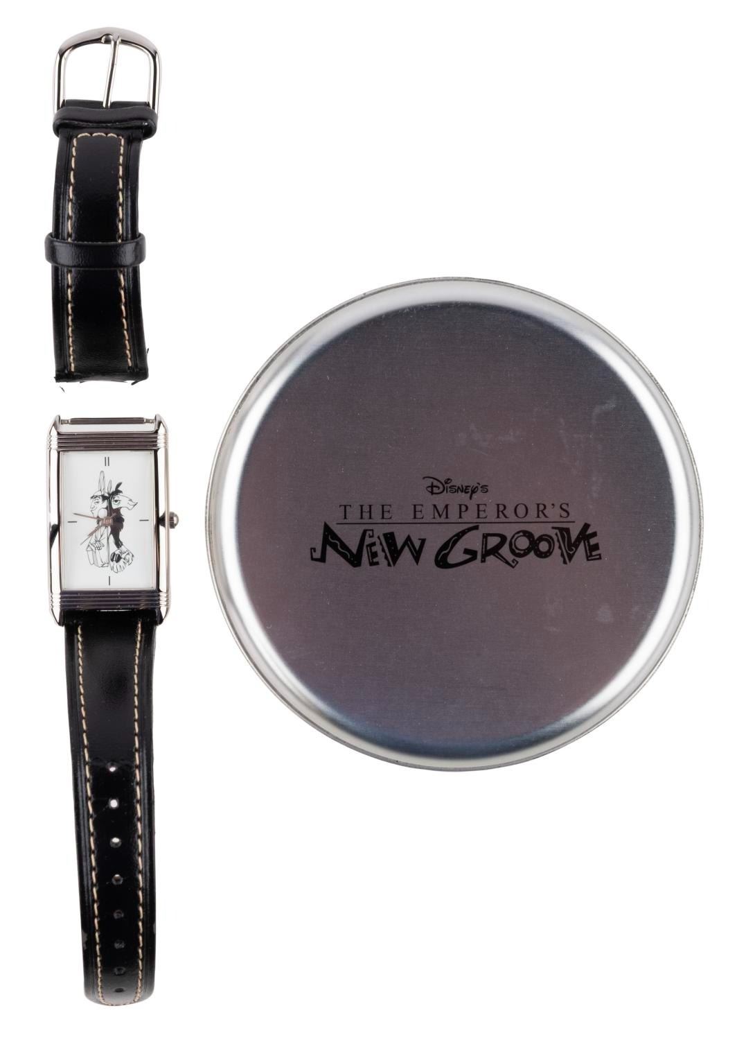 (Disney, 2000) A "The Emperor's New Groove" watch featuring Kuzco in both human and llama form. The watch comes in a 3" tall and 3.75" in diameter branded tin. The timepiece did not work when tested, likely requiring repair, and is in good condition with creases and a broken band.