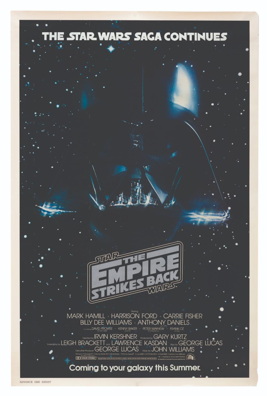 (20th Century Fox, 1980) An advance one-sheet for "Star Wars: The Empire Strikes Back. " With an image size of 25 " x 39 " and measuring 27 " x 41 " overall, the poster is in good condition with creases, edge wear, light discoloration in the border, and edge tears, notably at the lower right.