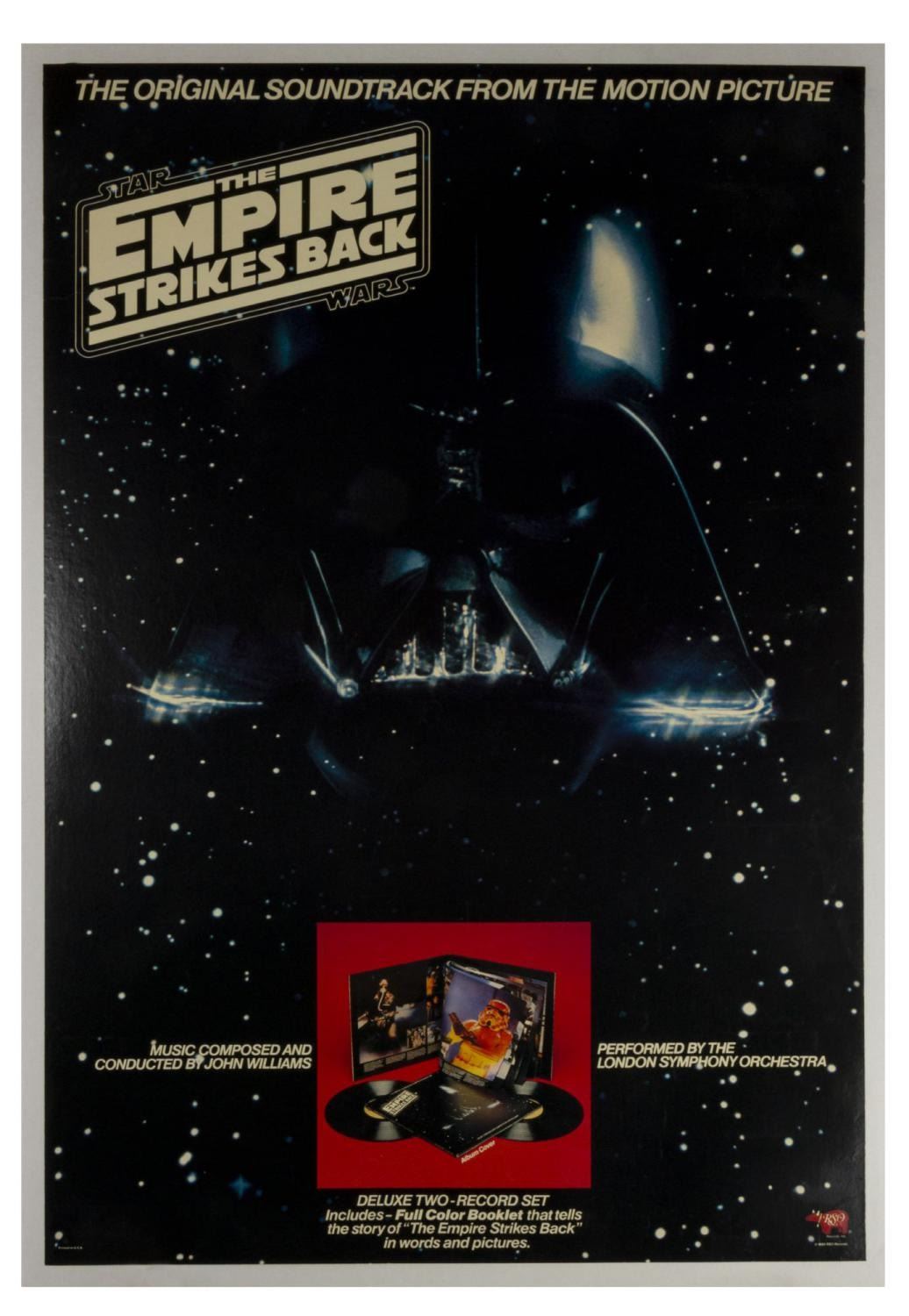 (RSO Records, 1980) A poster for the release of the deluxe 2-record soundtrack and story of “The Empire Strikes Back.” Measuring 24.25” x 36”, the poster is in very good condition, linen-backed for preservation, with faint surface scuffs and minor wear from use.