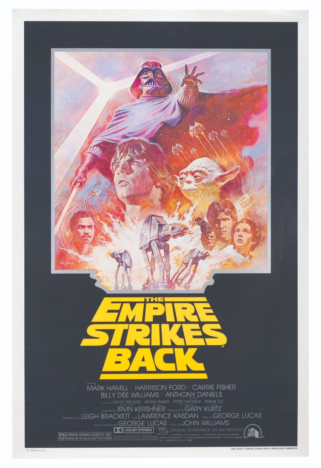 (20th Century Fox, 1981) A one-sheet for the Summer 1981 theatrical re-release of"The Empire Strikes Back," featuring artwork by Tom Jung. Measuring 27" x 41", the poster displays in very good condition with creases throughout and edge wear.