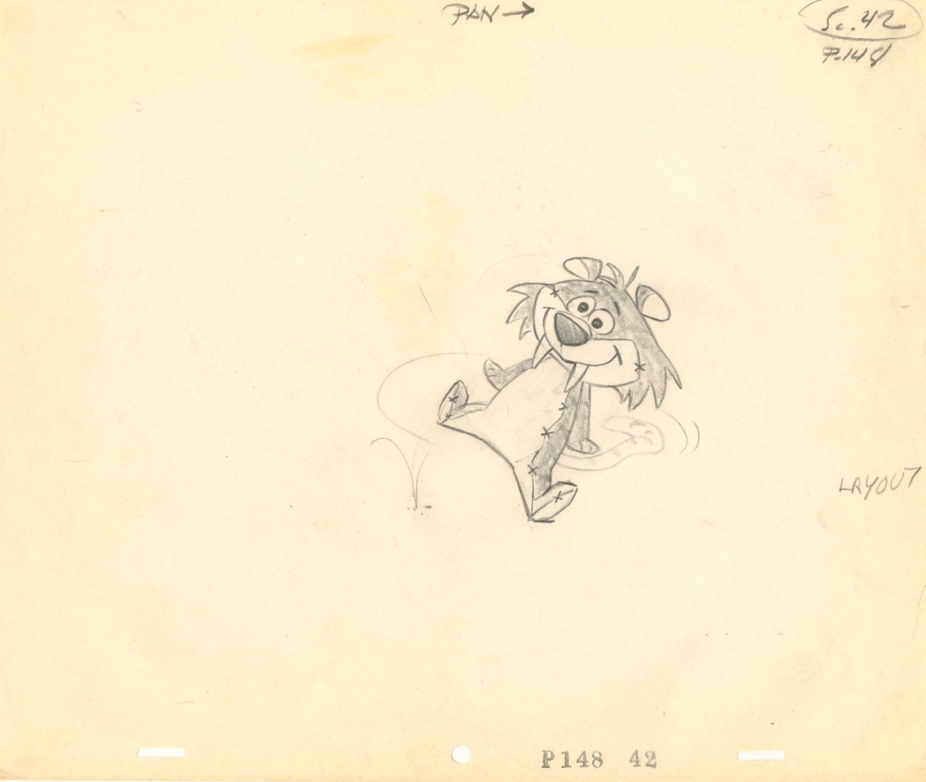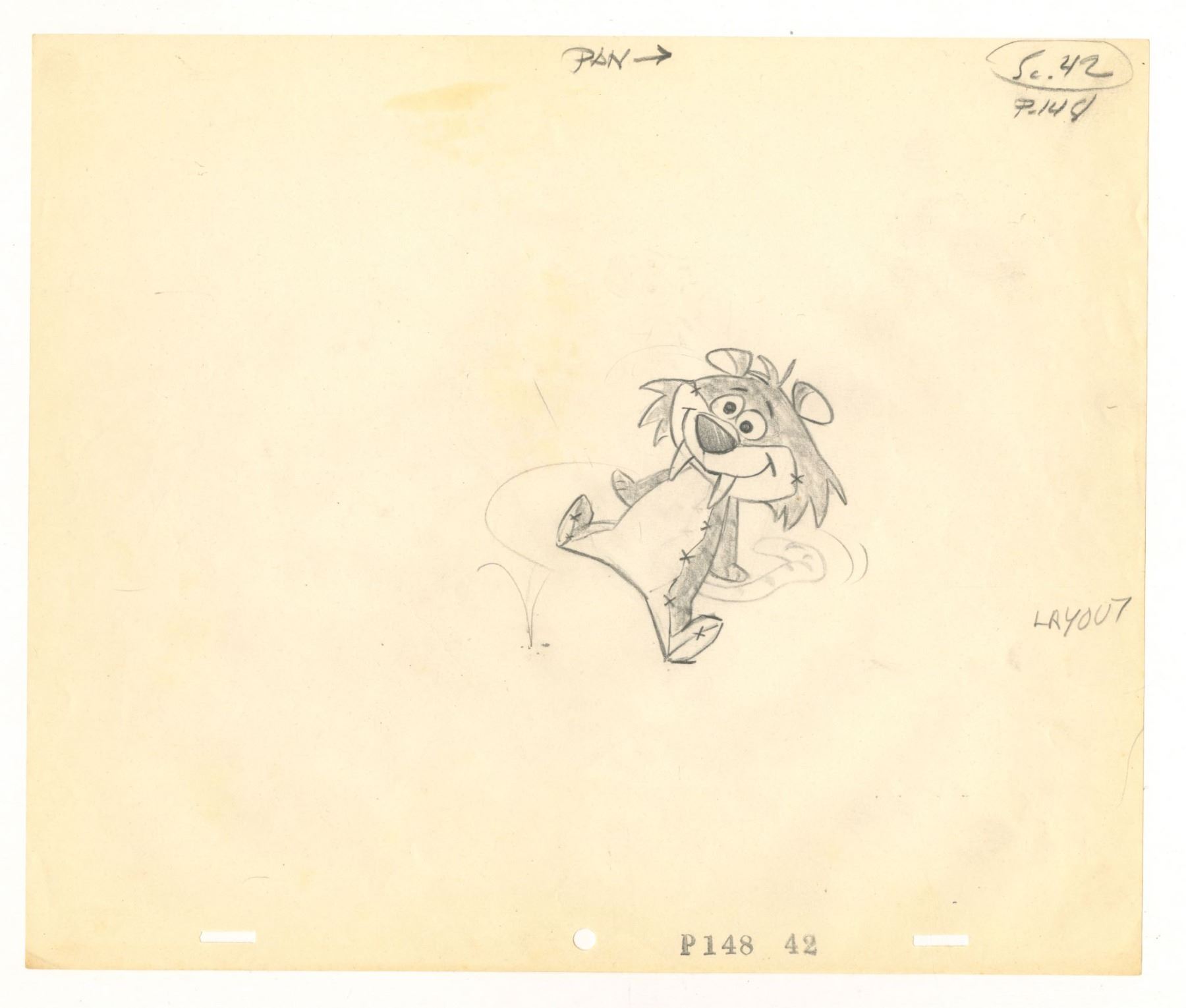 (Hanna-Barbera, 1966) An original layout drawing of Pebbles’ stuffed animal from “The Flintstones” episode “Samantha.” In this “Bewitched” crossover episode, Samantha appears as a prehistoric witch. With a character image size of 3.5” x 3.5” on 10.5” x 12.5” animation paper, the graphite drawing is in very good condition with discoloration from age and minor handling wear.