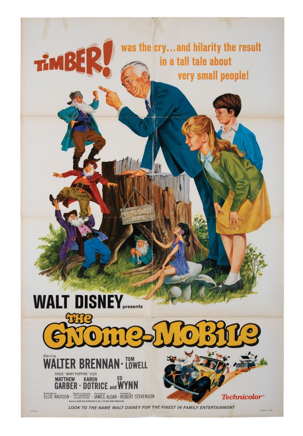 (Disney, 1976) An original release one sheet poster for Disney's 1976 feature film "The Gnome Mobile." Measuring 27"x41", the poster is in good condition, remnants of adhesive tape along the front top of the poster.