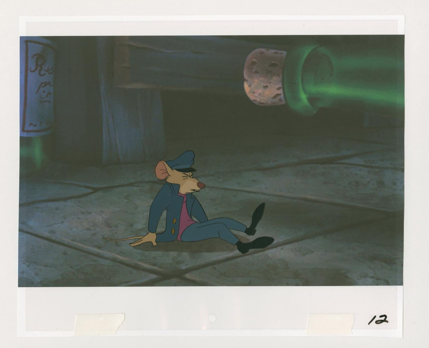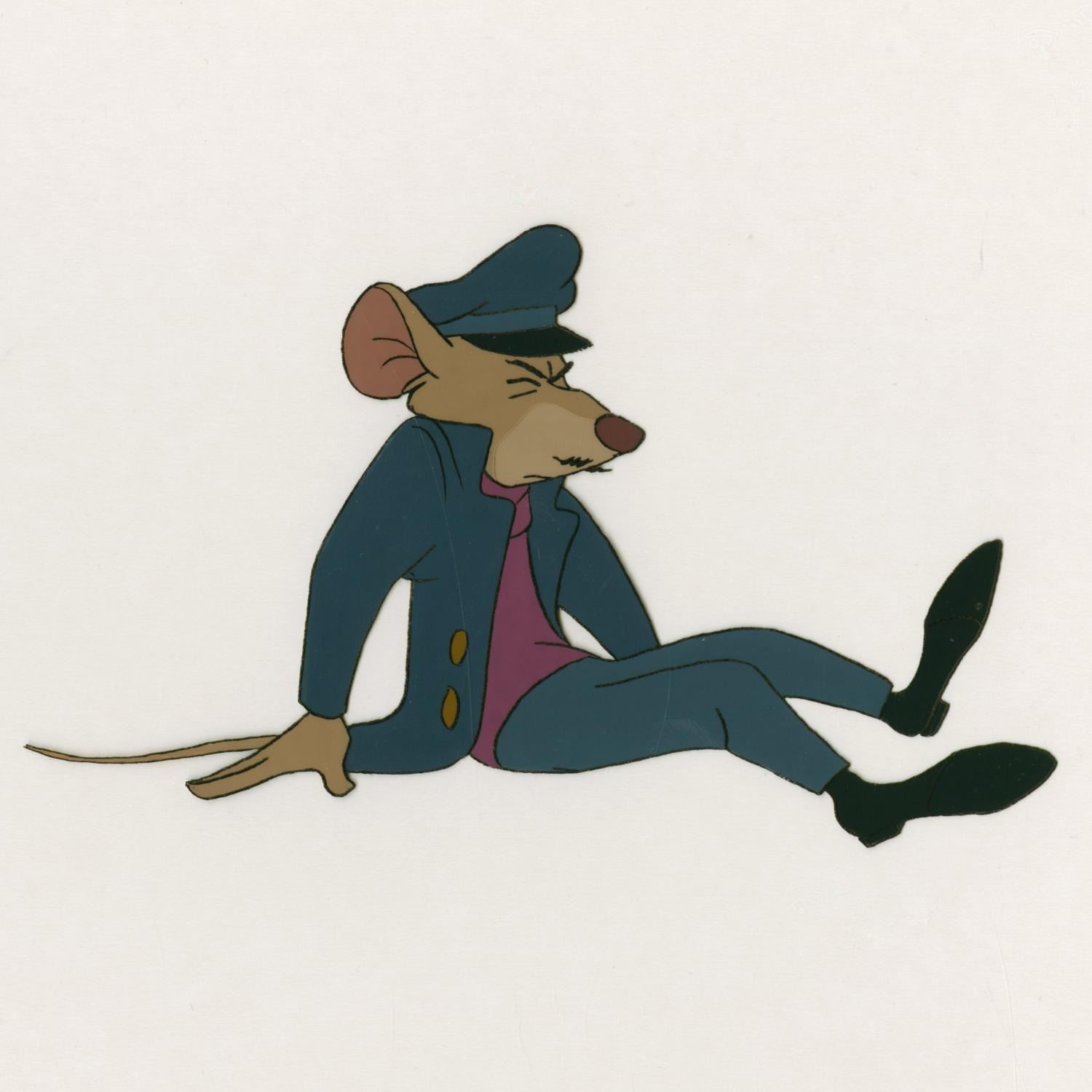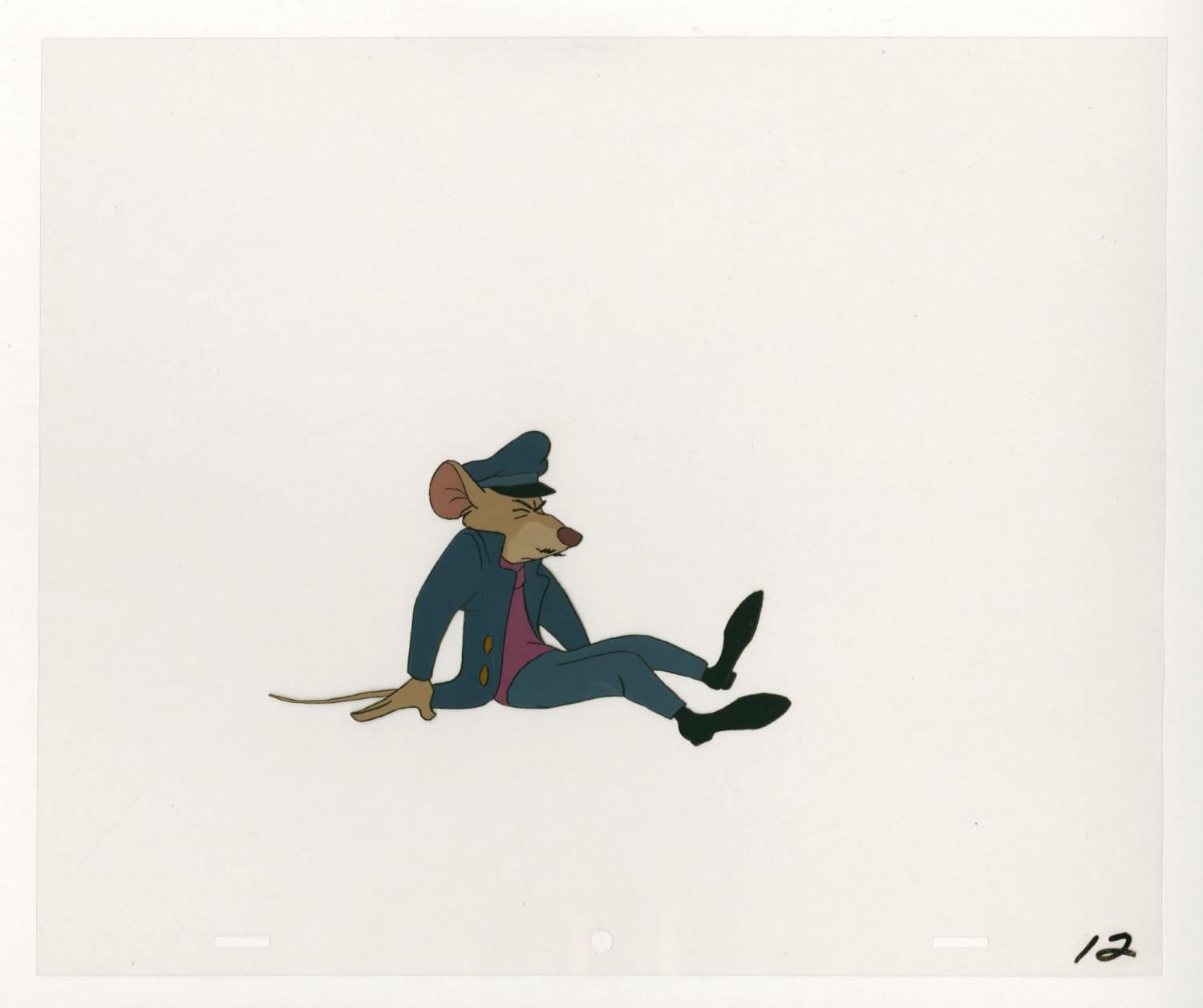 (Disney, 1986) An original production cel of Basil from"The Great Mouse Detective," paired with a color copy background. Basil has an image size of 3.5" x 6" on a 10.5" x 12.5" cel. The hand-painted cel is in very good condition with light scratches, a crease near the top right corner, and wear from production use.
