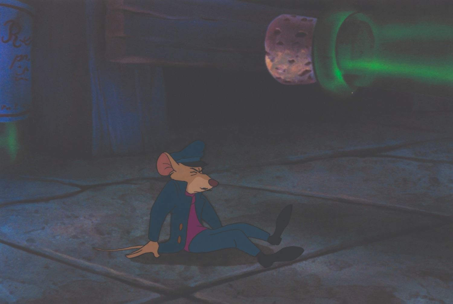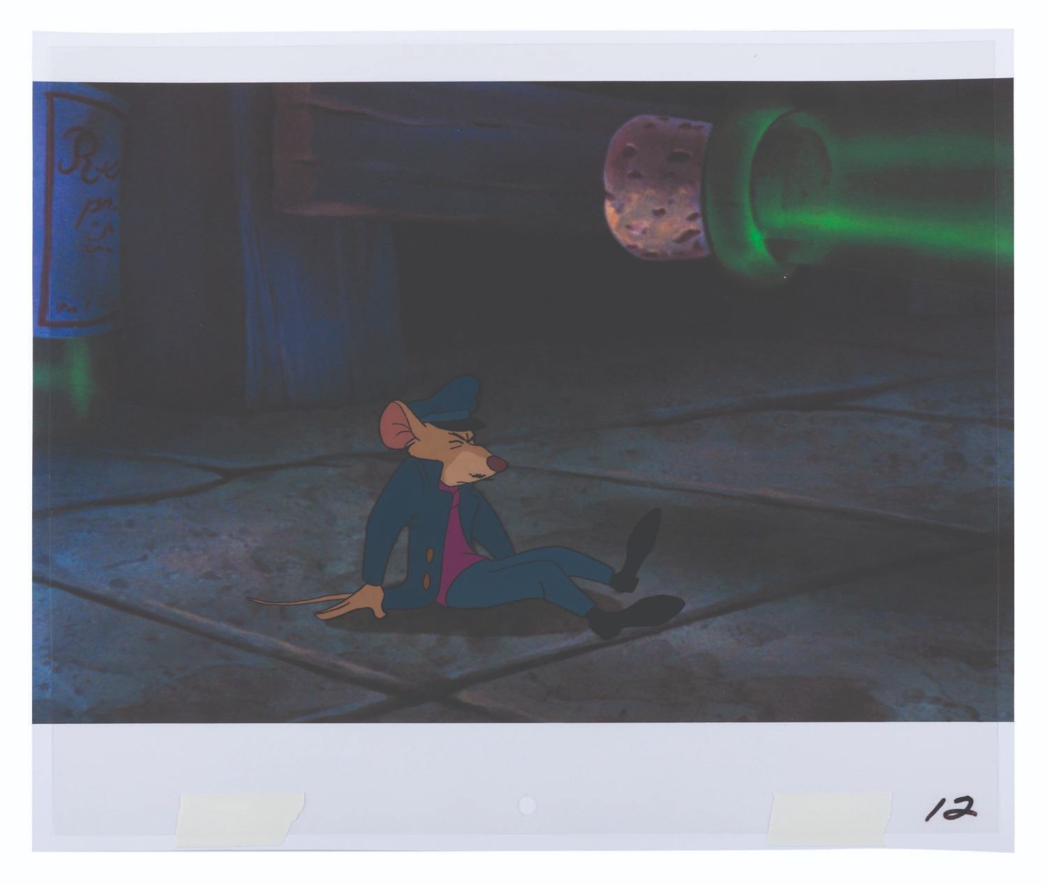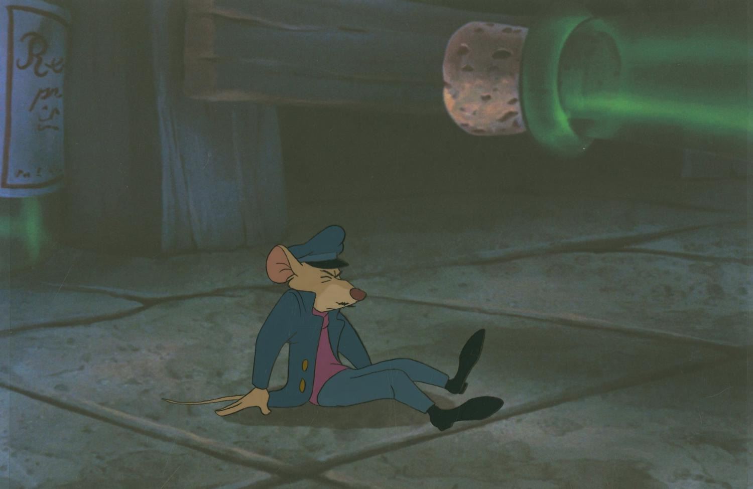 (Disney, 1986) An original production cel of Basil from"The Great Mouse Detective," paired with a color copy background. Basil has an image size of 3.5" x 6" on a 10.5" x 12.5" cel. The hand-painted cel is in very good condition with light scratches, a crease near the top right corner, and wear from production use.