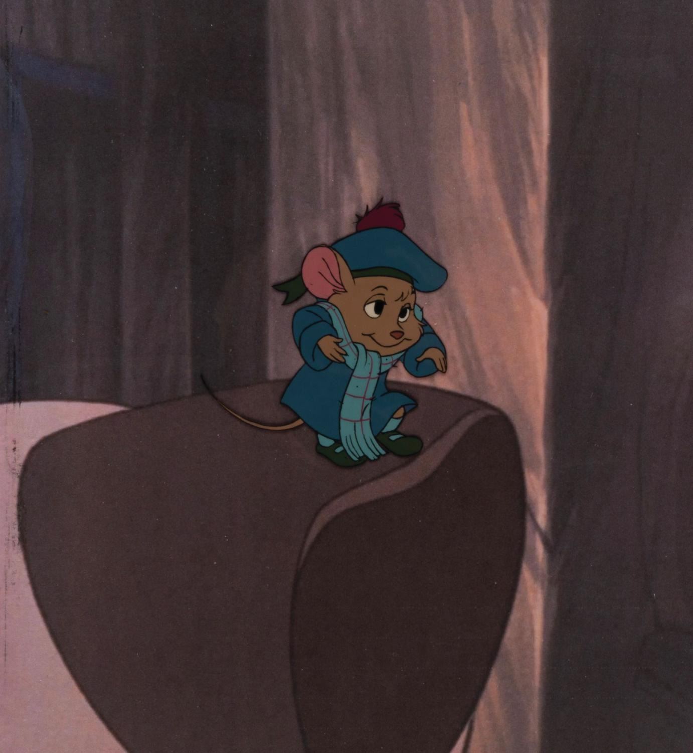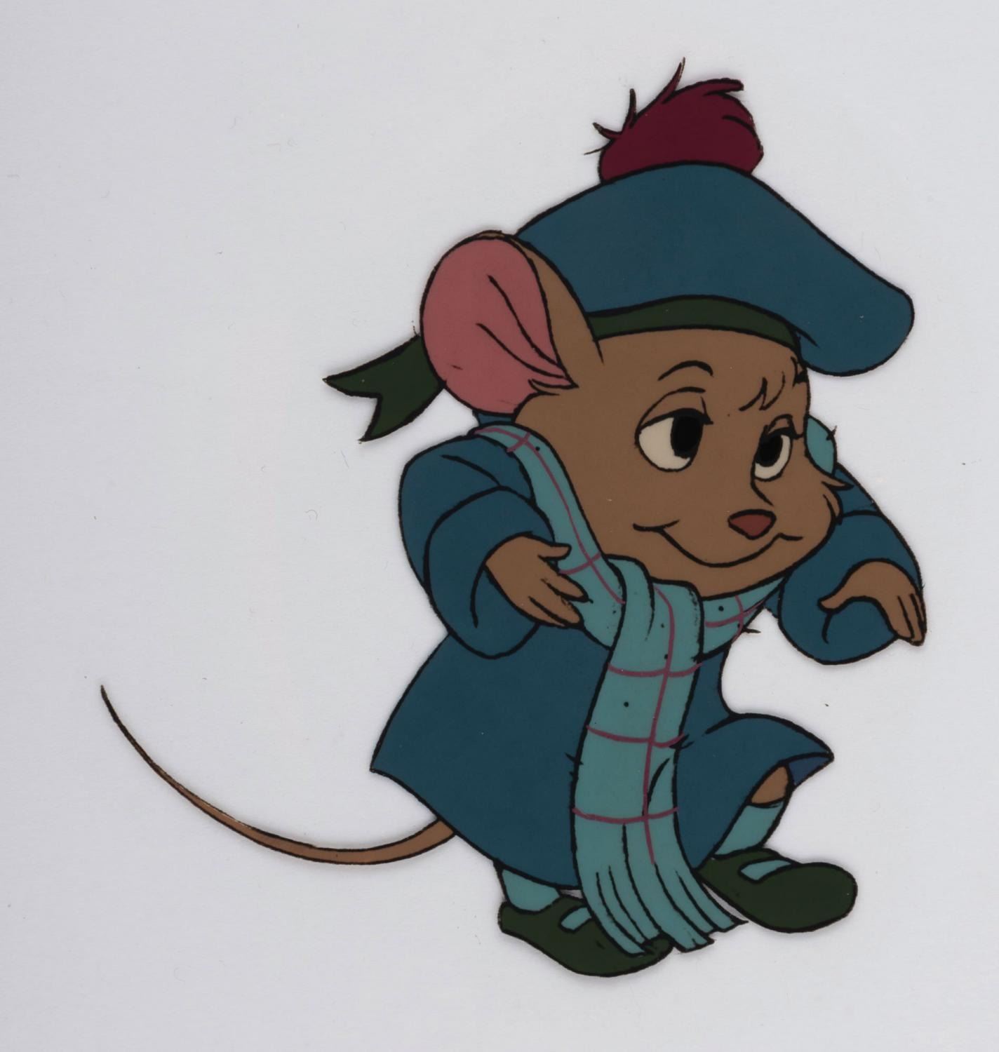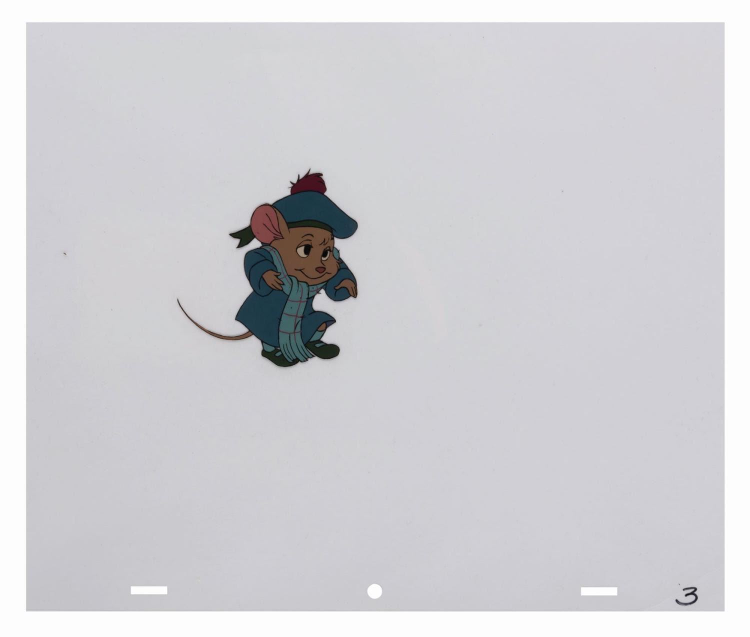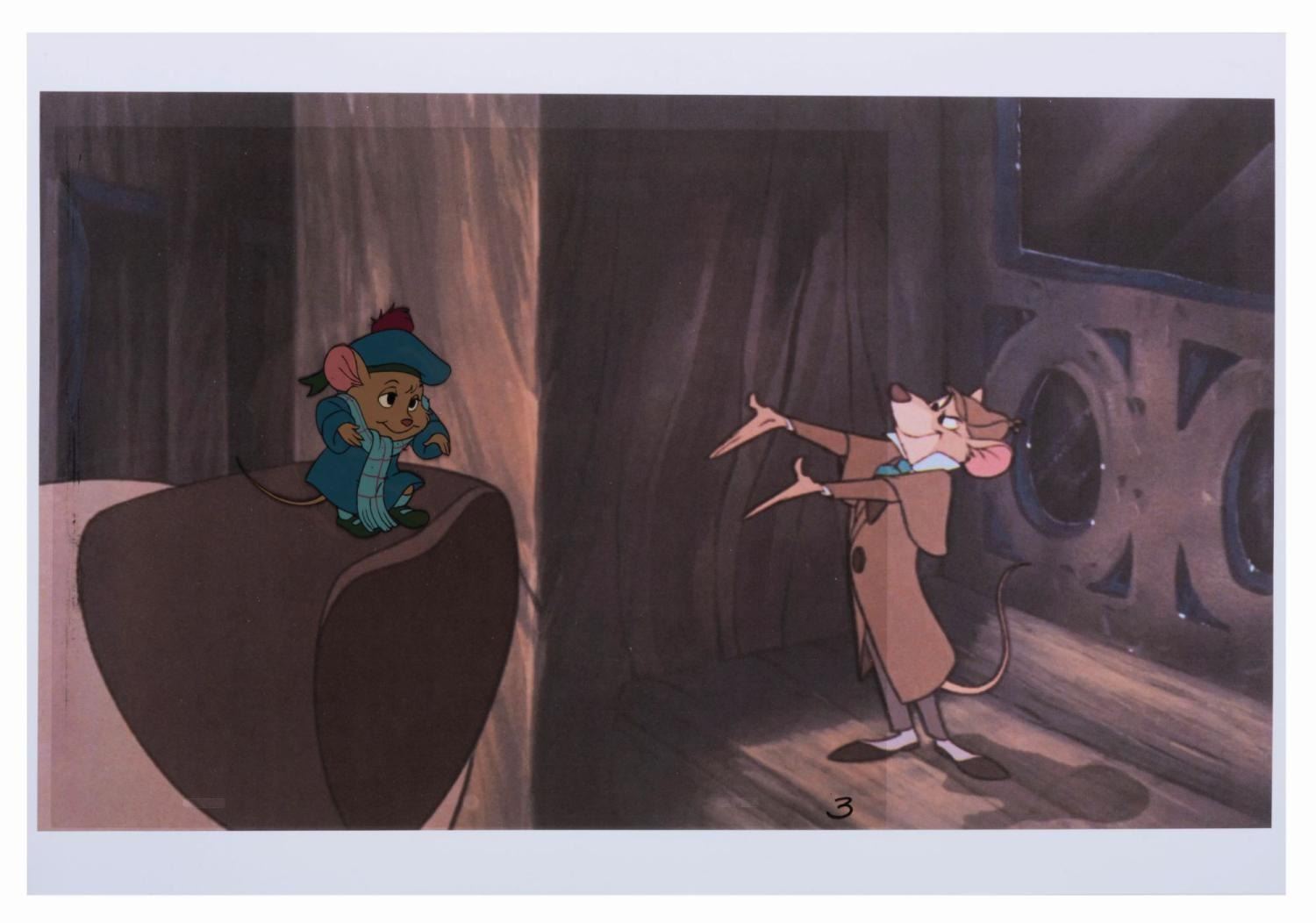 (Disney, 1986) An original production cel of Olivia from "The Great Mouse Detective," paired with a color copy background featuring Basil. Olivia measures 3.25" x 3.5" on a 10.5" x 12.5" cel. The piece is in very good condition with scratches, spots of paint loss, and wear from production use.