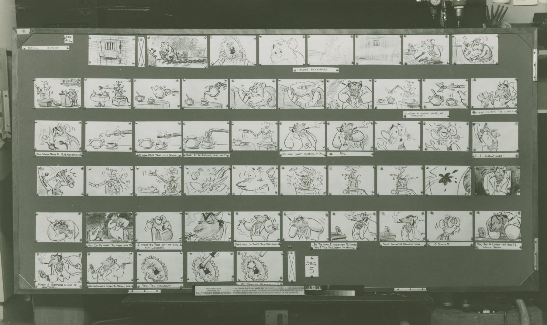 (Disney, 1986) A photostat storyboard reference from the production of “The Great Mouse Detective” featuring Mr. Flaversham and Ratigan. Photostat storyboards like these were distributed to animators to use as reference during production. Measuring 12” x 20’, the photostat is in very good condition with discoloration from age, and minimal edge and corner wear, including scuffs and creasing to the top left corner.