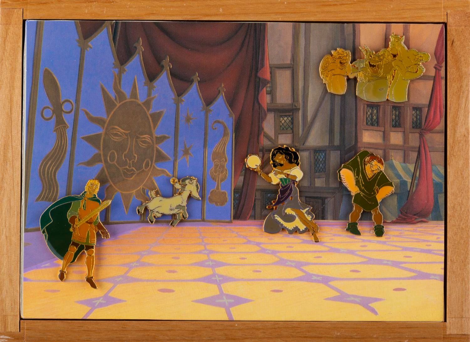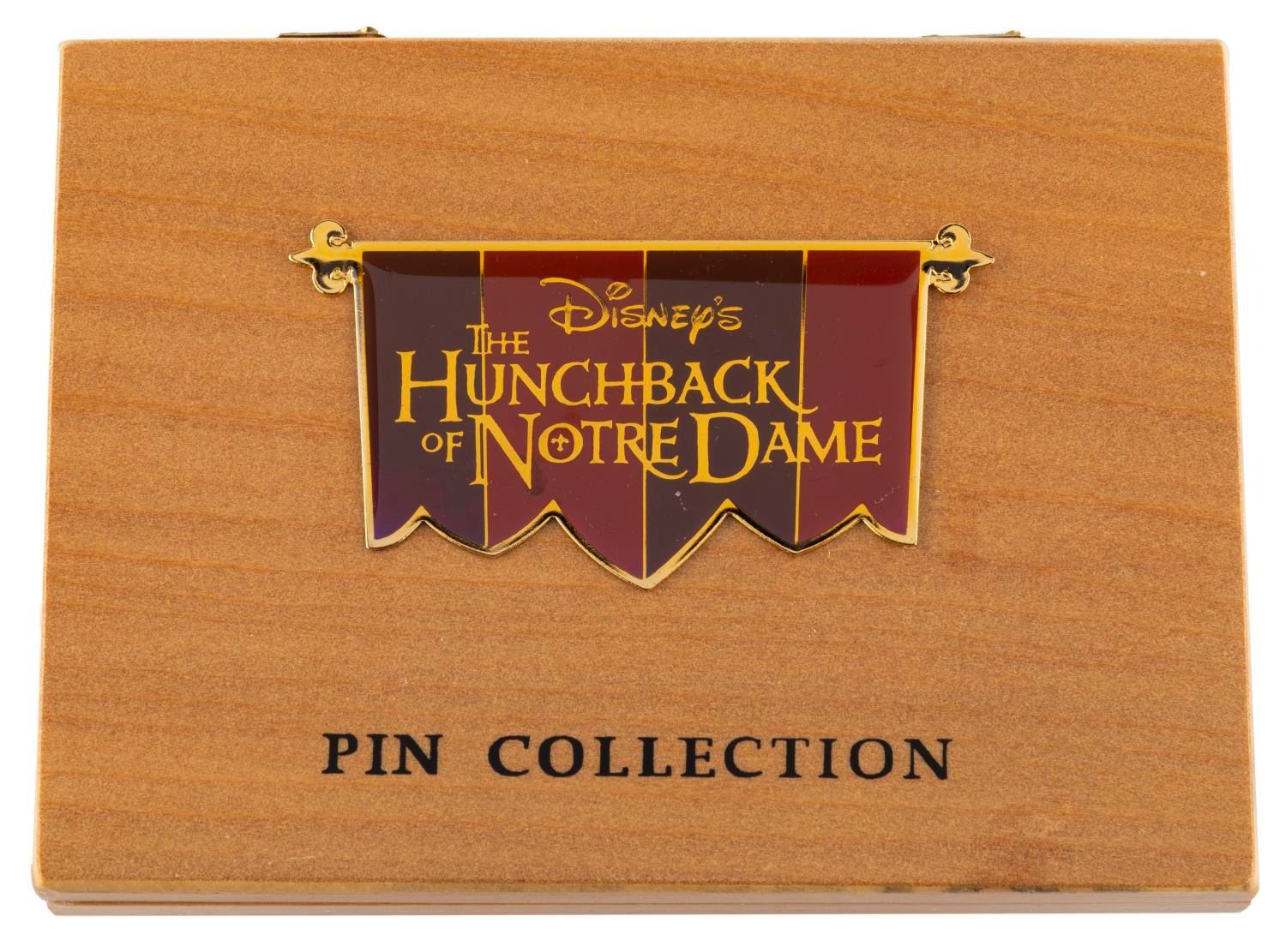 (Disney, 1996) A "The Hunchback of Notre Dame" pin set in a wooden display box with the film’s logo on the top. The pins include Quasimodo, Esmeralda, Phoebus, Djali, and the gargoyles. Measuring 5" x 7" overall, the set is in very good condition with slight scuffs to the top logo and typical discoloration to the pins from age.