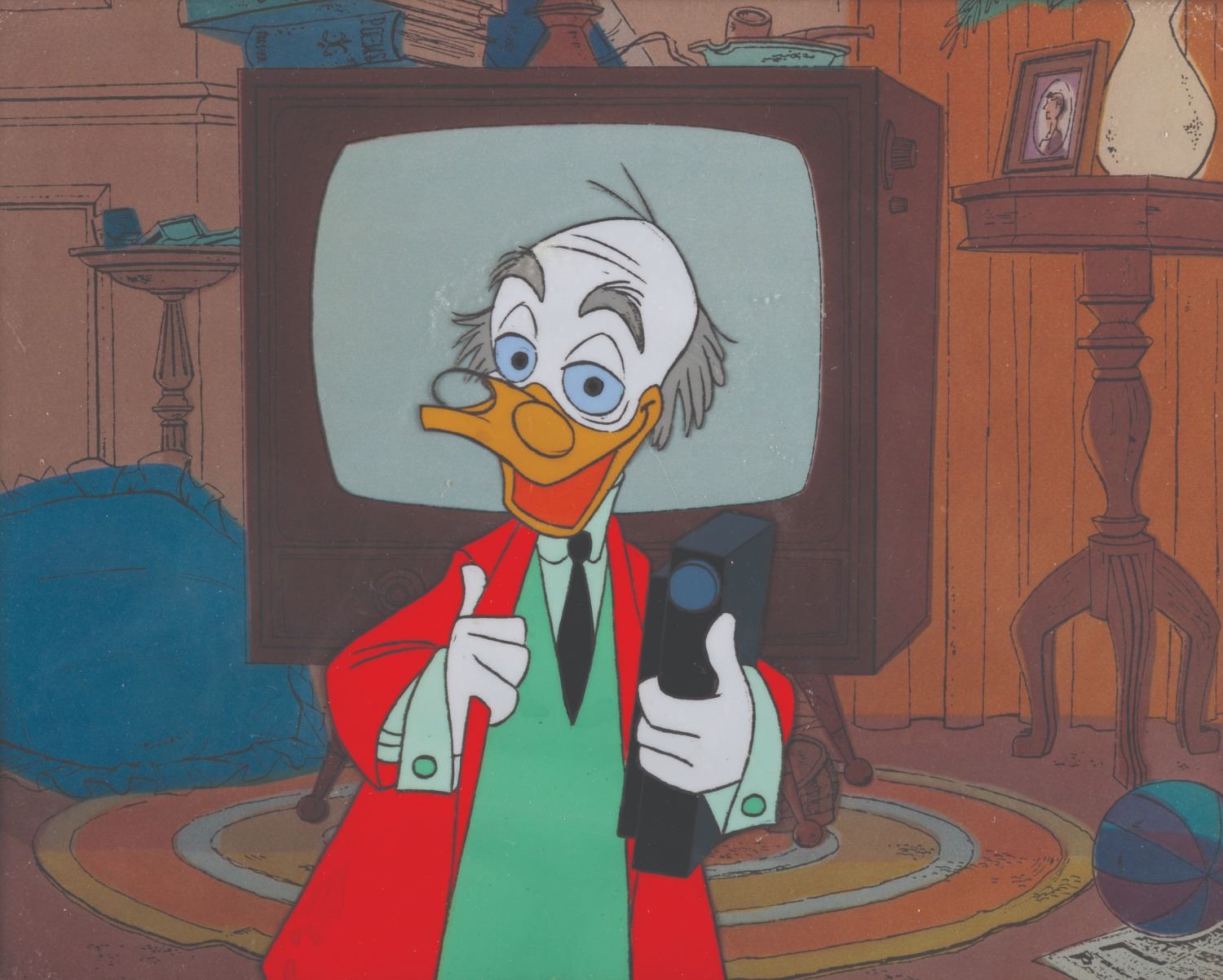 (Disney, 1961) An original production cel of Ludwig Von Drake from the "Walt Disney’s Wonderful World of Color” episode, "The Hunting Instinct." The cel with a color copy background was originally sold at the Art Corner in Disneyland and still has the original backing with the Art Corner gold label on the reverse. Ludwig has an image size of 6.5” x 4.25” on an 8” x 10” visible cel. The entire matted piece measures 12” x 14”. The piece displays in very good condition with paint transfer from cel to background on the lower right side of Ludwig’s coat and center tip of the beak, and edge wear, stains, and discoloration to the matte.