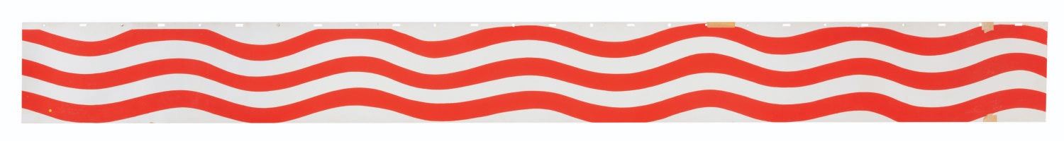 (Warner Bros., 1964) An original hand-painted production background from "The Incredible Mr. Limpet." Featuring red stripes from the American flag, the artwork is from a scene where Mr. Limpet dreams of returning home as a war hero. Measuring 10.5" x 105" long on heavy animation board with peg holes, the piece is in very good production-used condition with light scuffing, soiling and edge wear, spots of paper loss from previous mounting, and tape remnants from storage.