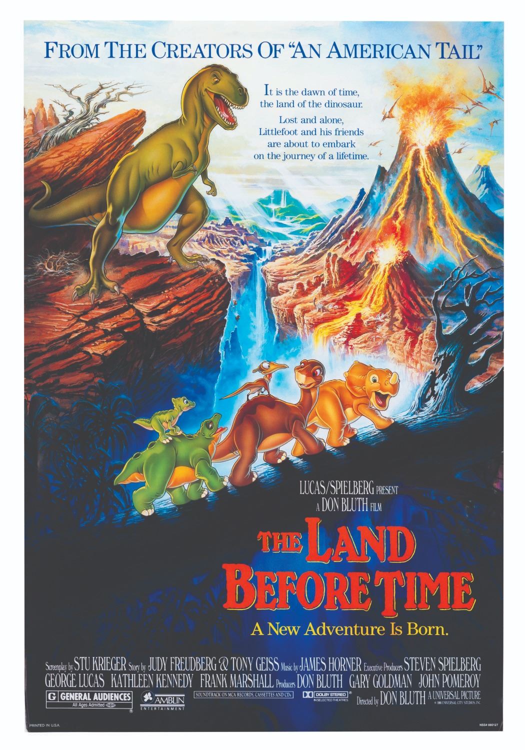 (Universal, 1988) A one-sheet for the Don Bluth Studios animated film "The Land Before Time." Measuring 27" x 39.75", the poster is in very good condition with light creases and edge wear.
