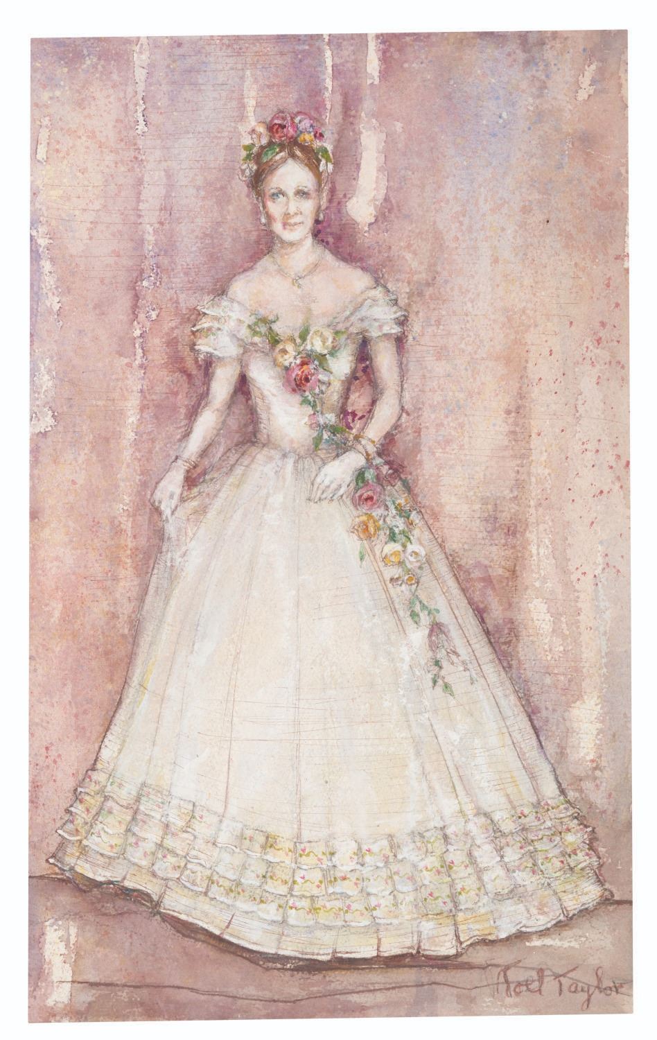 (PBS, 1976) A costume design for Julie Harris as Mary Todd Lincoln in the television movie The Last of Mrs. Lincoln. Executed and signed by designer Noel Taylor in watercolor and pencil, the art measures 13"x20.75" and is in very good condition.