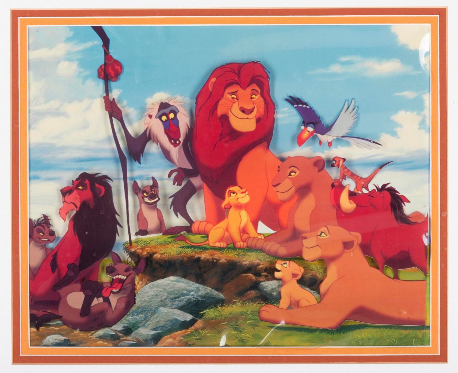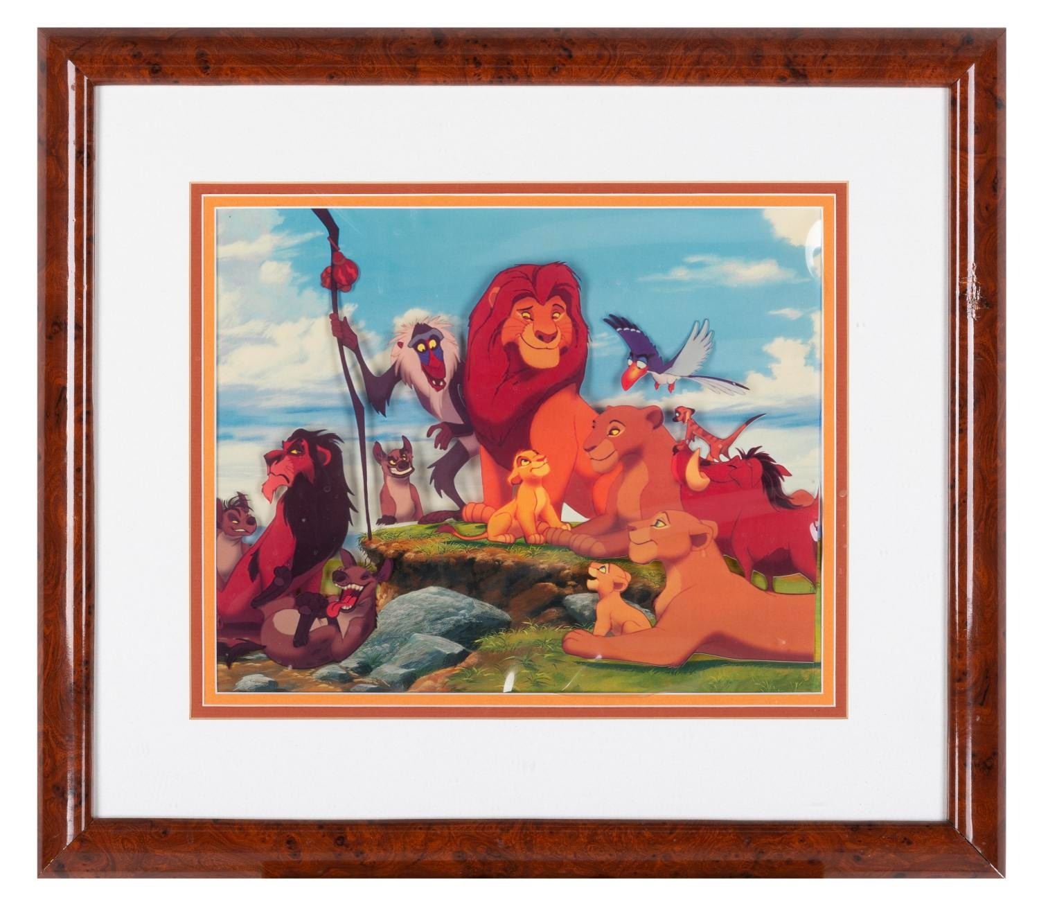 (Disney, 1990s) A “The Lion King” litho printed cel with a print background, showing the main cast of the film. With 10” x 12.5” visible in a 17.5” x 20.25” matte and frame, the cel displays in good condition even with heavy waviness and light spotting from age.