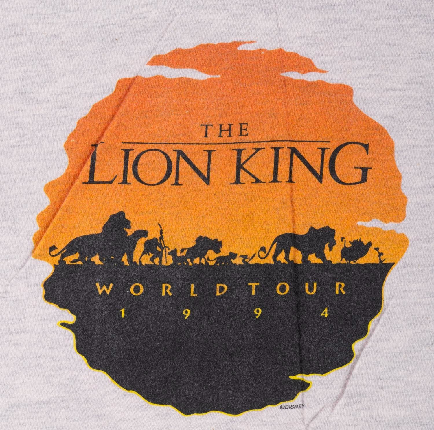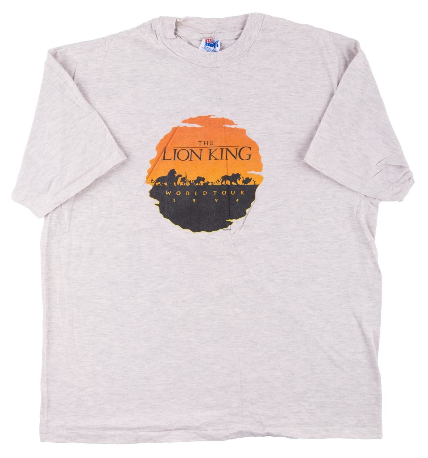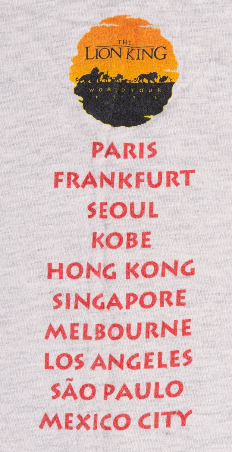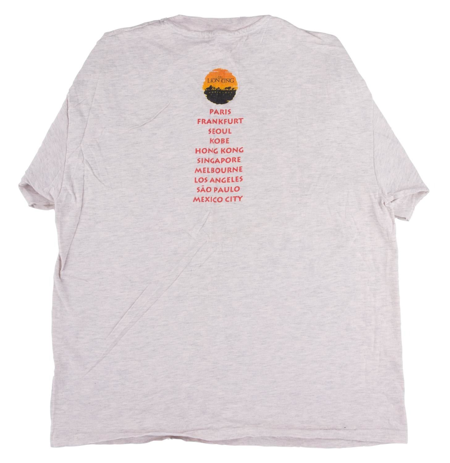 (Disney, 1994) A "The Lion King " World Tour 1994 t-shirt with ten international cities listed on the back. Labeled a size X-LARGE, the t-shirt is in very good condition with light discoloration from age and wear.