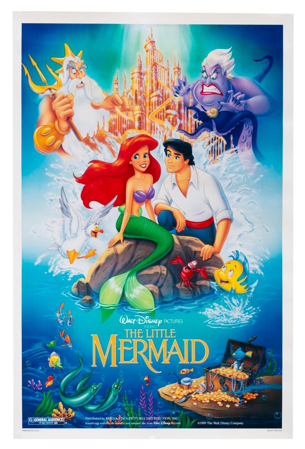 (Disney, 1989) An original theatrical one-sheet for "The Little Mermaid." Measuring 27" x 41", the poster displays in good condition with small creases throughout.