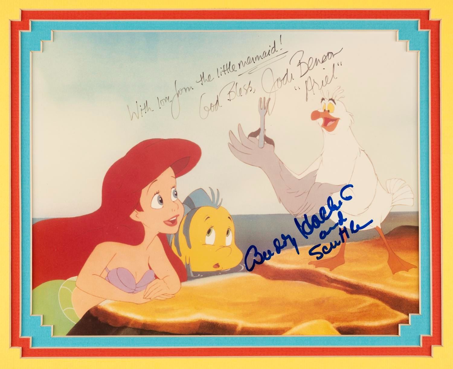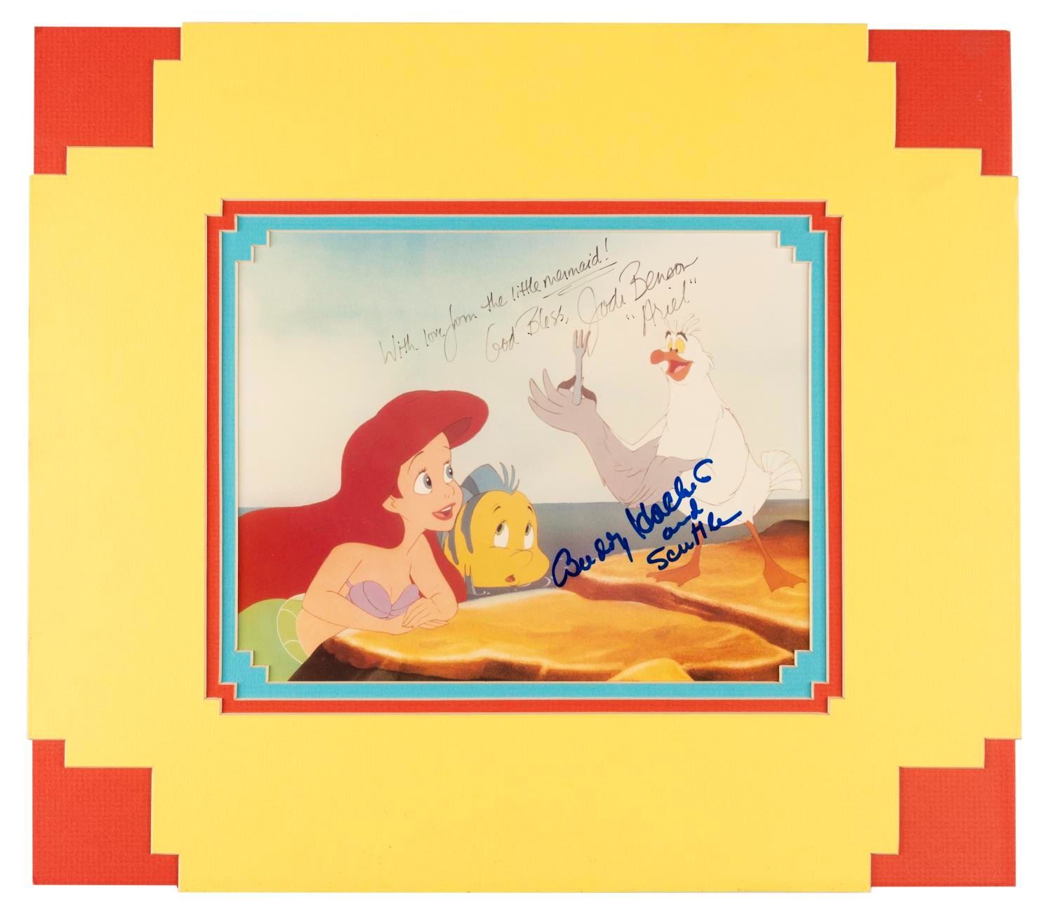 (Disney, 1990s) A color photo of Ariel and Scuttle from “The Little Mermaid,” signed by their voice artists, Jodi Benson and Buddy Hackett. Measuring 8” x 10” in a 14” x 16” matte, the signed photo is in very good condition.