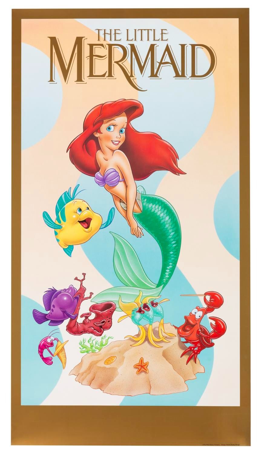 (Disney, 1989) An original poster print from "The Little Mermaid" featuring a vibrant image of Ariel, Flounder, and Sebastian. The limited edition print was created by Patrick Dooley to promote the feature film. A poster with a similar style was produced exclusively as a Cast Member print for the film "Aladdin." Measuring 18" x 33", the poster print is in very good condition with light smudges in the bottom border that do not affect the image.