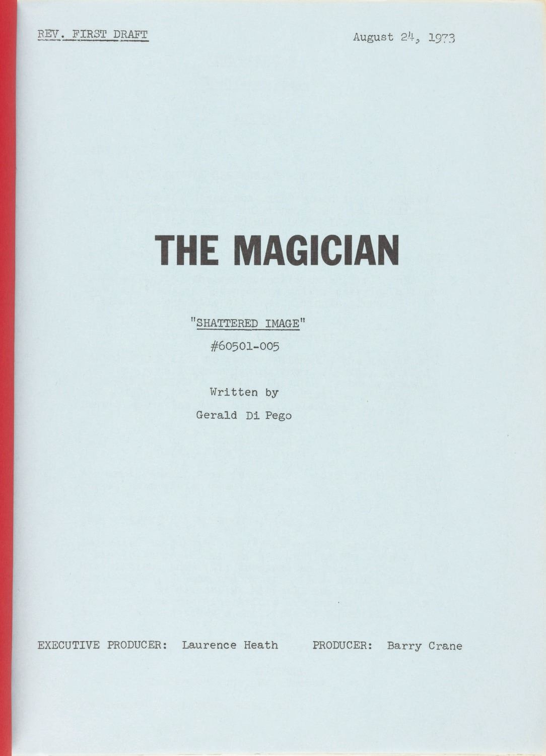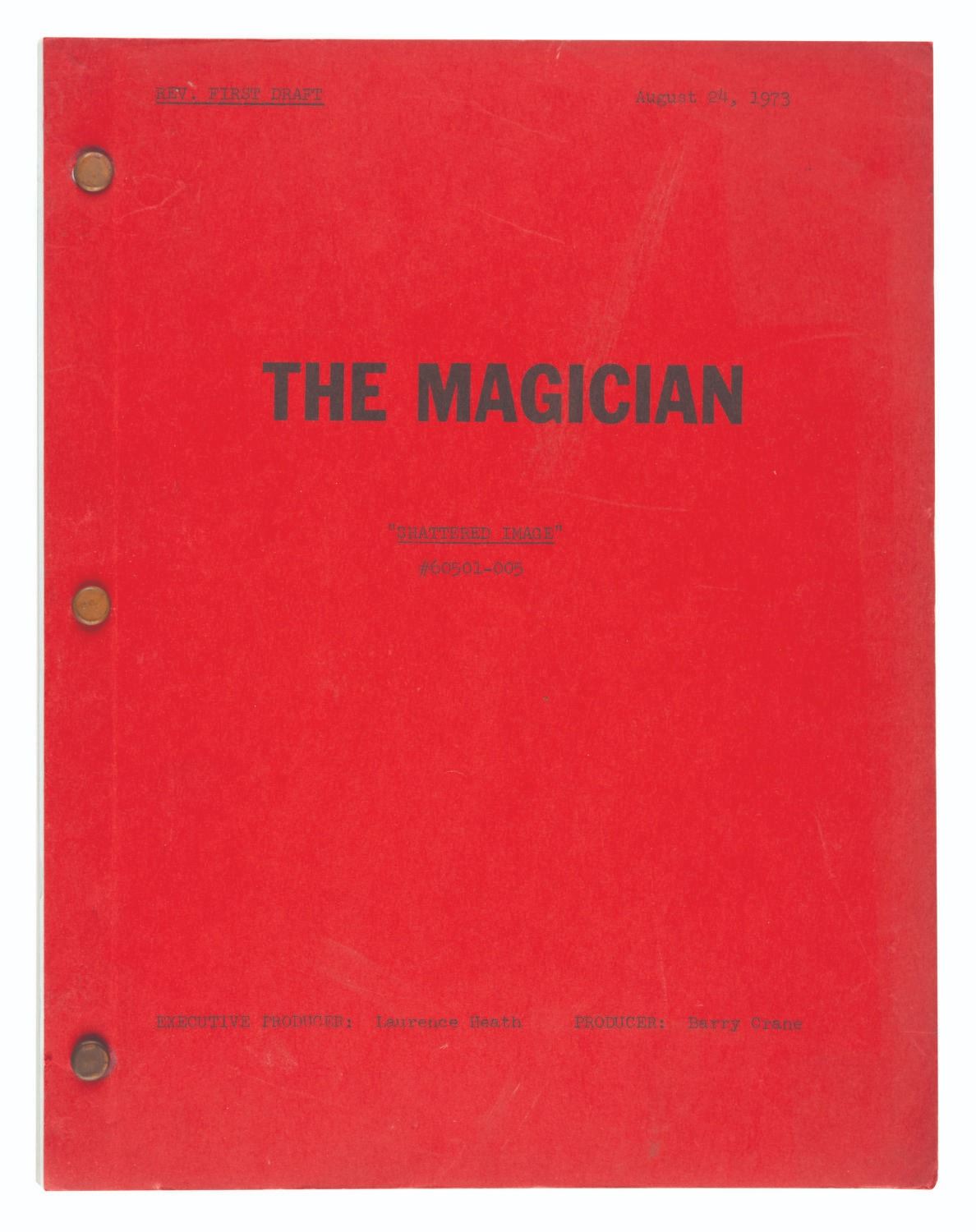 (NBC, 1973) A revised first draft script for “The Magician” episode “Shattered Glass,” written by Gerald Di Pego. Measuring 8.5” x 11”, the script from the Bill Bixby-led series is in good condition with scratches, wear from production use, and discoloration from age.