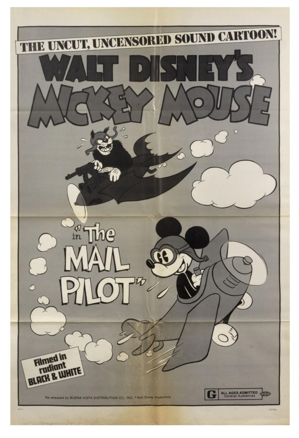 (Disney, 1974) A one-sheet for the theatrical re-release of the 1933 Mickey Mouse cartoon "The Mail Pilot." Measuring 27" x 41", the poster is in fair condition with discoloration from age, edge tears, spotting, wear, and pencil inscriptions.