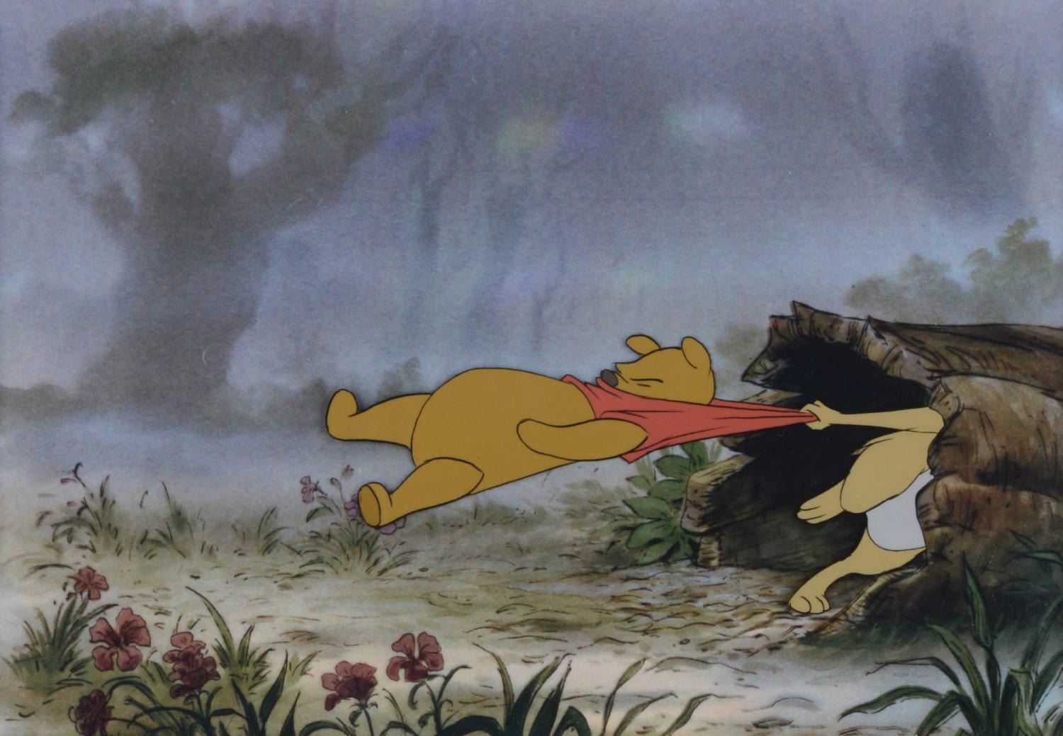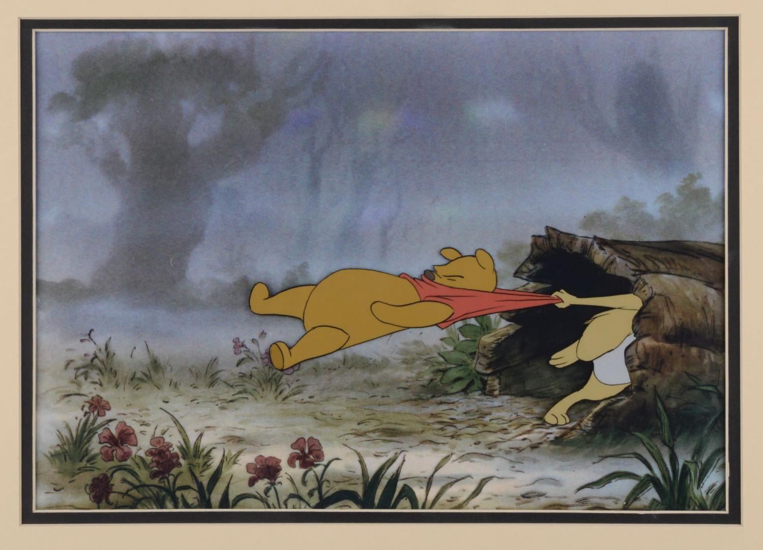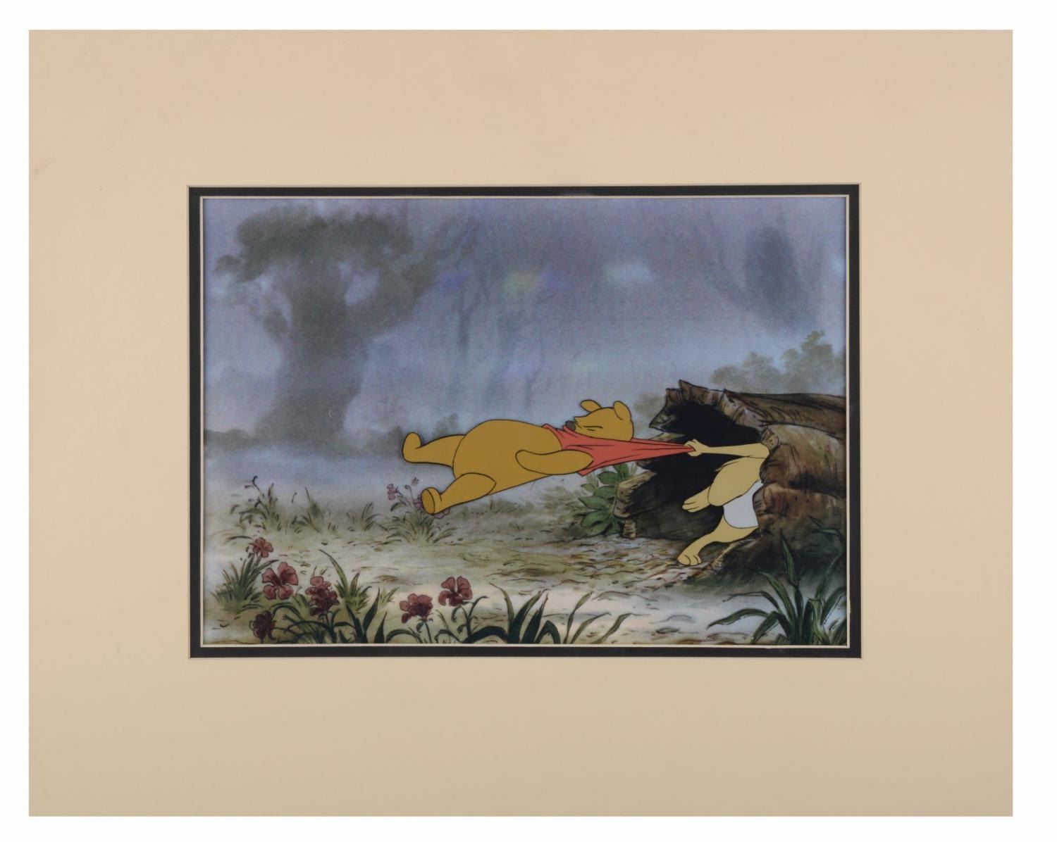 (Disney, 1977) An original production cel of Winnie the Pooh and Rabbit from "The Many Adventures of Winnie the Pooh," with a color copy background. Pooh and Rabbit measure 3.5" x 7.5" on a 12.5" x 16" animation cel in a 16" x 20" mat and is in very good, production-used condition while the mat exhibits minimal edge wear, discoloration and soiling from handling.