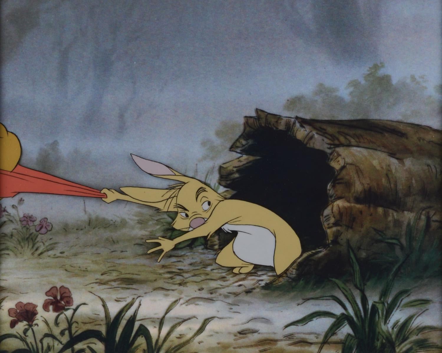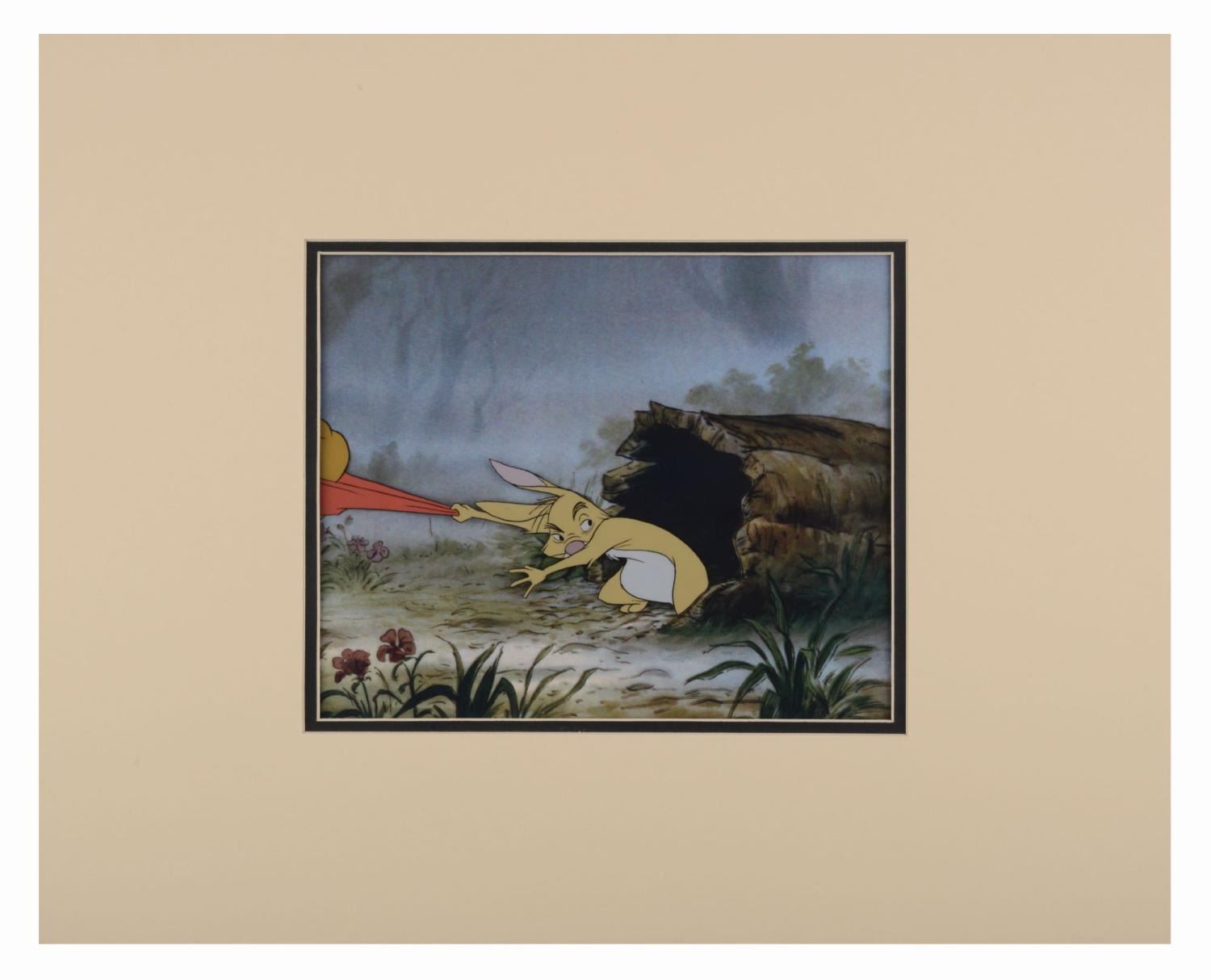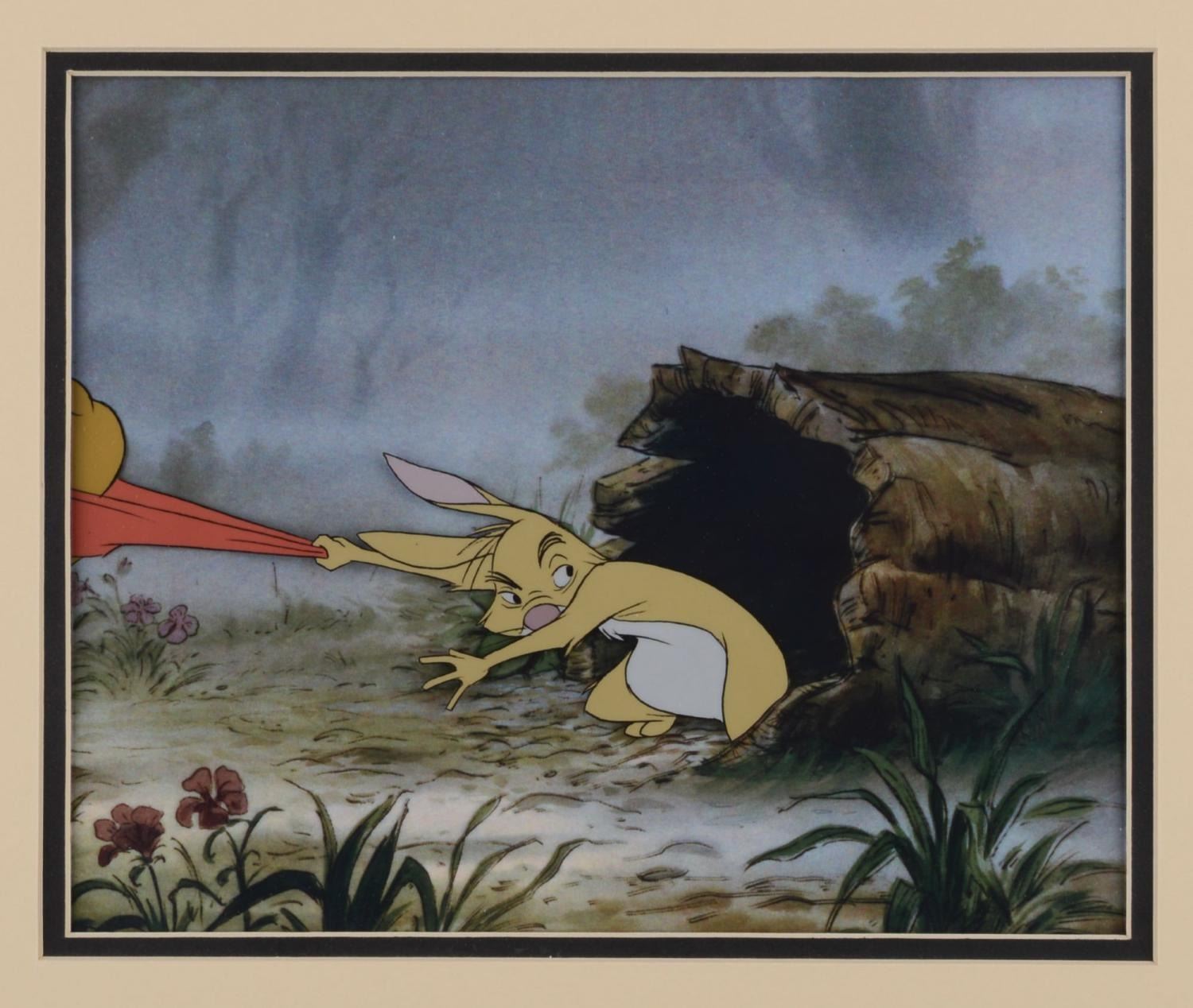 (Disney, 1977) An original production cel of Rabbit and Pooh's shirt from "The Many Adventures of Winnie the Pooh," with a color copy background. The characters have an image size of 3.25" x 7.25" on a 12.5" x 16" cel. The entire matted piece measures 16" x 20" and is in very good production-used condition. The matte exhibits minimal edge wear and discoloration from handling and age.