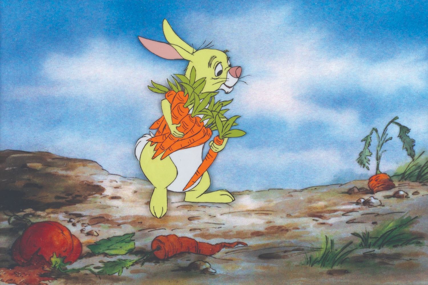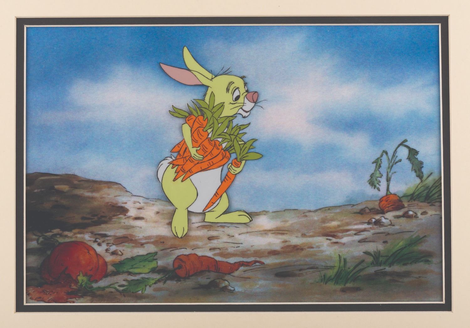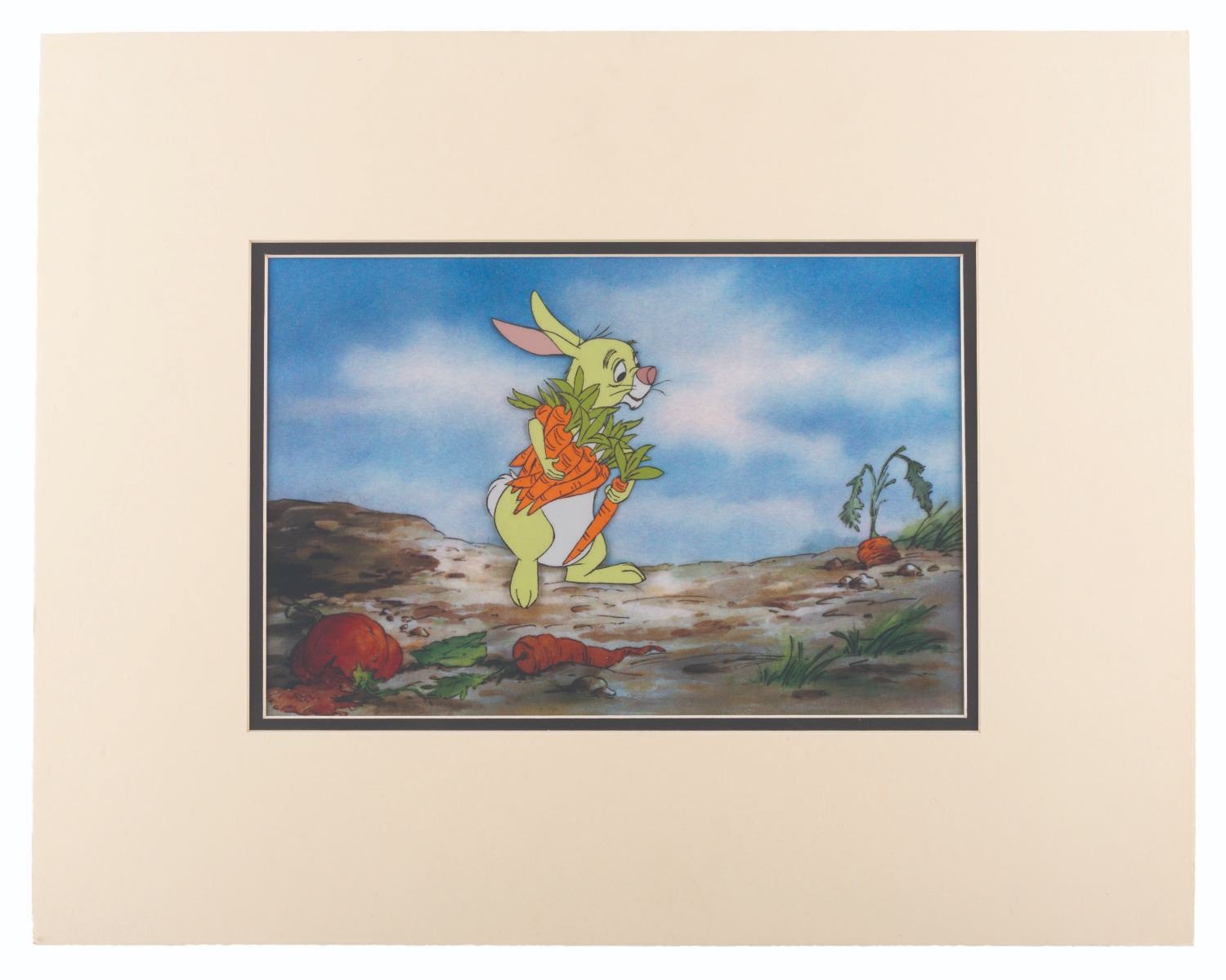 (Disney, 1977) An original production cel of Rabbit from "The Many Adventures of Winnie the Pooh," with a color copy background. Rabbit has an image size of 3" x 5.5" in an 8" x 12" visible cel. The entire matted piece measures 16" x 20" and is in very good condition with light warping, wear from production use, and wear to the matte.