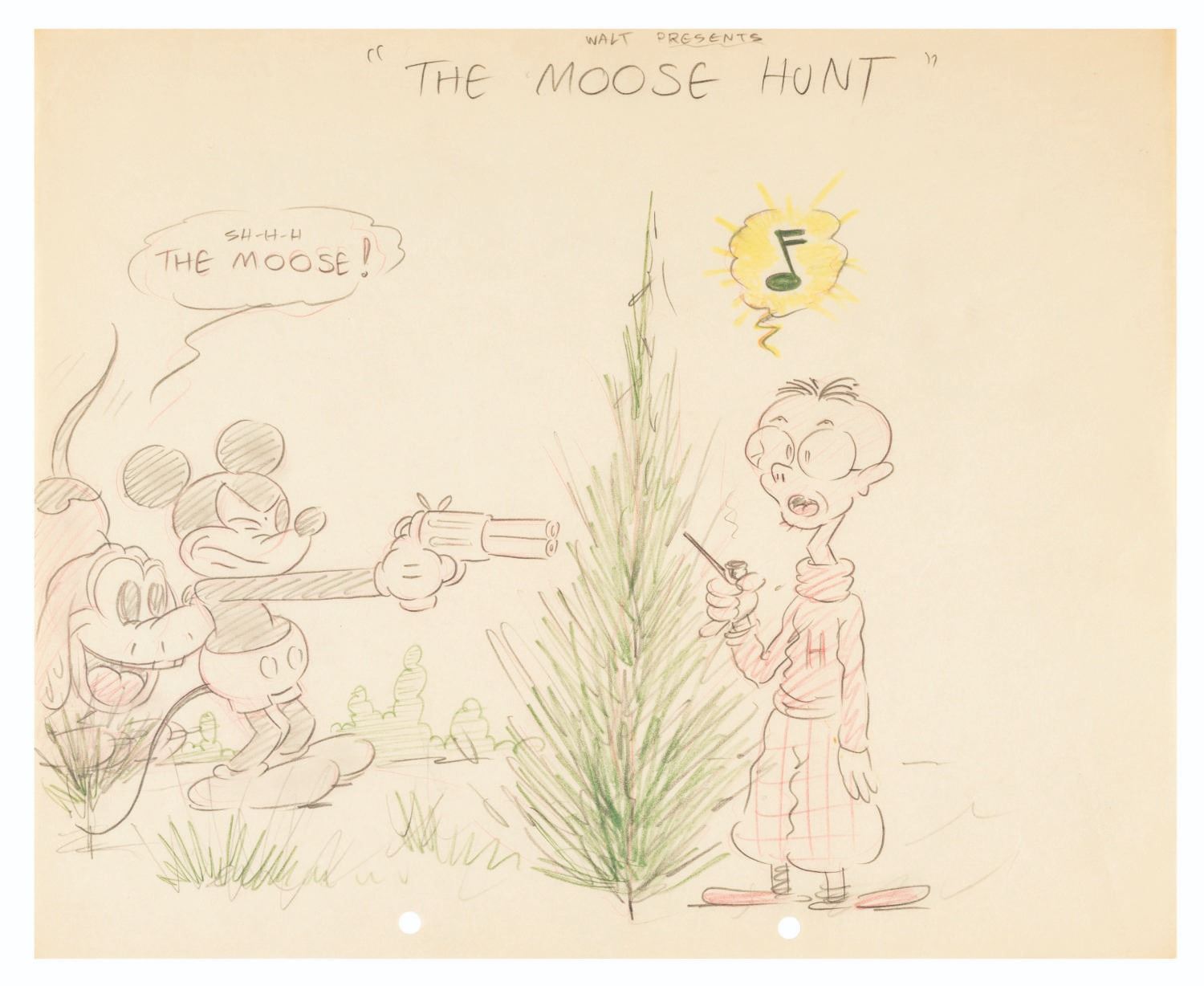 (Clampett, 1931) A gag drawing by Bob Clampett based on the Mickey Mouse short “The Moose Hunt.” Accomplished in graphite and colored pencil and measuring 9.75” x 12”, the drawing is in very good condition with light edge wear, creasing, and discoloration from age.