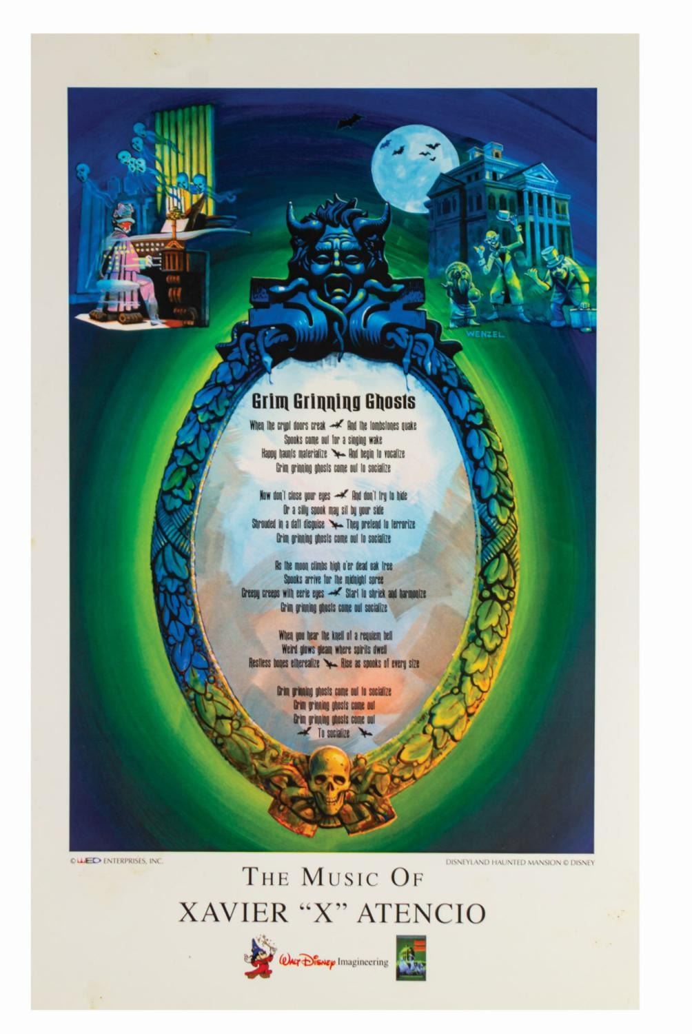 (WED, 1990s) A Walt Disney Imagineering poster for an event honoring the music of Disney Legend Xavier “X” Atencio. Atencio is best known for writing Pirates of the Caribbean’s “Yo Ho, A Pirate’s Life for Me” and co-writing the Haunted Mansion’s “Grim Grimming Ghosts. Measuring 17” x 11”, the poster is in fair condition with some spots of discoloration and wear around the border.