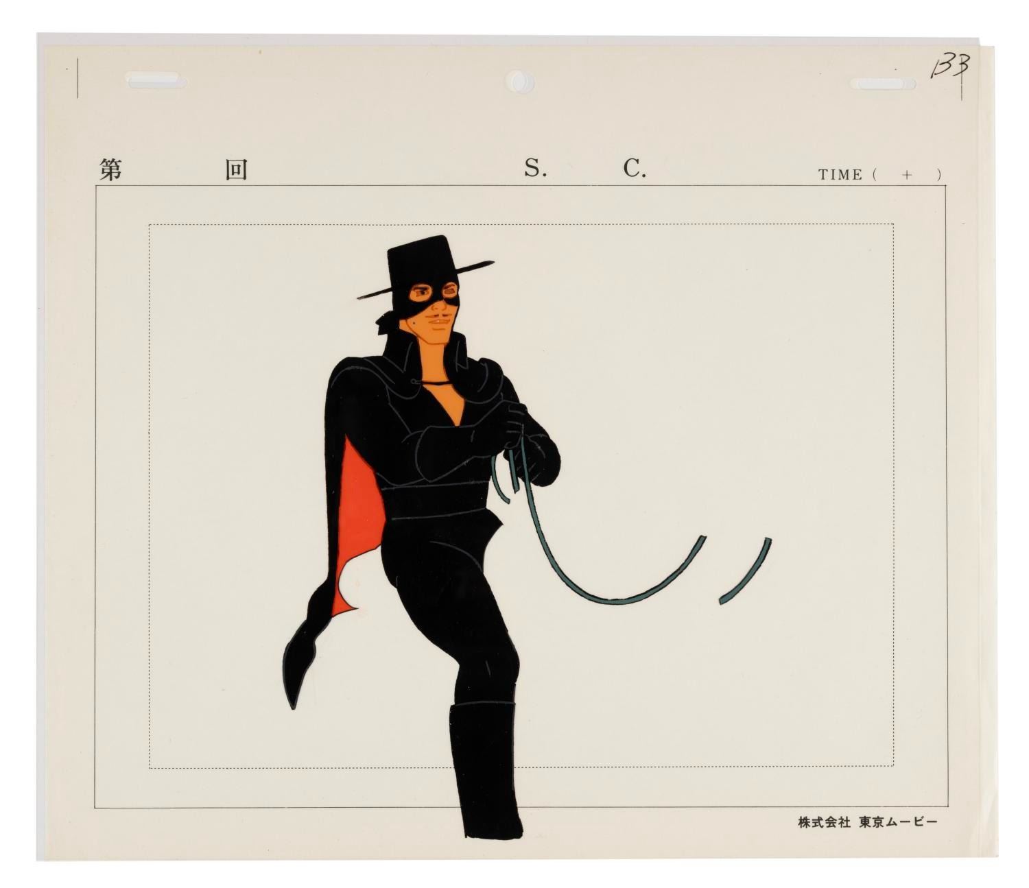 (Filmation, 1981) An original hand-painted production cel of Zorro from Filmation's TV series “The New Adventures of Zorro.” With a character image size of 5.5” x 6.5” on an untrimmed 10.5” x 9” animation cel, the piece is in good condition with slight line and paint loss to Zorro's eye and mouth, and adhered to the backing paper.
