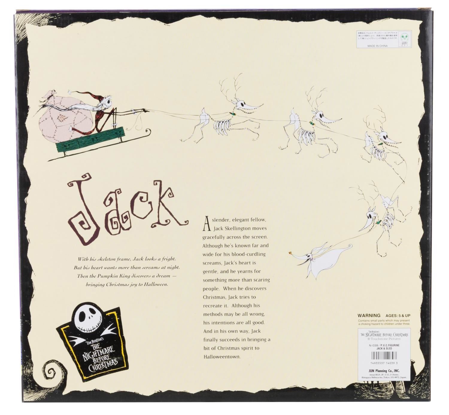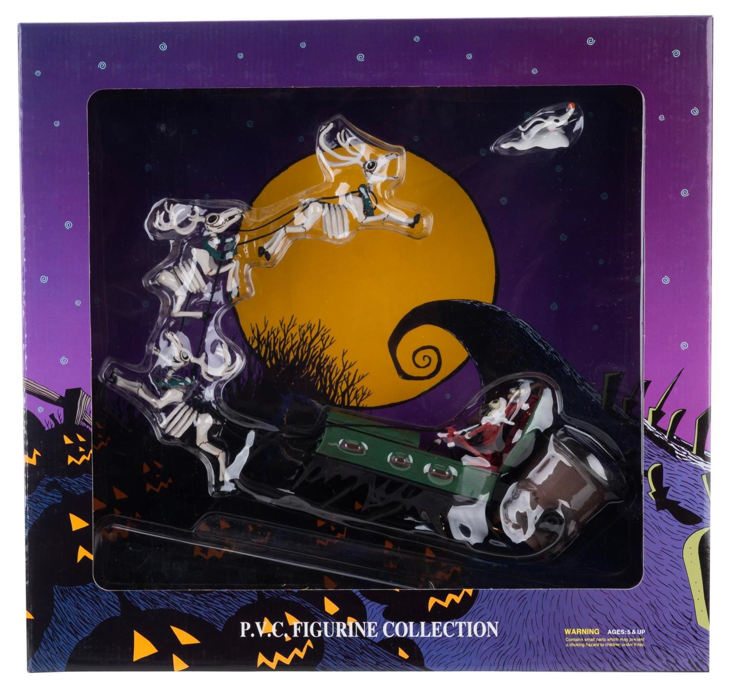 (JUN Planning, 1999) A Tim Burton's "The Nightmare Before Christmas" Jack and Sled P.V.C. figure set, released in a limited edition of 2400 in 1999. The set includes Santa Jack, Zero, the sleigh, and three skeletal reindeer. Measuring 16.25" x 15.25" x 4" overall, the figurine set is in fine condition within the original box.