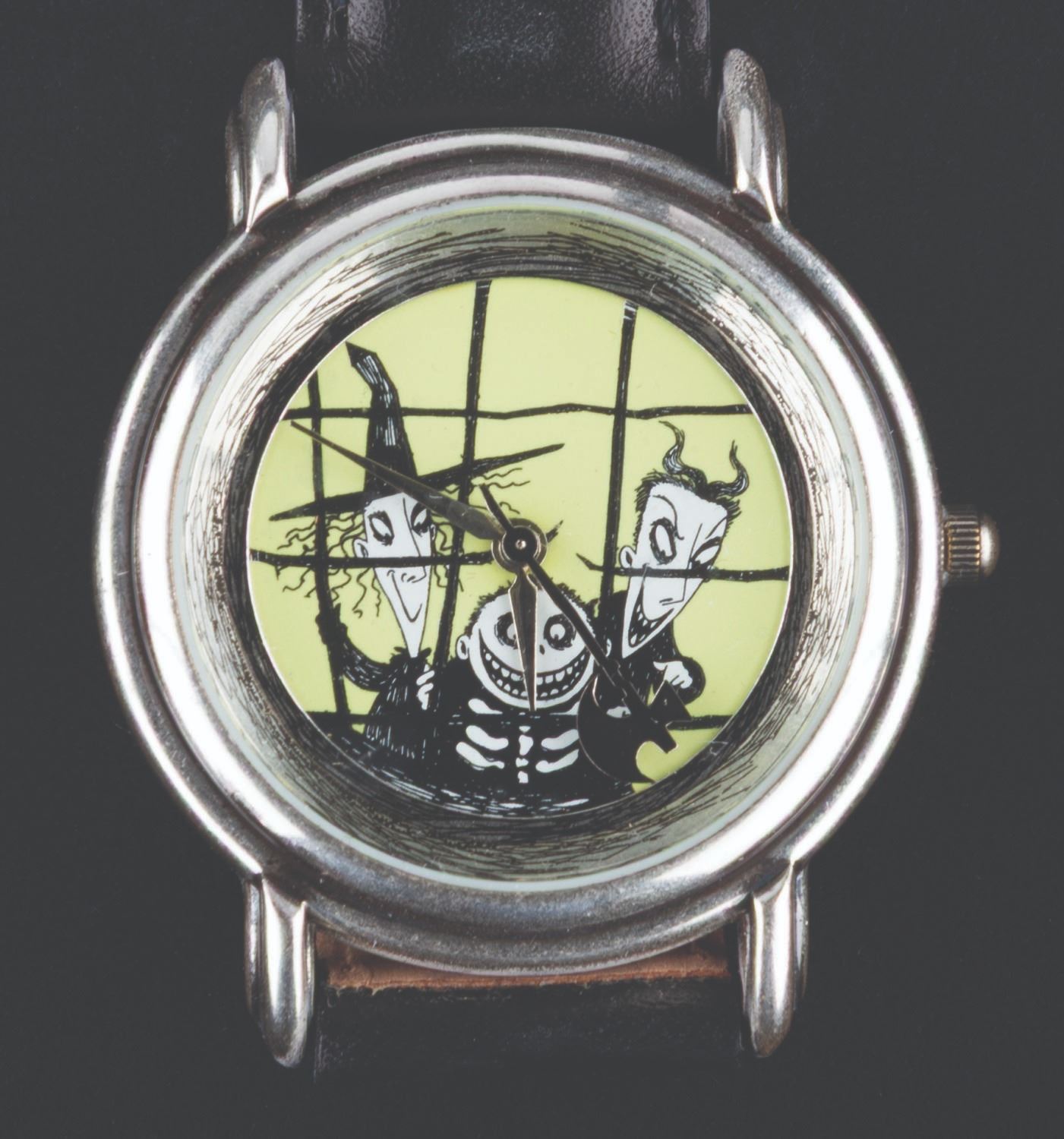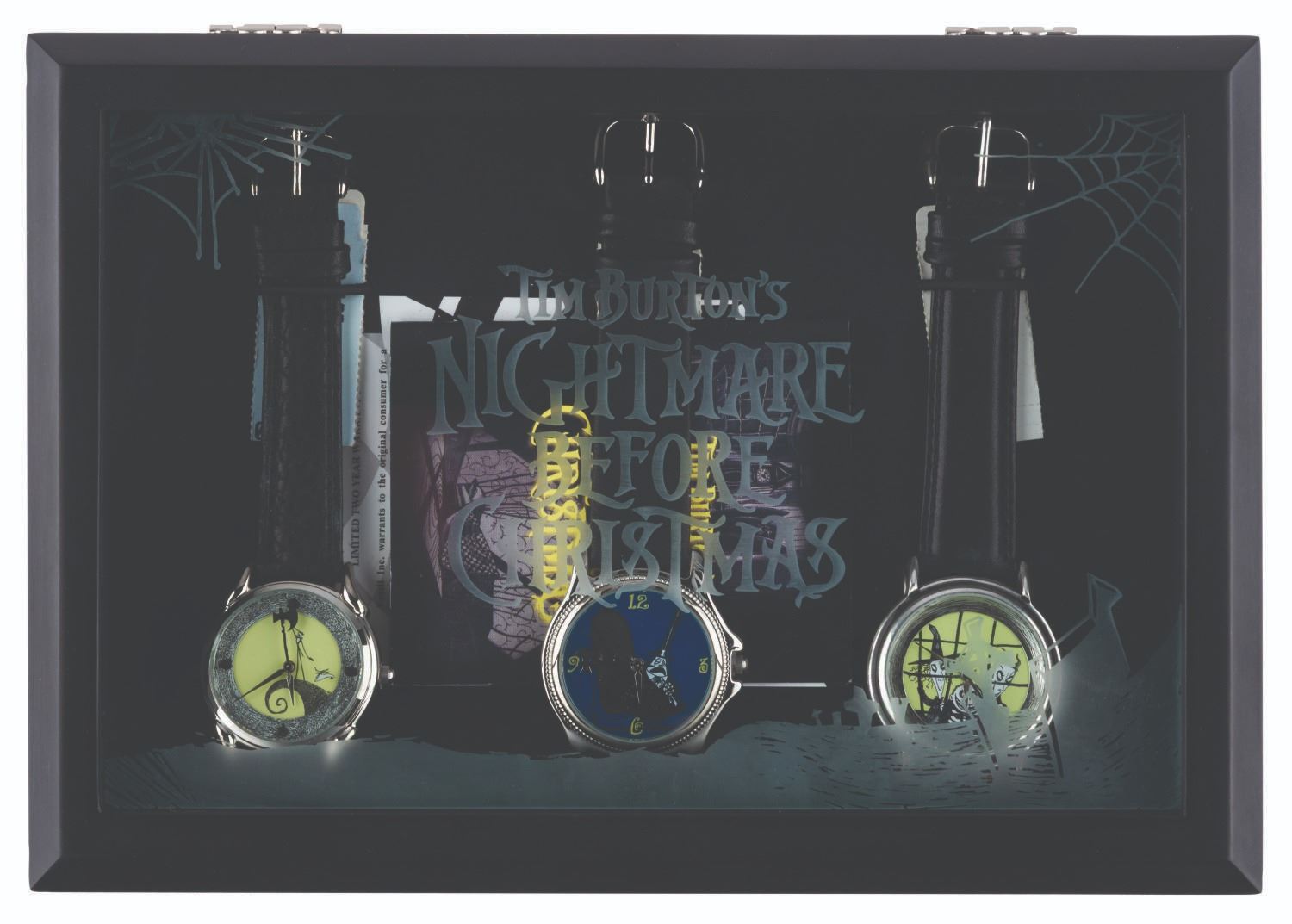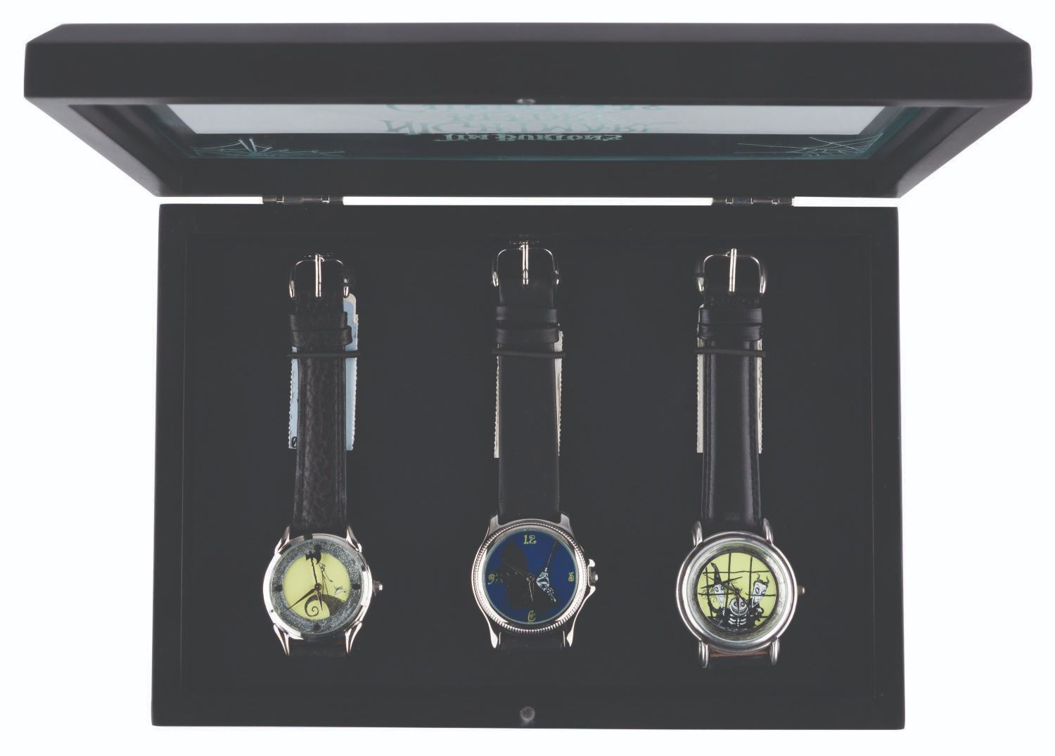 (Disney, 1990s-2000s) A set of three "The Nightmare Before Christmas" watches, exclusively sold at The Disney Gallery. Featuring Jack Skellington, the Mayor of Halloween Town, and Lock, Shock, and Barrel, the set was released in a limited edition and is numbered 0189/1500. Measuring 8.75" x 6" x 2" tall, the box set is in very good condition with scratches and light wear. The watches have not been tested and likely require new batteries or service to function.