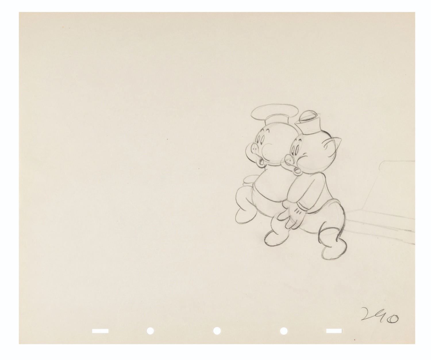 (Disney, 1939) An original production drawing of Fifer and Fiddler Pig from the Silly Symphony short “The Practical Pig.” With a character image size of 5” x 5.5” on 10” x 12” drawing paper, the art is in very good condition with light creases.