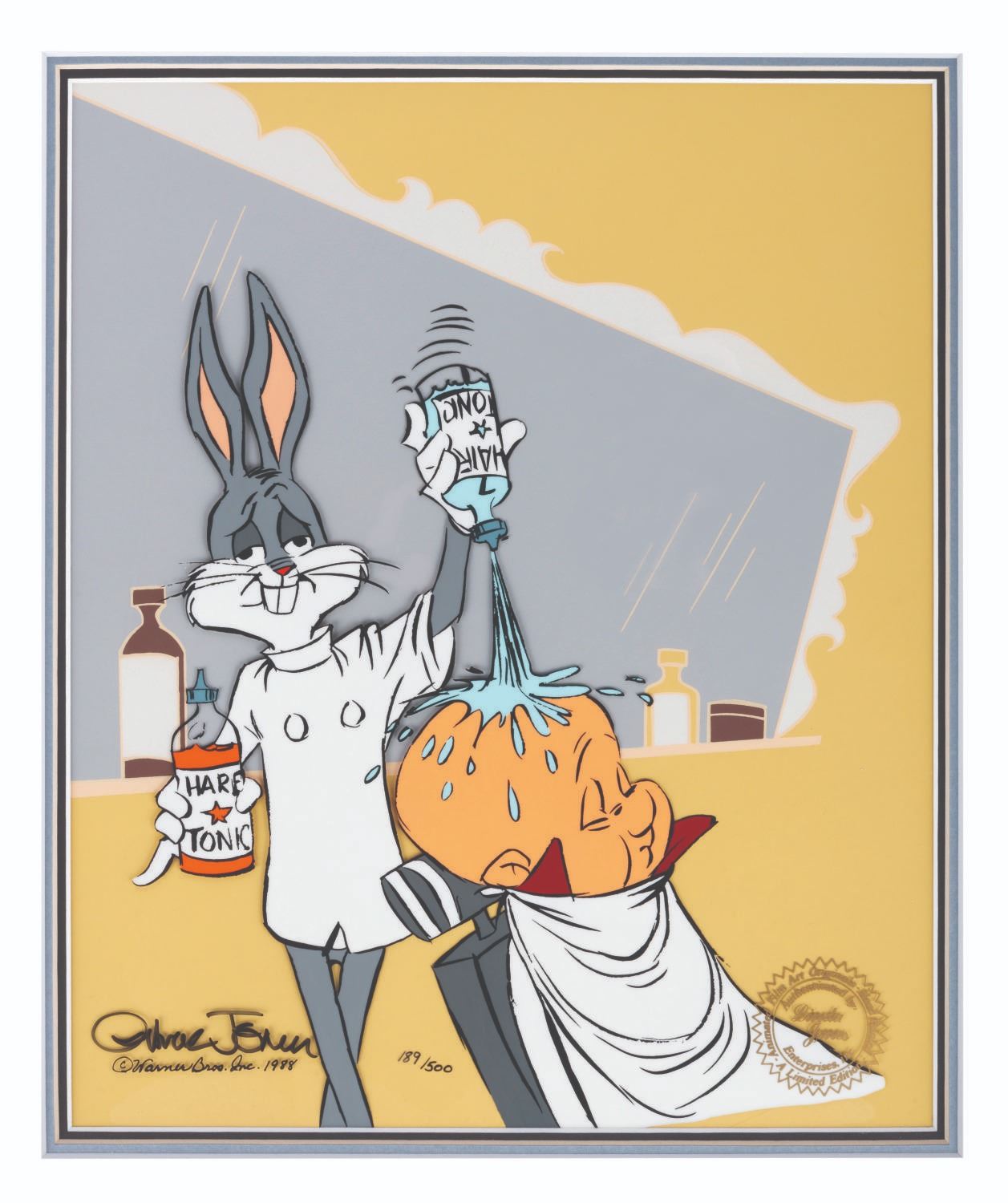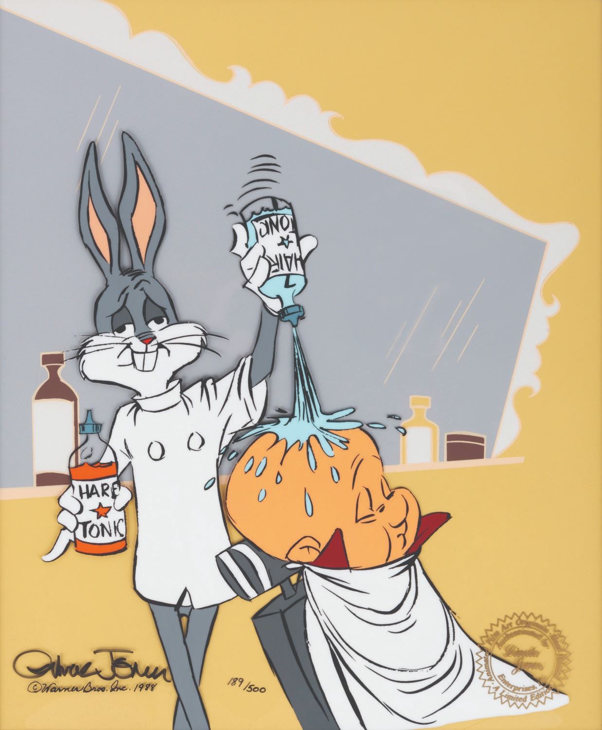 (Warner Bros., 1988) A hand-painted limited edition cel of Bugs Bunny and Elmer Fudd, titled"The Rabbit of Seville II." The cel is numbered 189 out of 500 and has been hand-signed by animation legend Chuck Jones. Measuring 10.5"x12.5", this cel is in fine condition.
