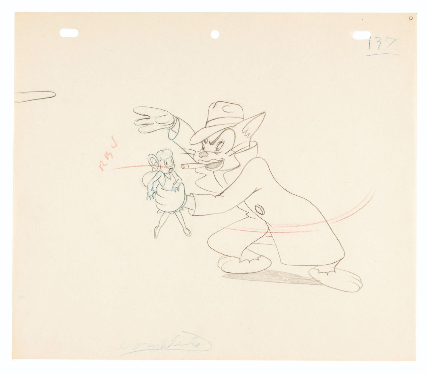 (Terrytoons, 1949) An original production drawing of Pearl Purehart and an Edward G. Robinson-inspired gangster cat from the Mighty Mouse short “The Racket Buster.” Accomplished in graphite and colored pencil, with a character image size of 5.75” x 7” on a sheet of 9.5” x 11” animation paper, the drawing is in very good condition with light discoloration from age. Terrytoons was a prolific animation studio known for producing theatrical shorts, including popular series such as Heckle and Jeckle, Gandy Goose, and, most famously, Mighty Mouse. Originally conceived as a parody of Superman, the Mighty Mouse shorts evolved into a spoof of melodramas featuring a cast of archetypal characters, including the damsel in distress and the sinister mustache-twirling villain. In the 1950s, Terrytoons expanded into television, producing series like Deputy Dawg and Tom Terrific.