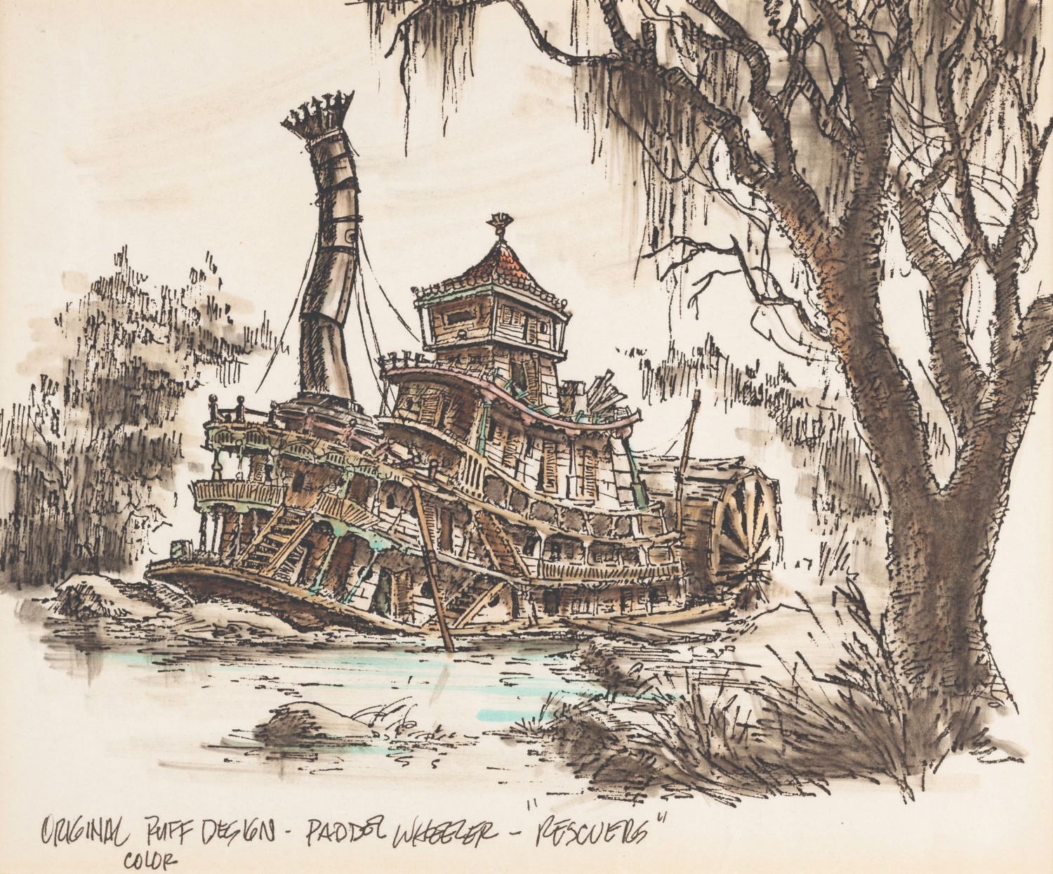 (Disney, 1977) An original hand-colored production-used xerox of the rough design of Medusa’s boat from “The Rescuers.” Presented in a 12.5” x 14.5” double matte with an opening of 8.25” x 10”, the xerox is in very good condition with minor creasing from production use.