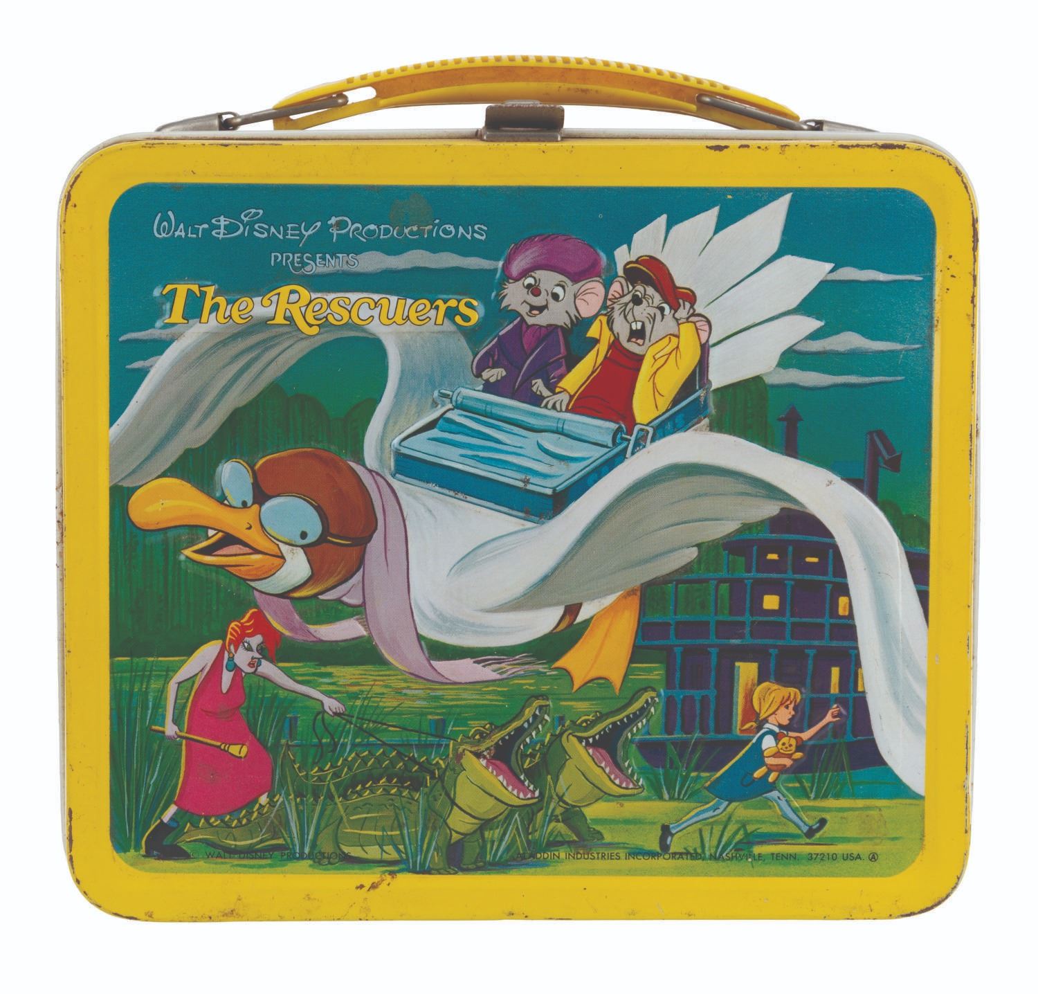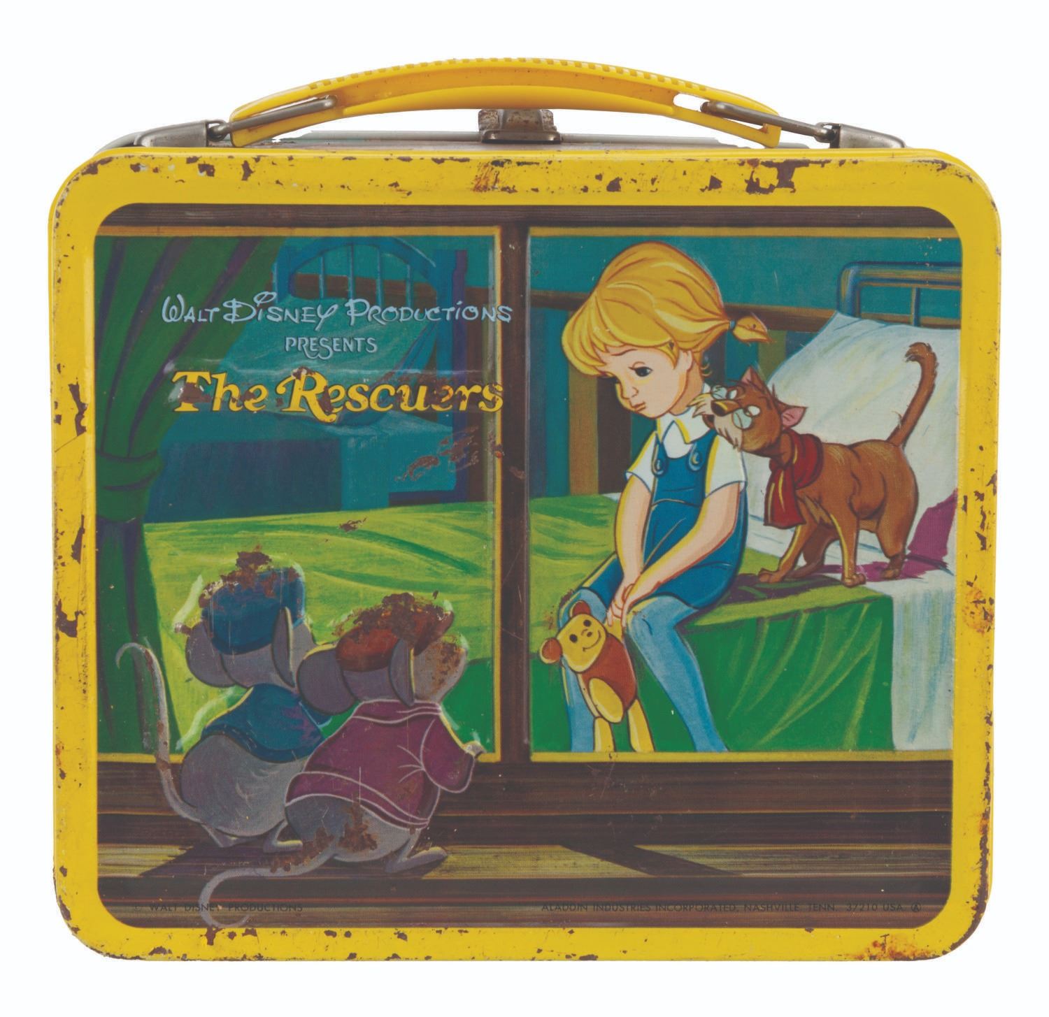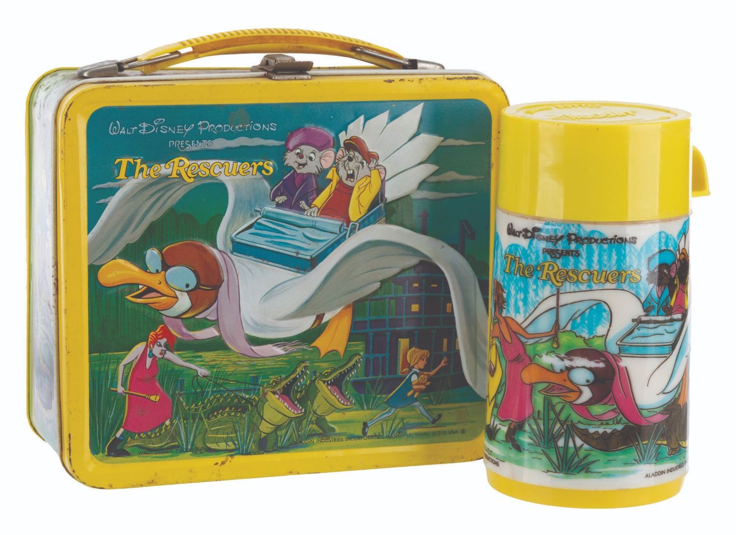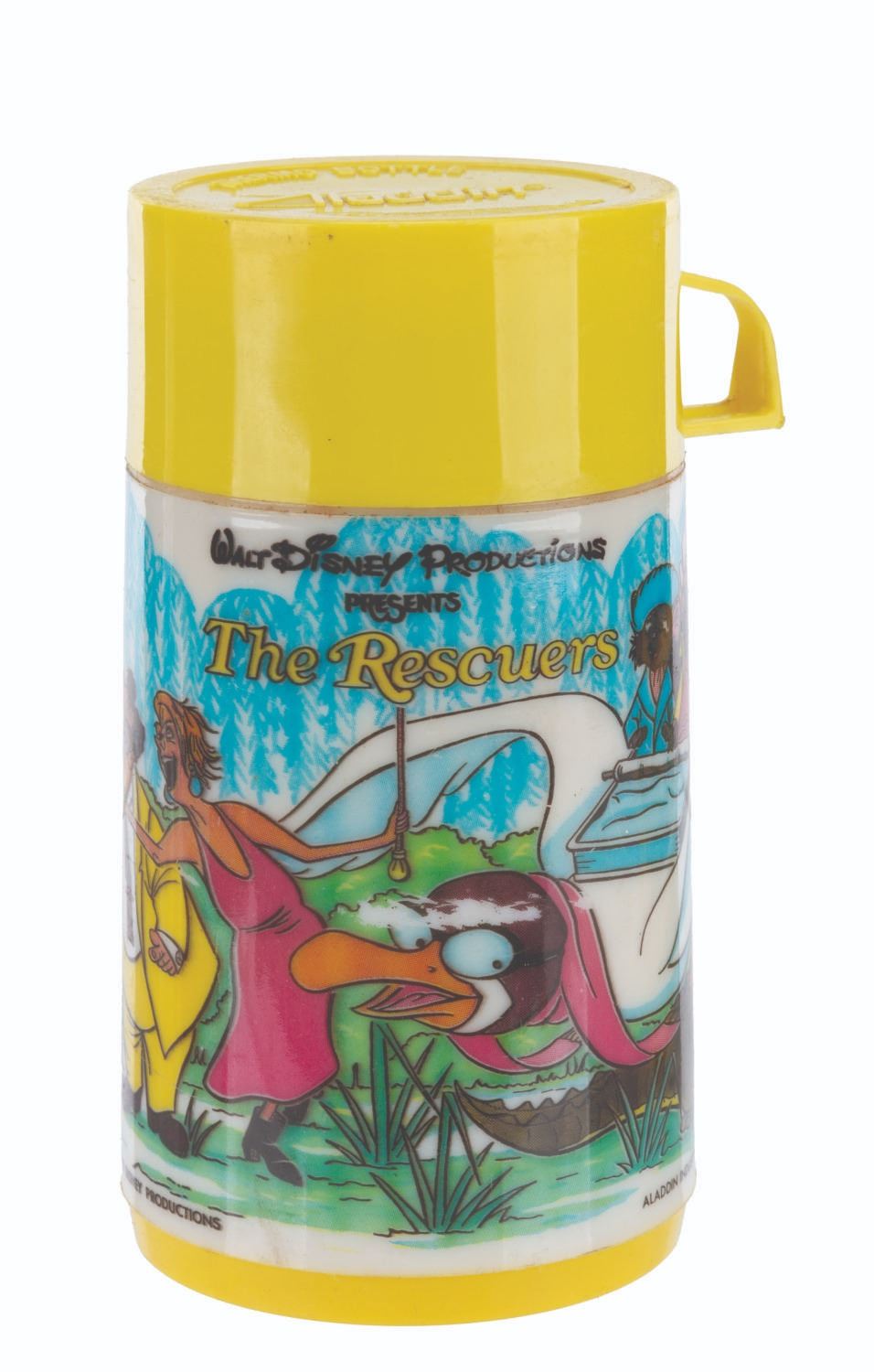 (Aladdin, 1997) A lunchbox and thermos set themed to the Disney animated feature "The Rescuers." The lunchbox measures 8.25" x 4" x 7.5" tall, and the thermos 6.5" tall and 3.25" in diameter, both in good condition with oxidation from age throughout, scratches, scrapes, sticker residue, and wear.