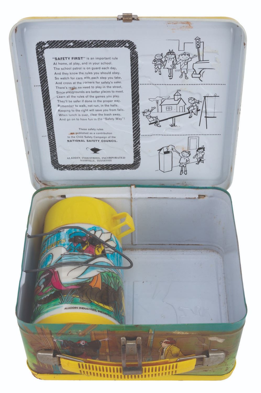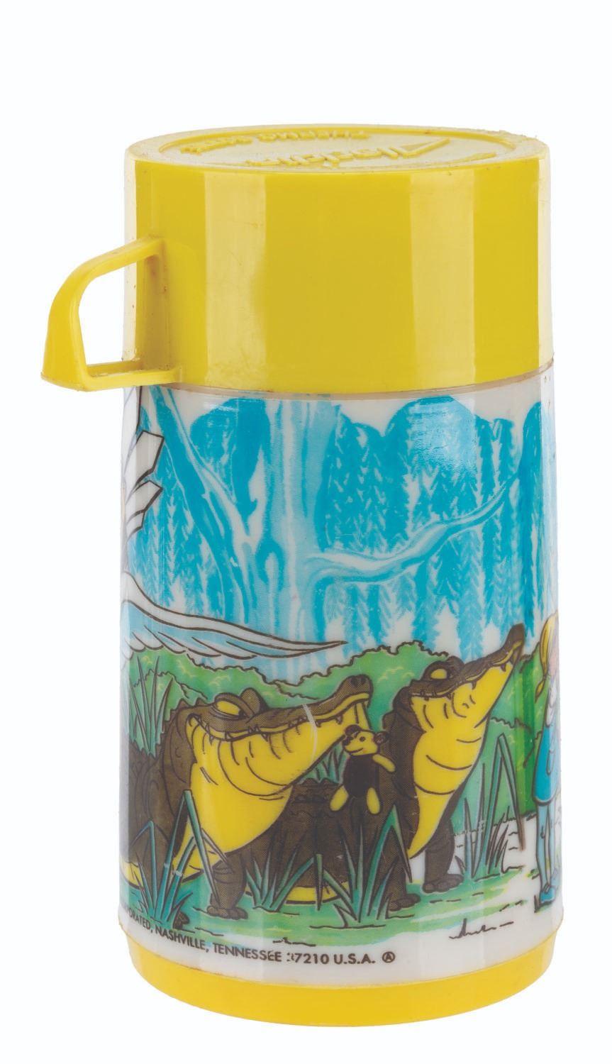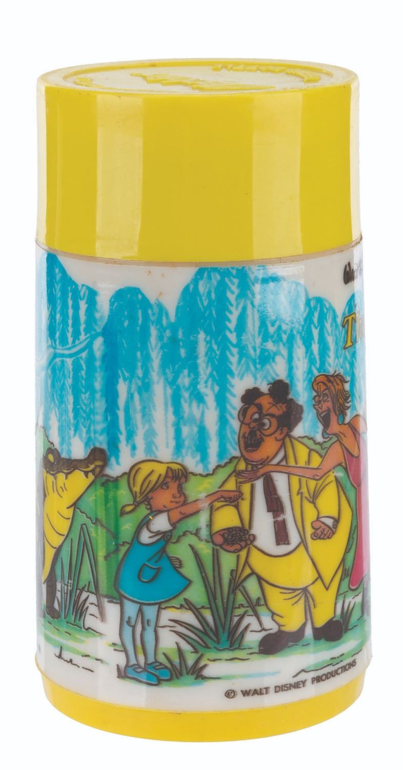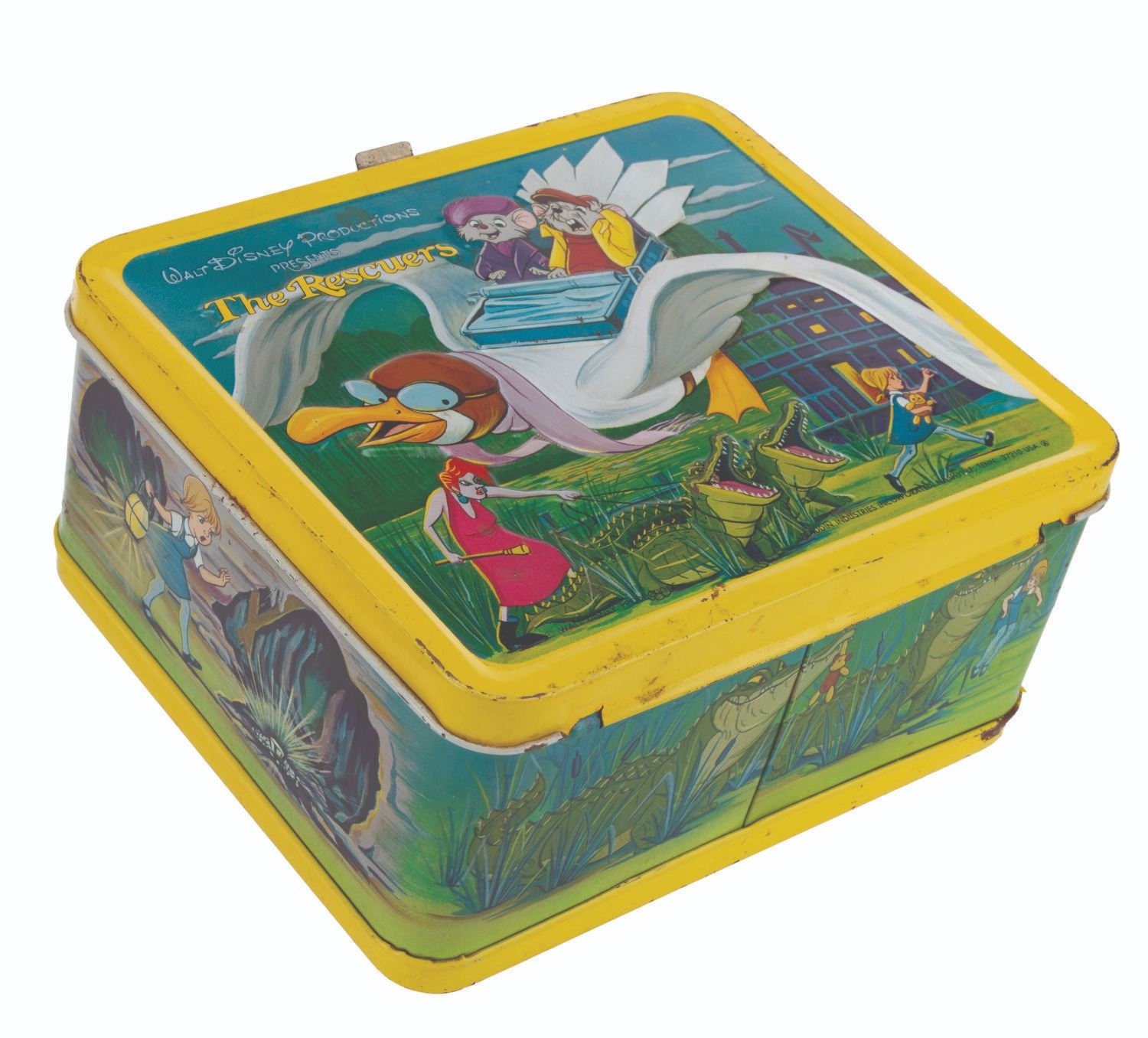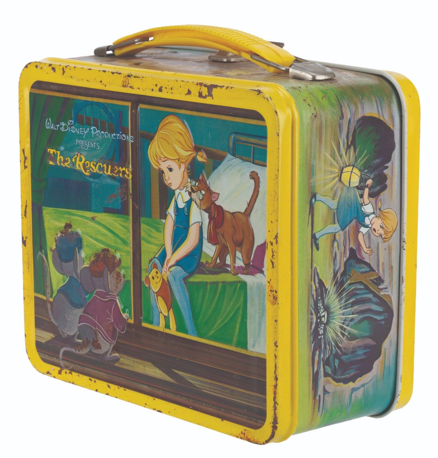 (Aladdin, 1997) A lunchbox and thermos set themed to the Disney animated feature "The Rescuers." The lunchbox measures 8.25" x 4" x 7.5" tall, and the thermos 6.5" tall and 3.25" in diameter, both in good condition with oxidation from age throughout, scratches, scrapes, sticker residue, and wear.