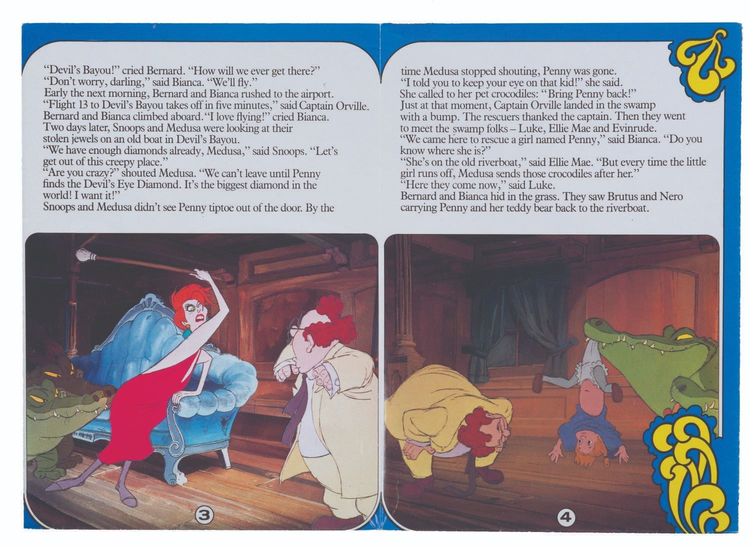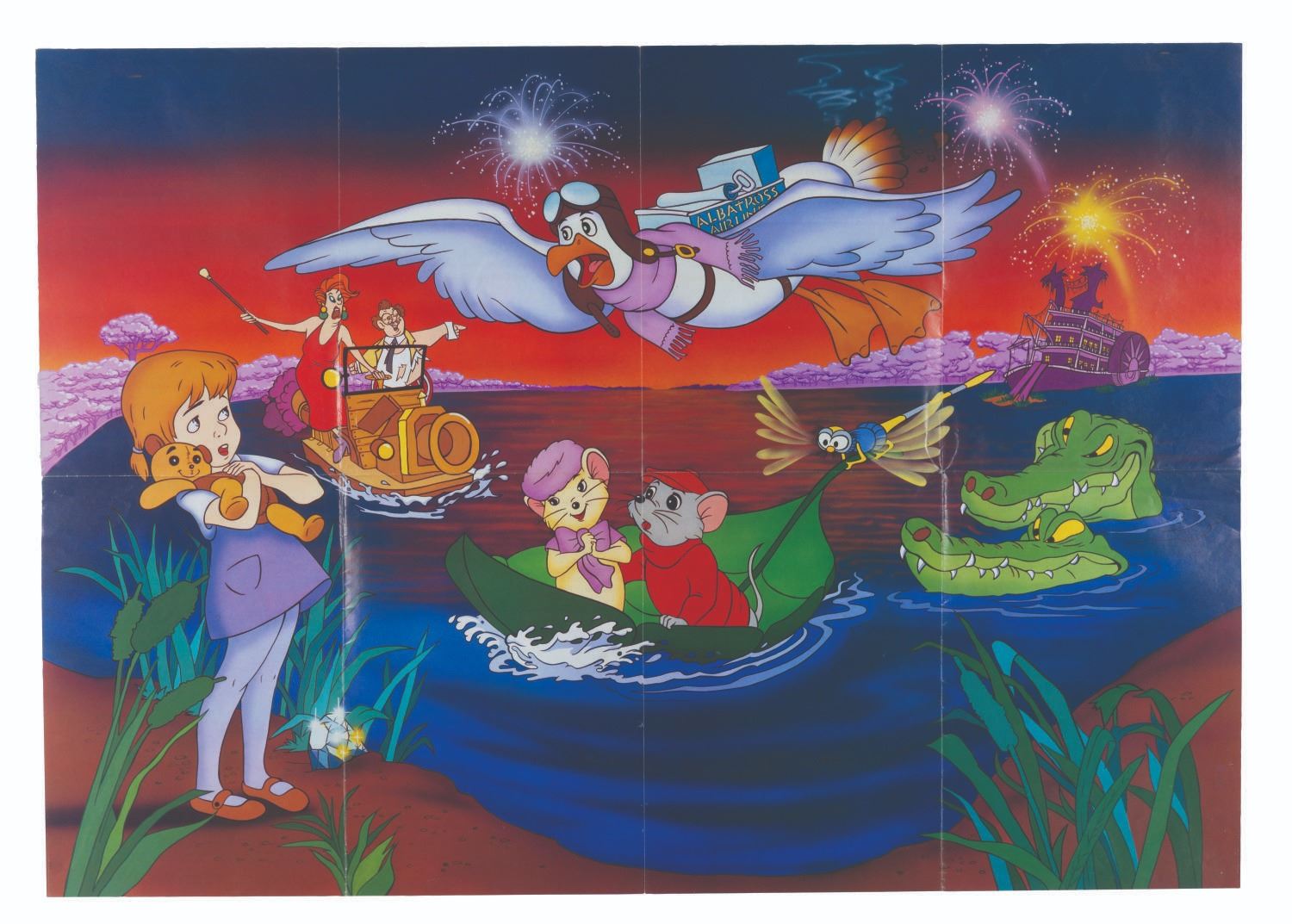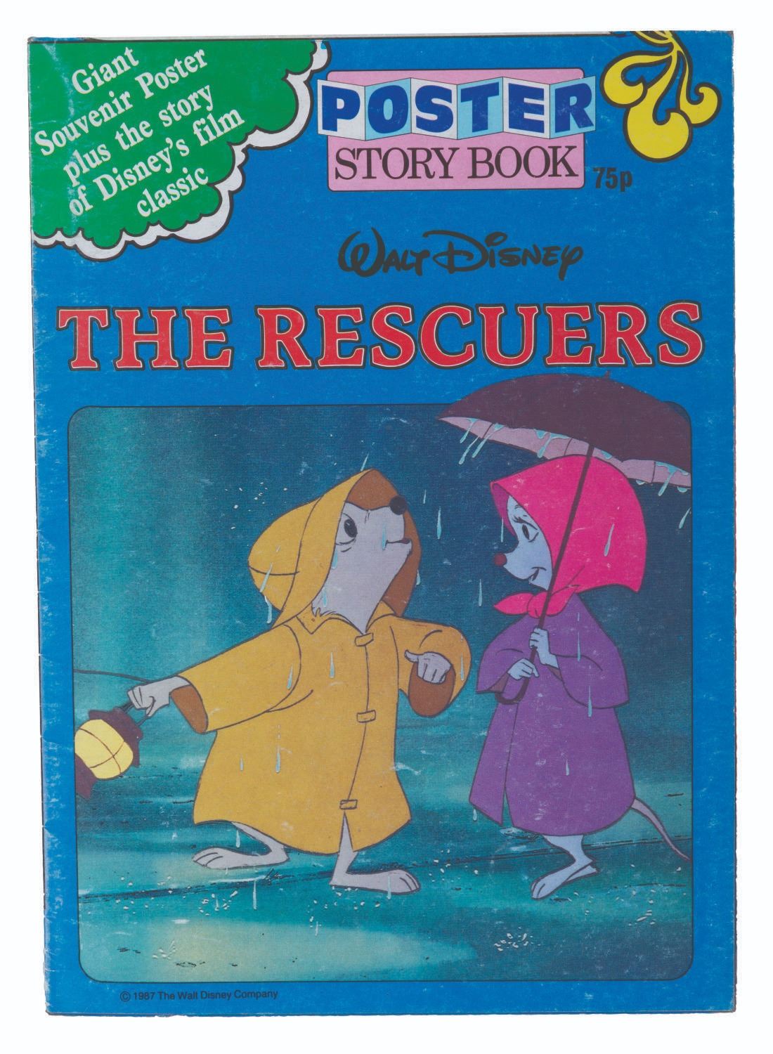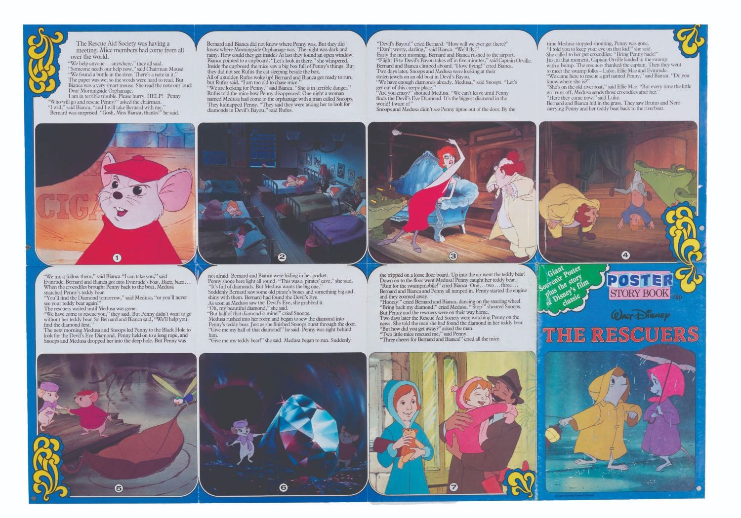(Disney, 1987) A “The Rescuers” storybook that opens up to a 23.25” x 33” poster of characters from the film. Measuring 8.25” x 11.75”, the storybook is in good condition with wear along original folds and scuffs to the cover.