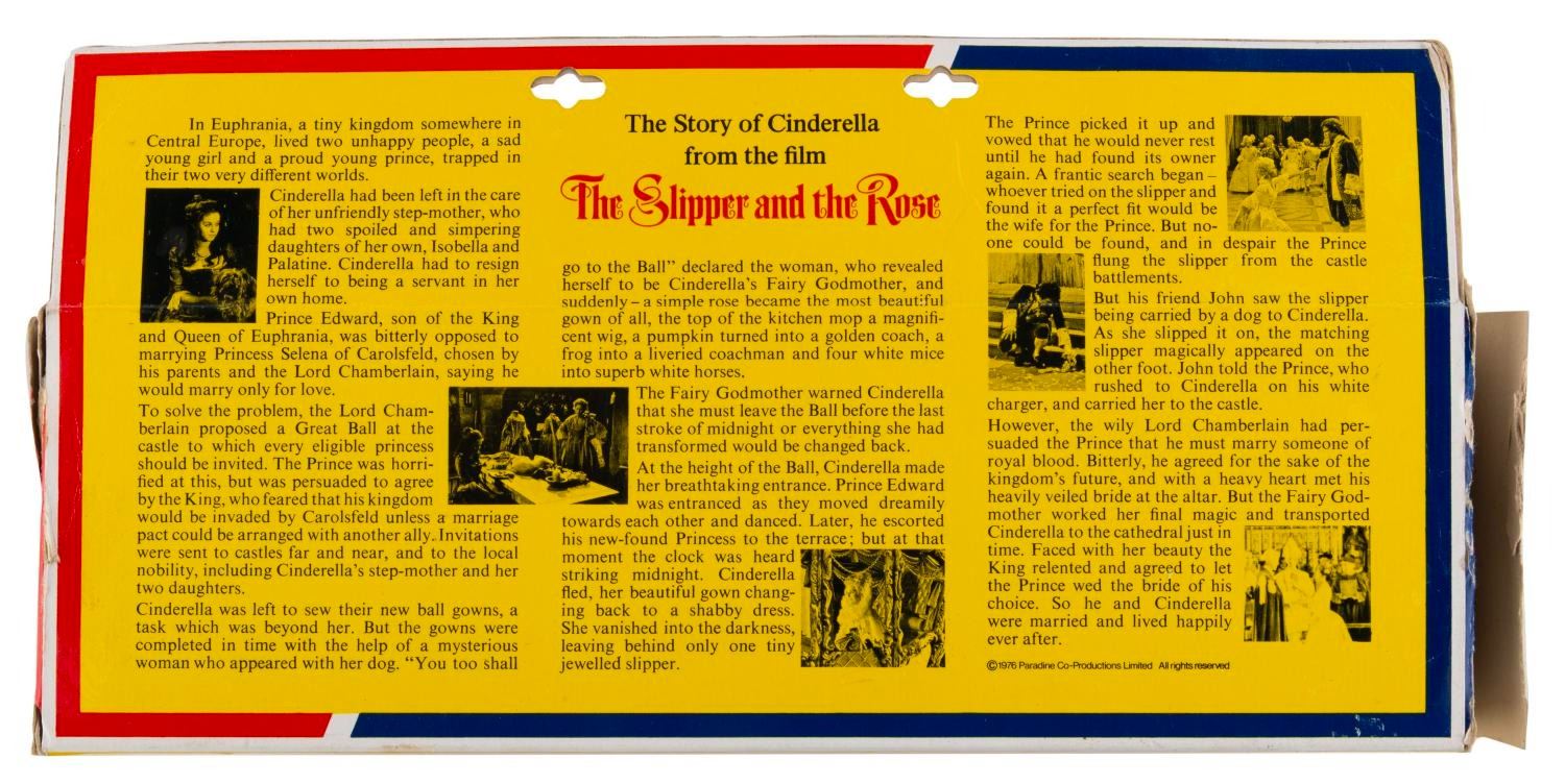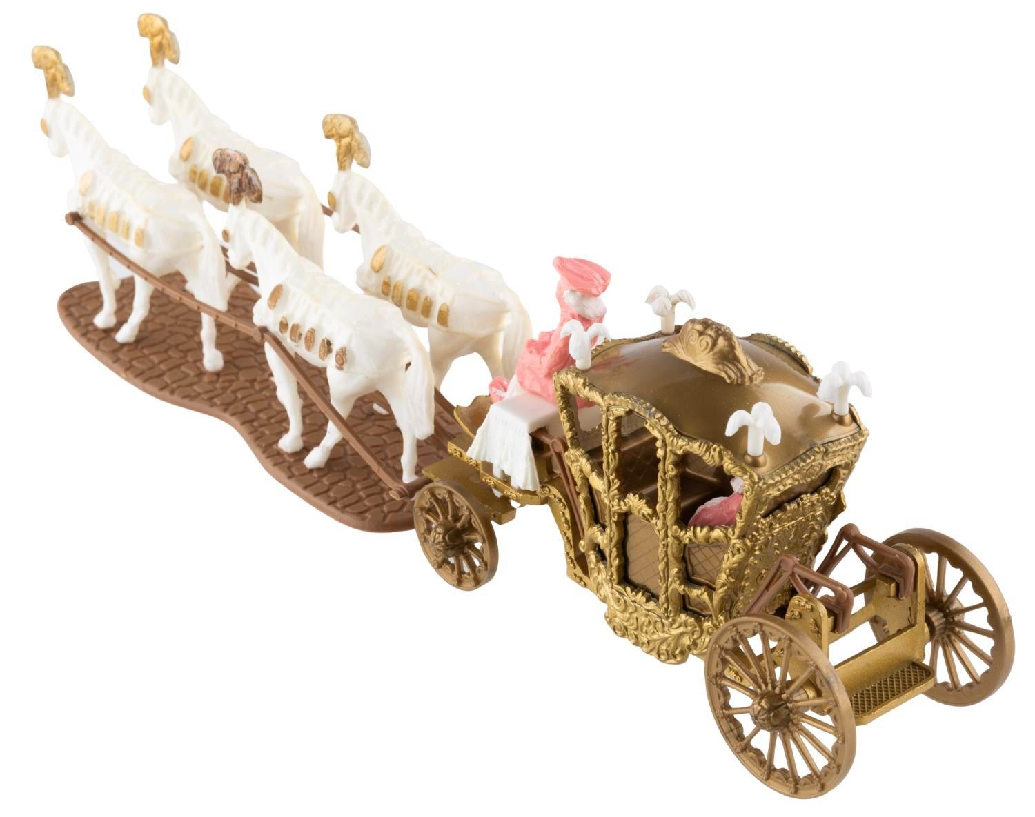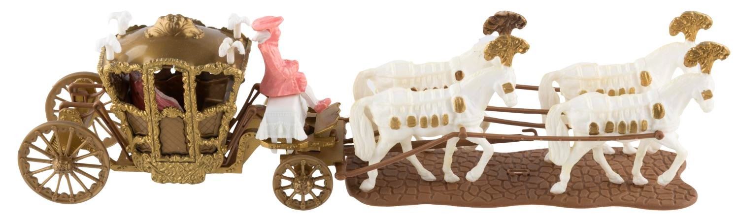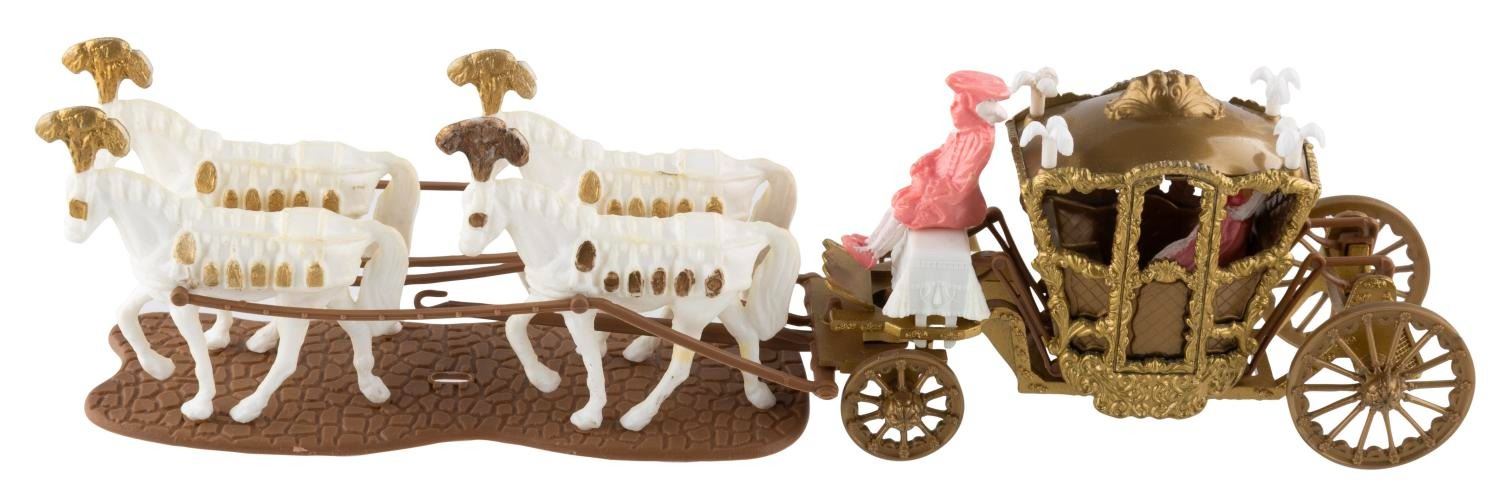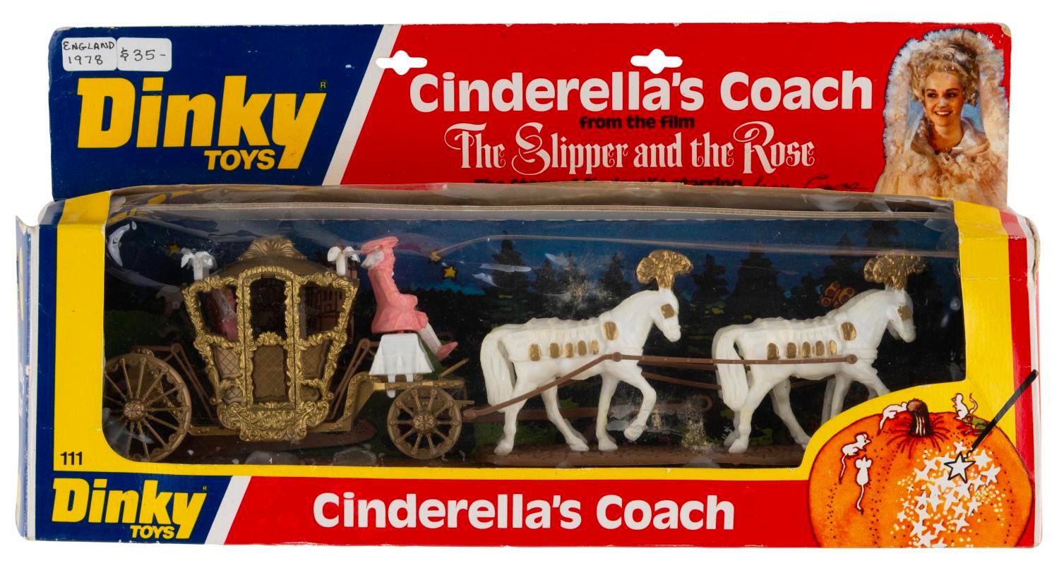 (Dinky Toys, 1976) A Cinderella’s Coach toy inspired by the film "The Slipper and the Rose." The coach and four-horse toy with Cinderella inside measures 9.25" x 1.5" x 2.5" tall and is in very good condition with very light wear, with the fair condition box.