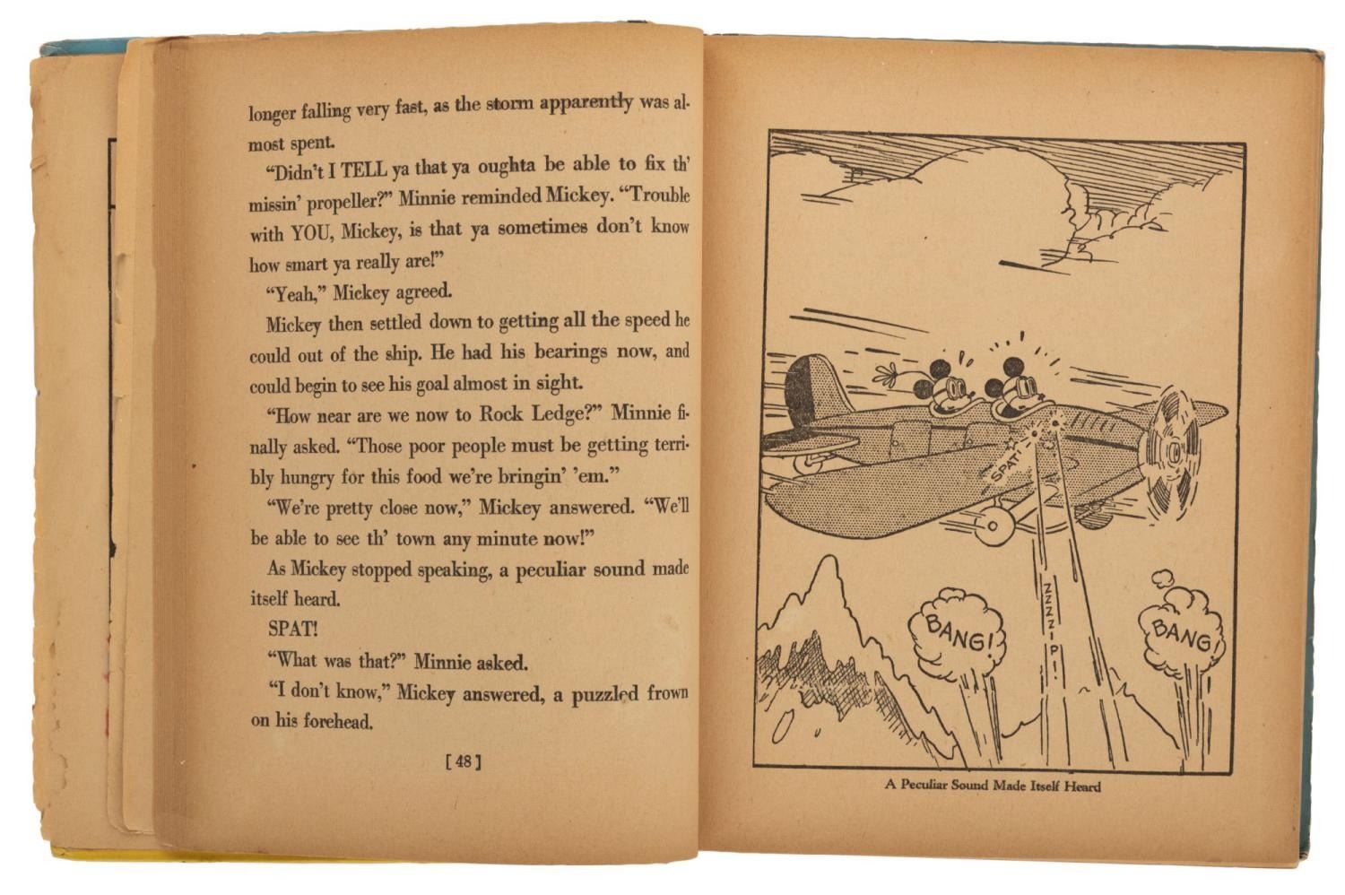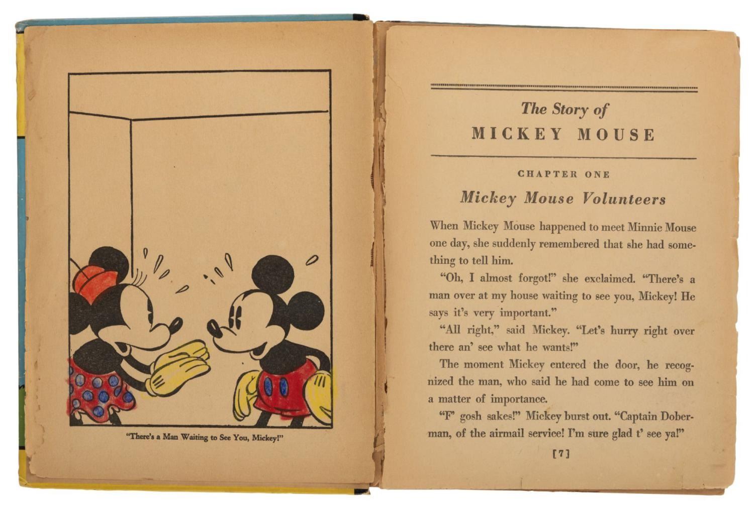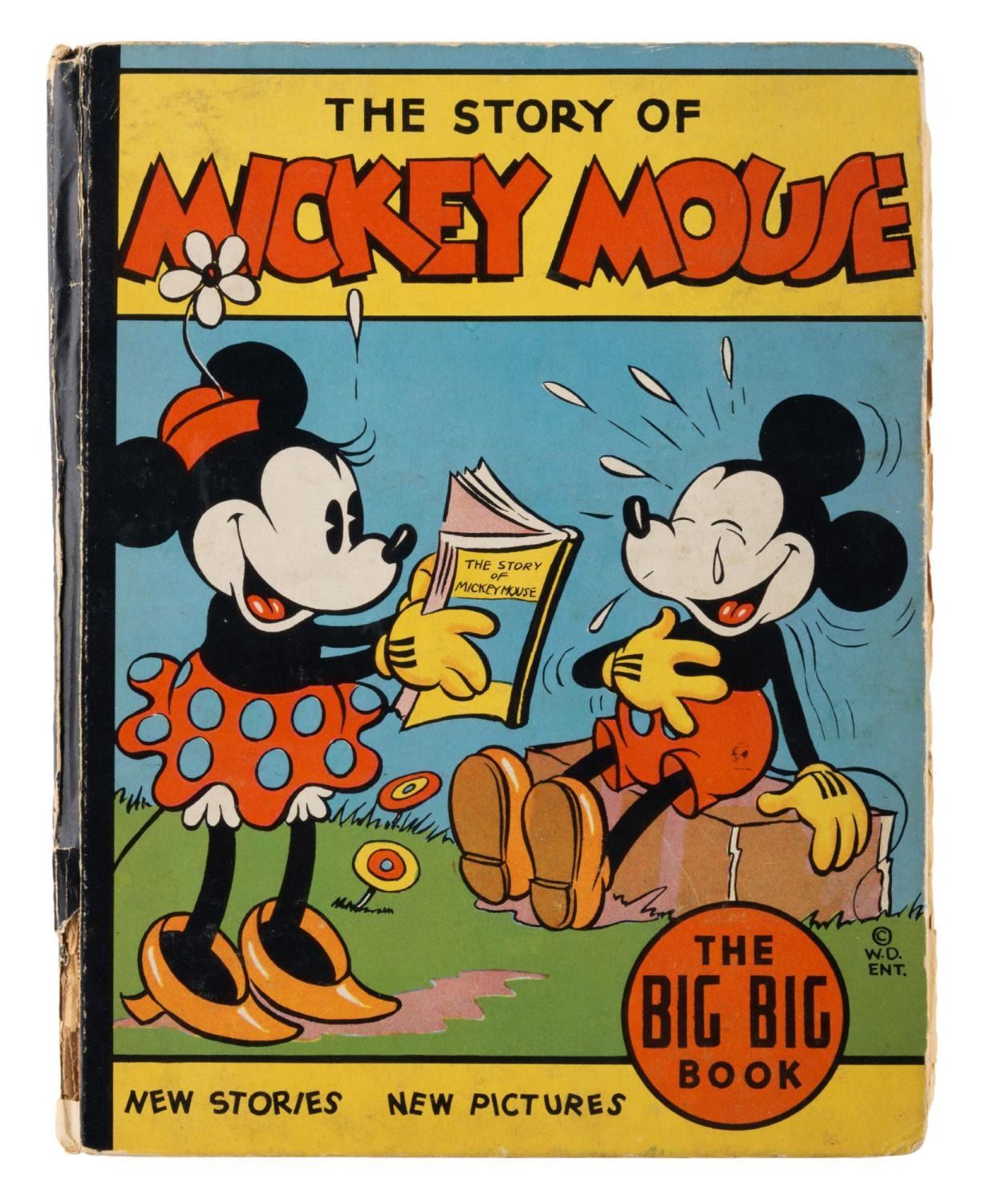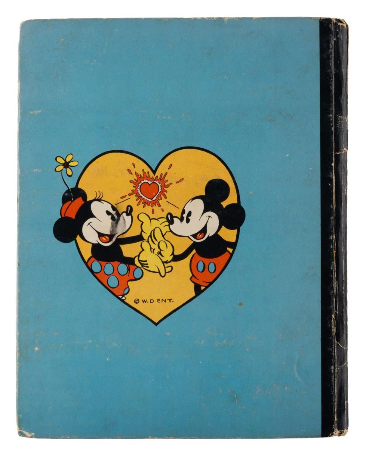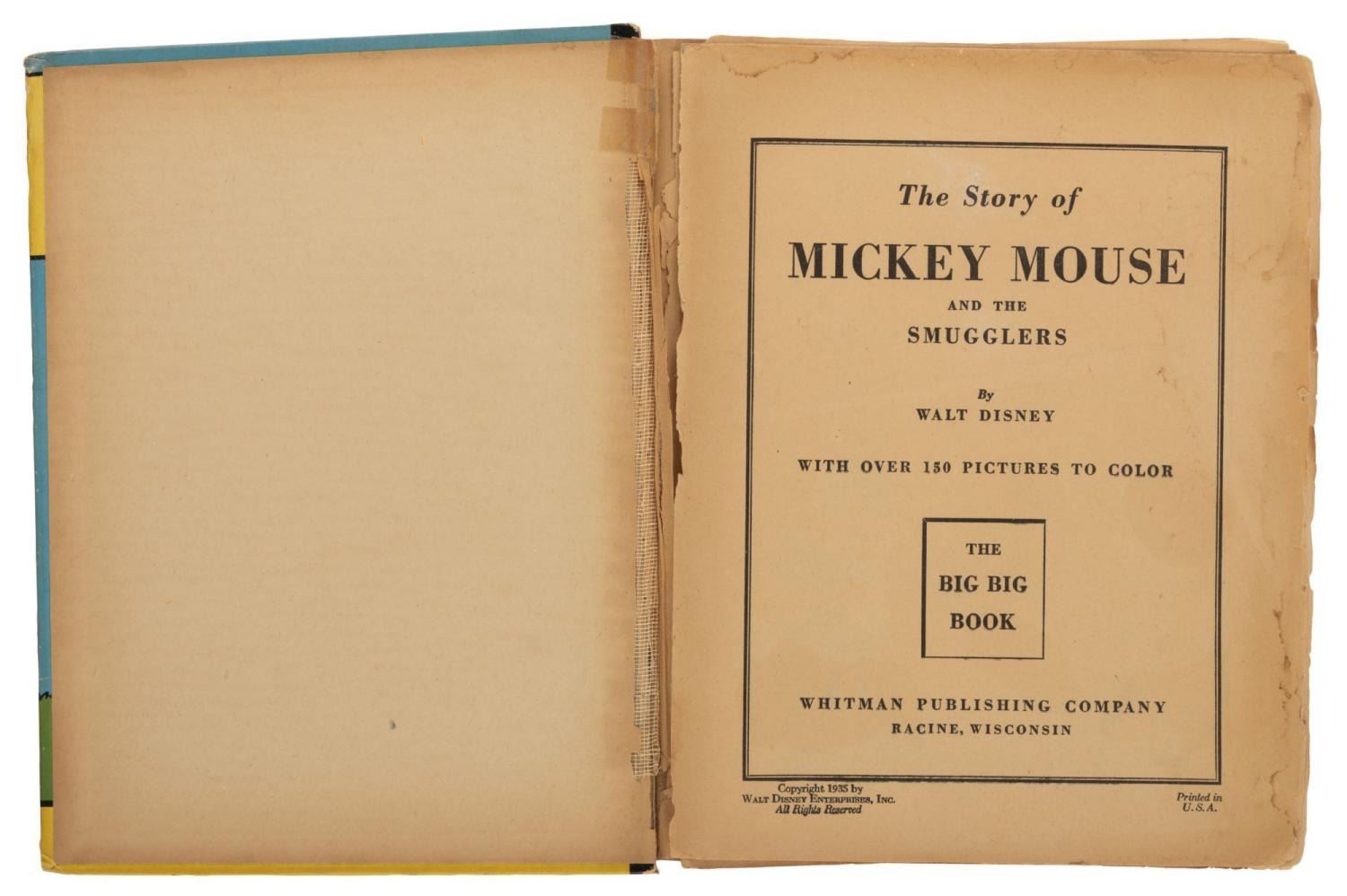 (Whitman, 1935) A hardcover The Story of Mickey Mouse, published by Whitman. The 317-page Big Big Book tells early stories of Mickey Mouse and his friends. Measuring 7.5" x 9.5", the book is in fair condition with heavy edge wear, split binding, loose pages, crayon coloring on one page, and discoloration.