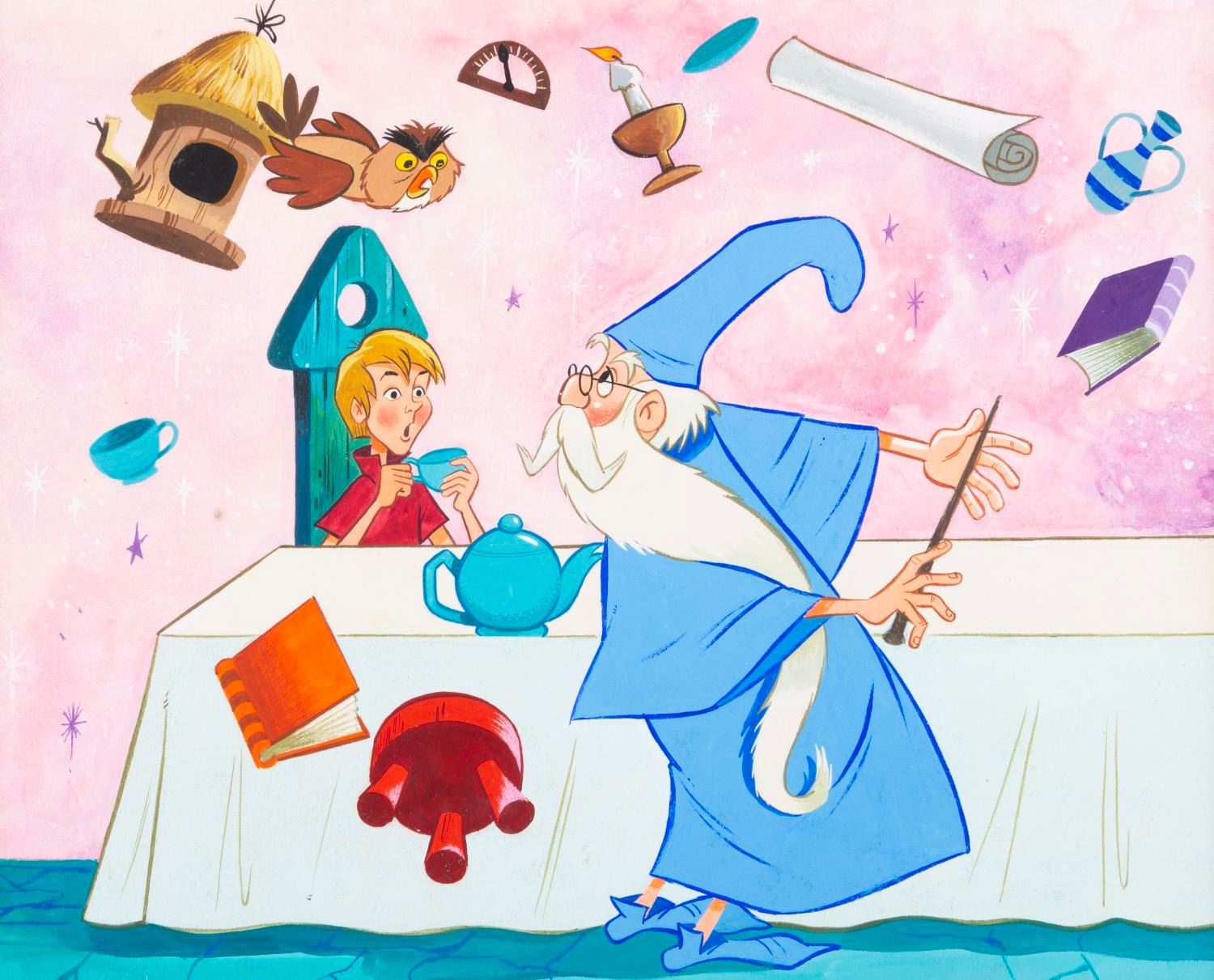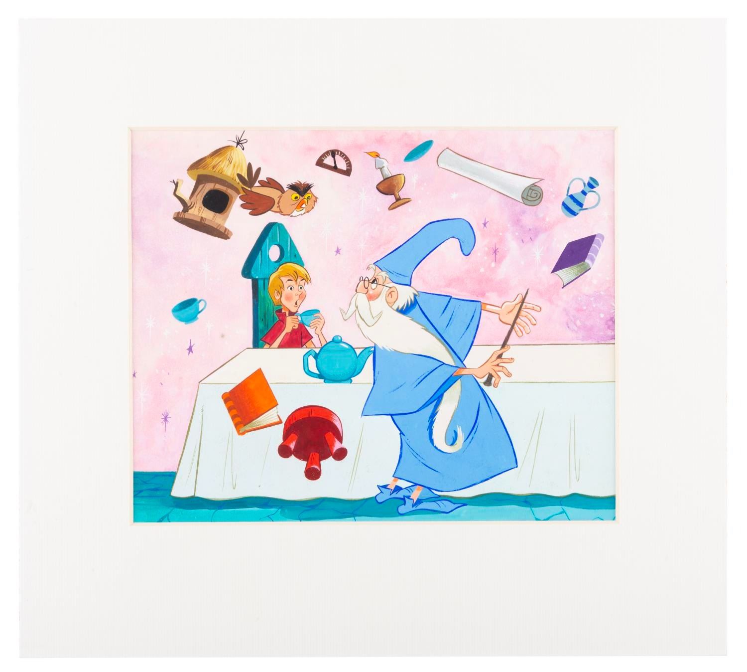 (Disney, 1970s-80s) An original painting of Merlin and Wort for a "The Sword and the Stone" book. Measuring 7" x 8.5" in an 11.5" x 12.75" matte, the painting is in very good condition with some spotting and light wear.