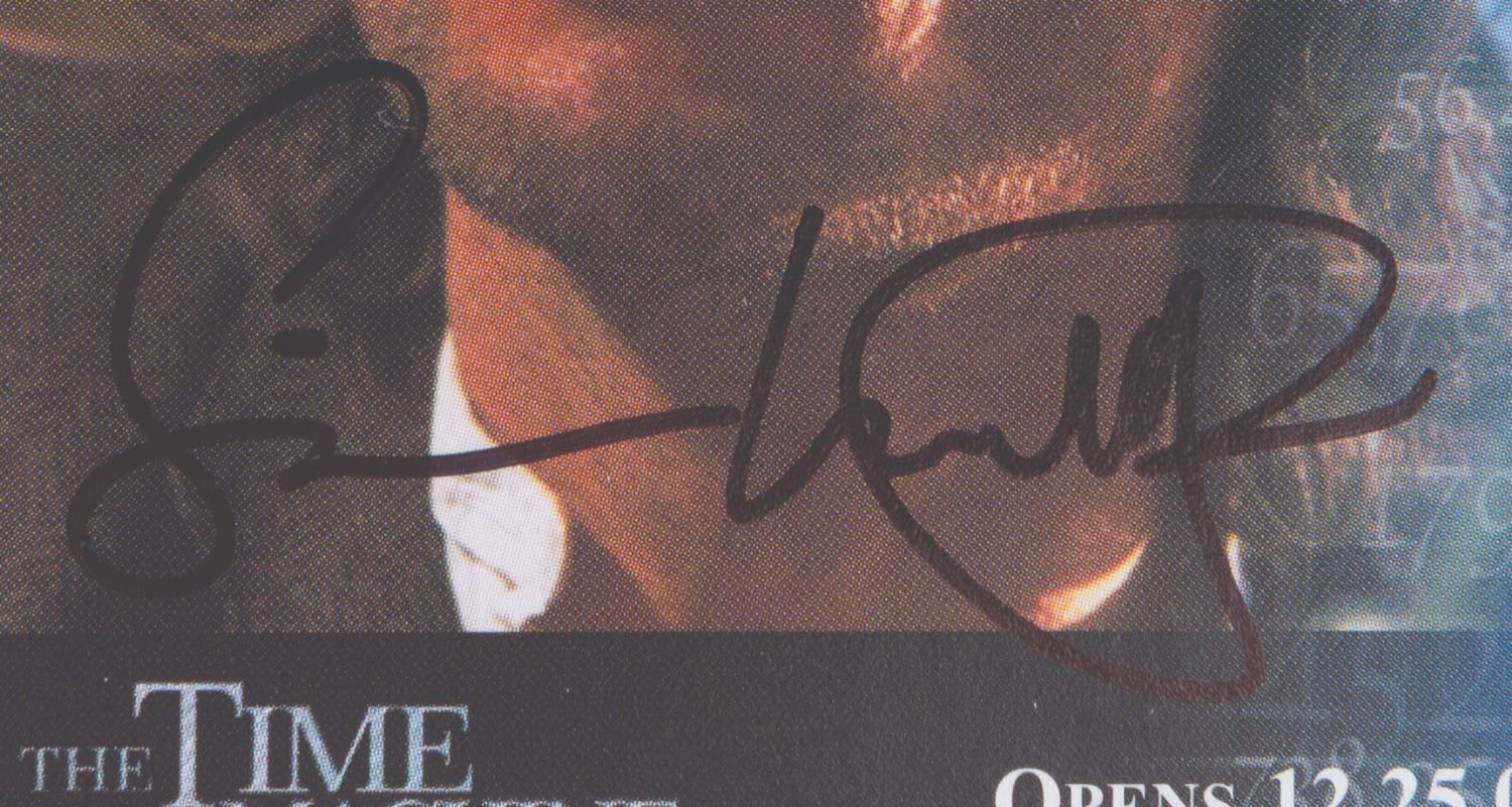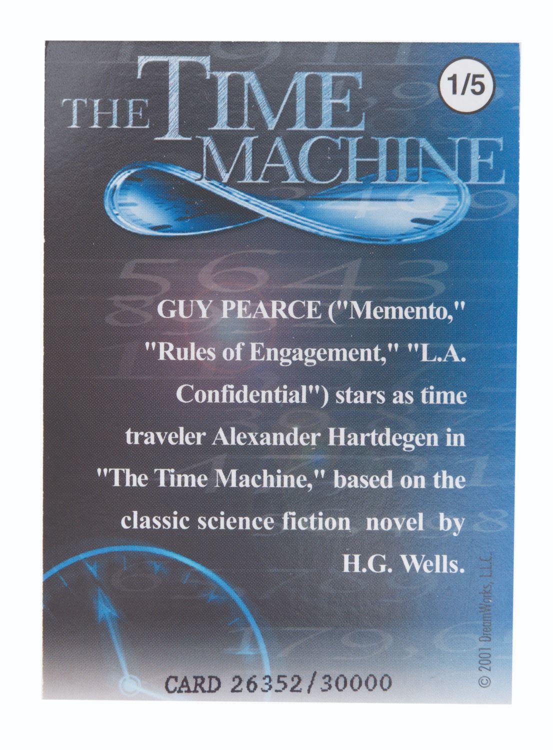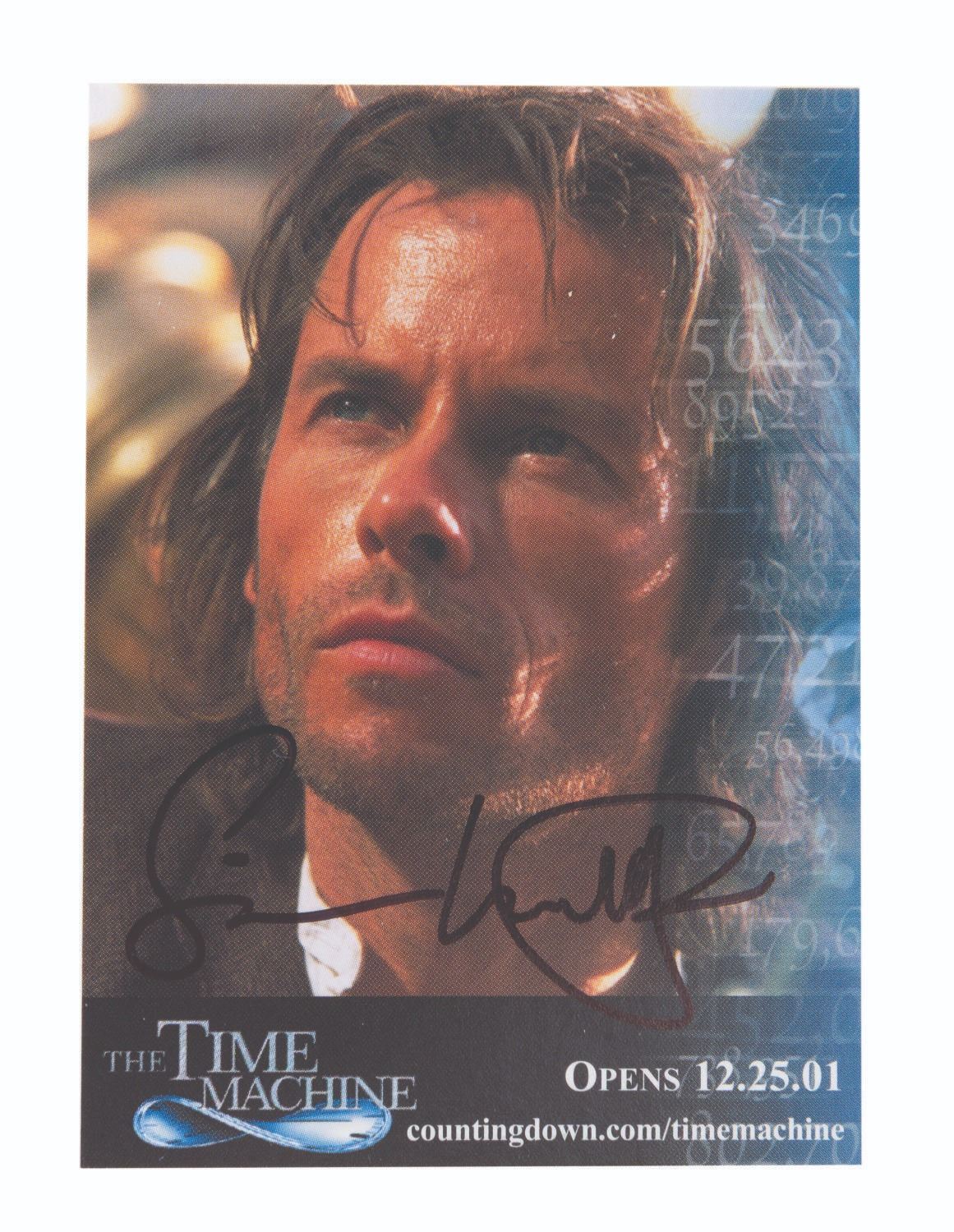 (DreamWorks, 2002) A "The Time Machine " pre-release trading card of Guy Pearce, signed by the film's director, Simon Wells, who is the great-grandson of novelist H.G. Wells. Measuring 2.5 " x 3.5 ", the signed card is in very good condition with light wear.